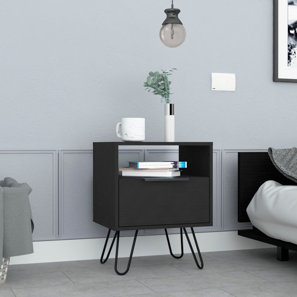 Begonia Nightstand, Shelf, Single Door Cabient, Hairpin Legs