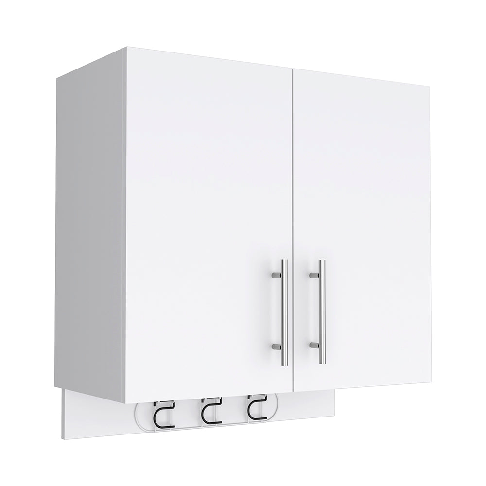 Organize your cleaning supplies with this Albany Cabinet Wall Mounted. This cabinet is ideal for any home with its sleek metal handles and stylish design. Its easy assembly makes it a breeze to attach to any wall, and the two-door cabinet protects your supplies while providing storage space inside. The bottom features three broom hangers, making it the perfect solution for organizing brooms and other cleaning tools. Designed with an elegant white manufactured wood finish.