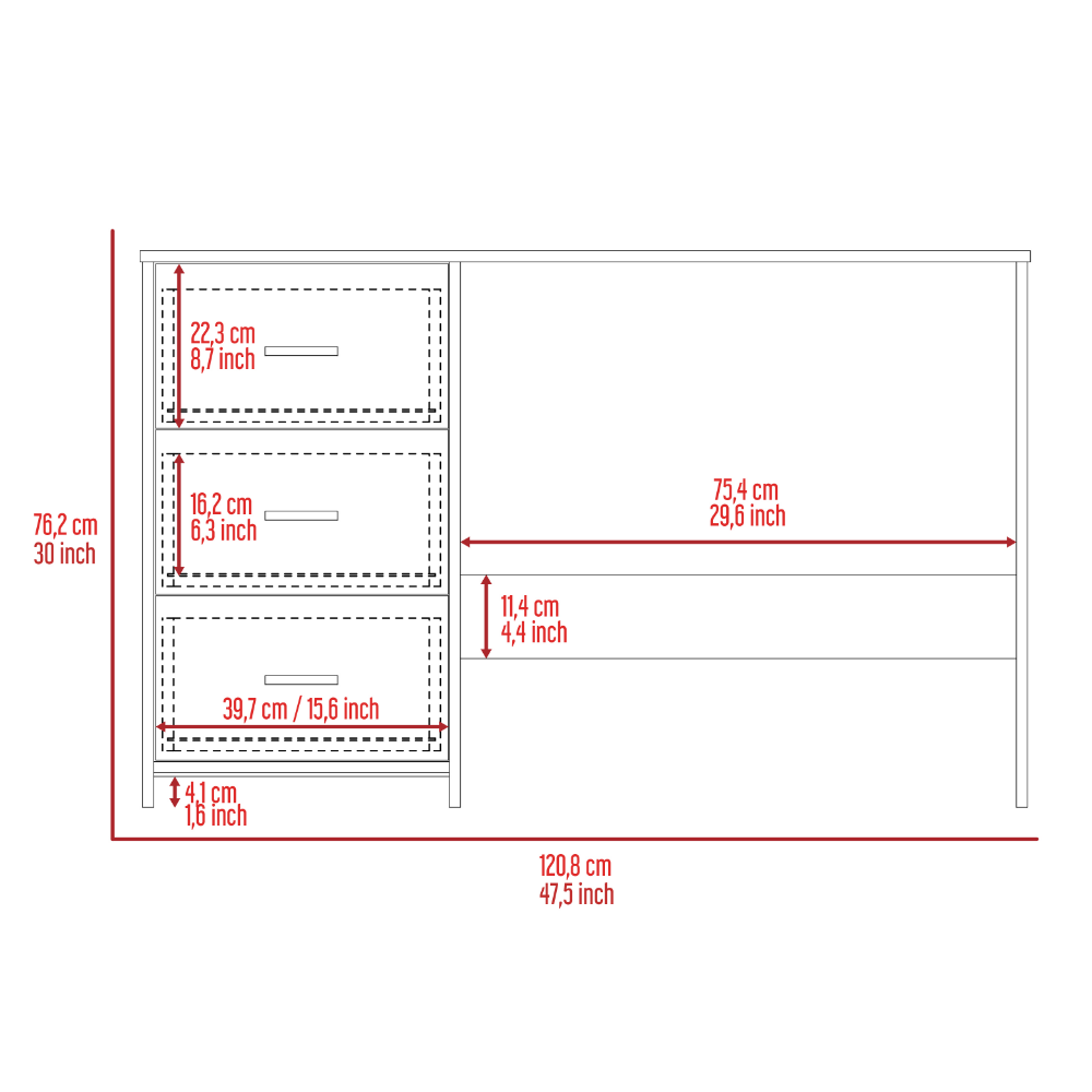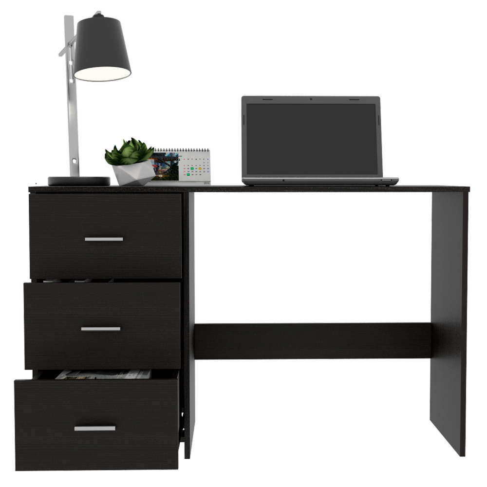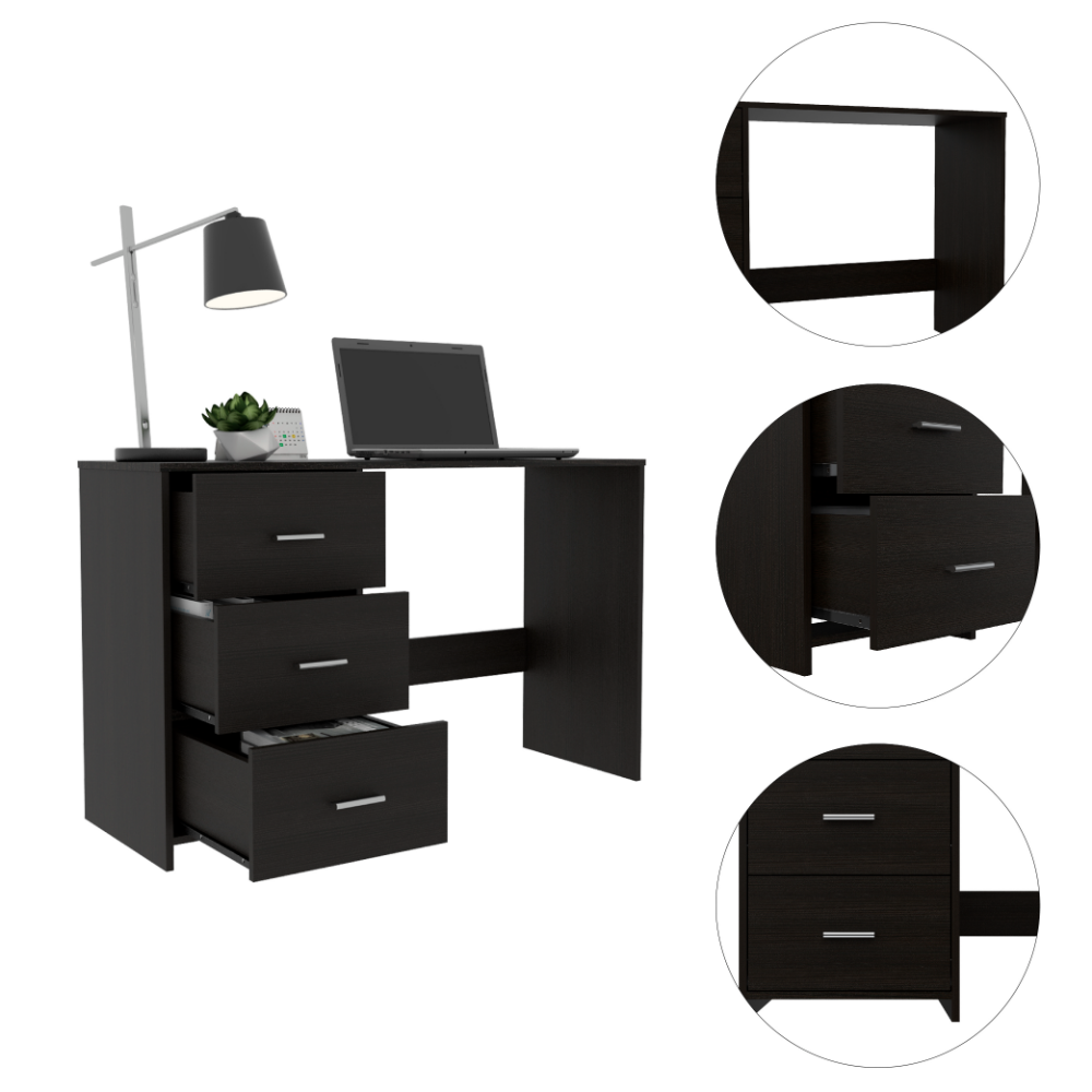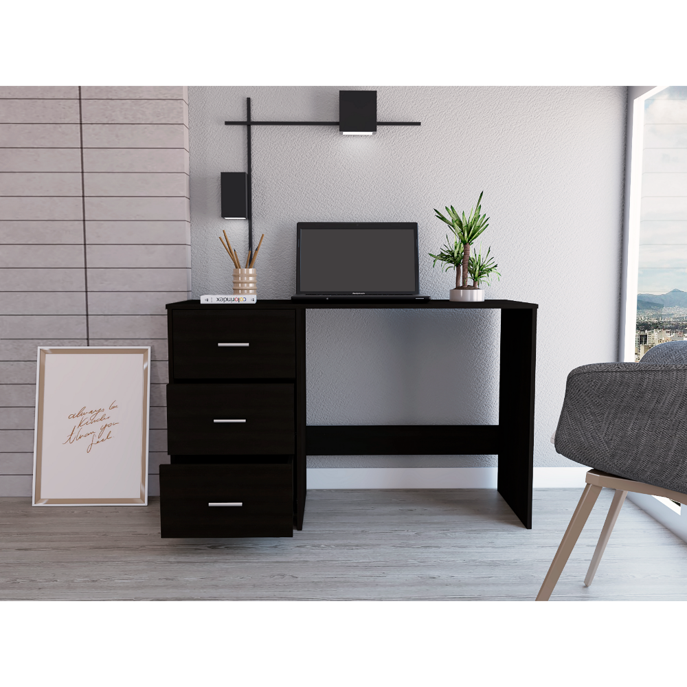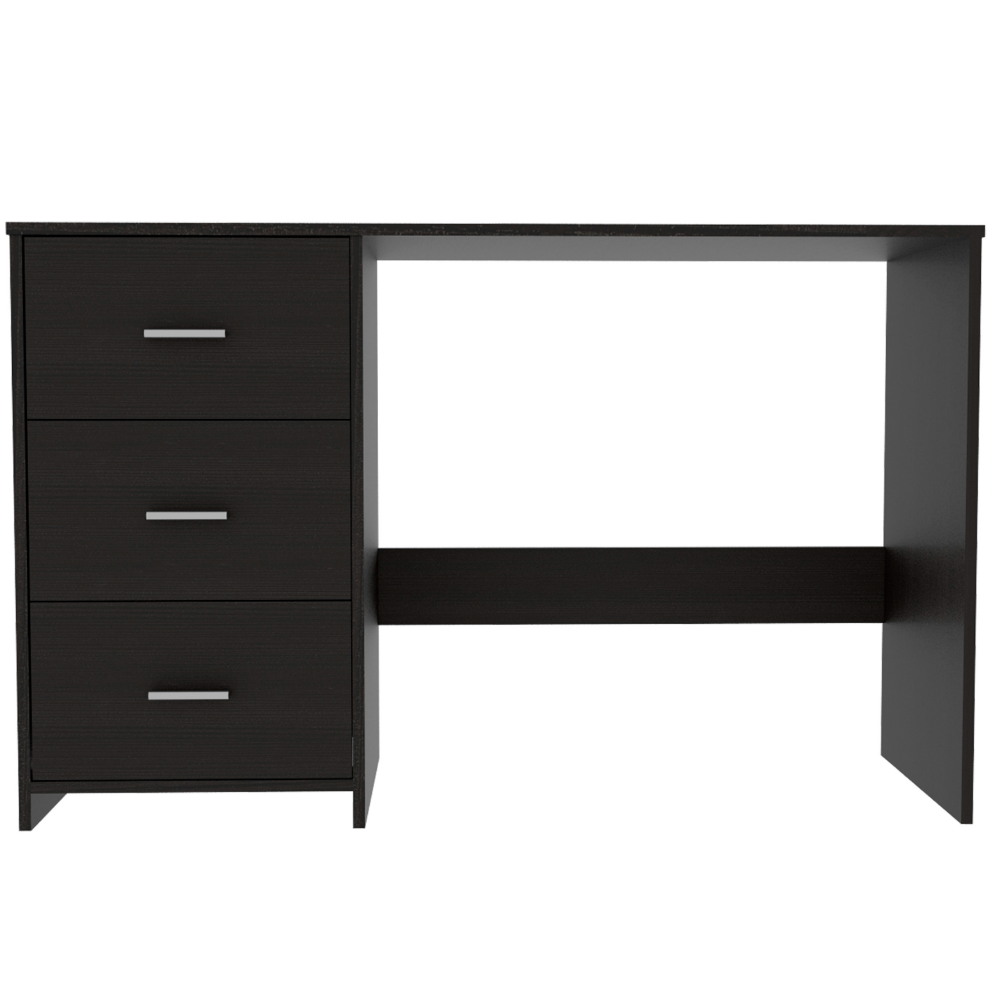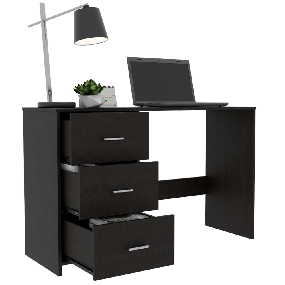 Azalea 3 Drawer computer Desk, whether you're working from home or just need a place to study, this desk is the perfect solution. It also is a great way to add some elegance to your workspace. Its work surface of 47.5 inches wide and 16.5 Inches deep will allow you to have laptops and monitors plus a good amount of space for keyboards and a mouse, also features three spacious drawers (15.6 inches W x 6.3 inches H) that will help you keep your files and documents in order. Designed with elegant black wengue manufactured wood finish.