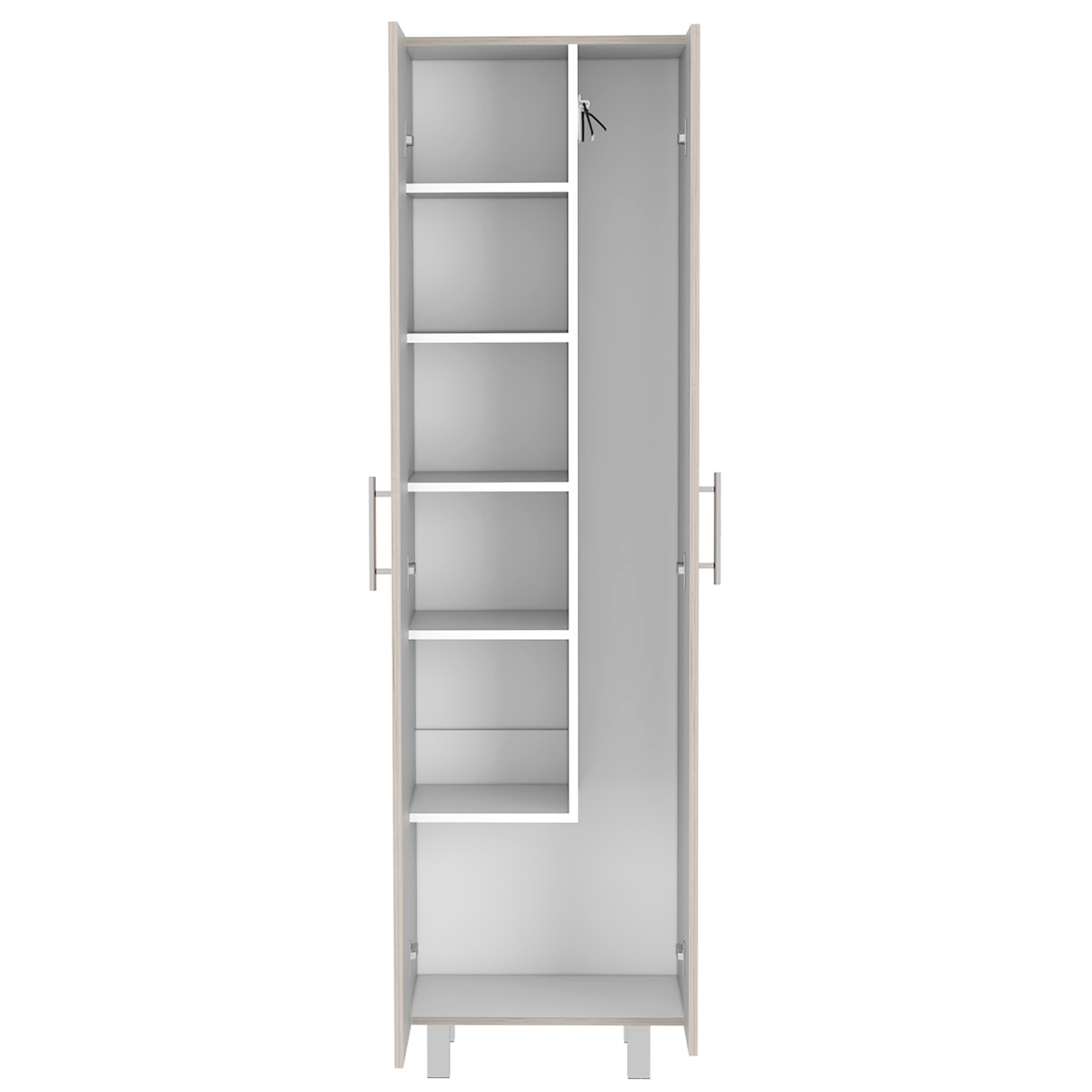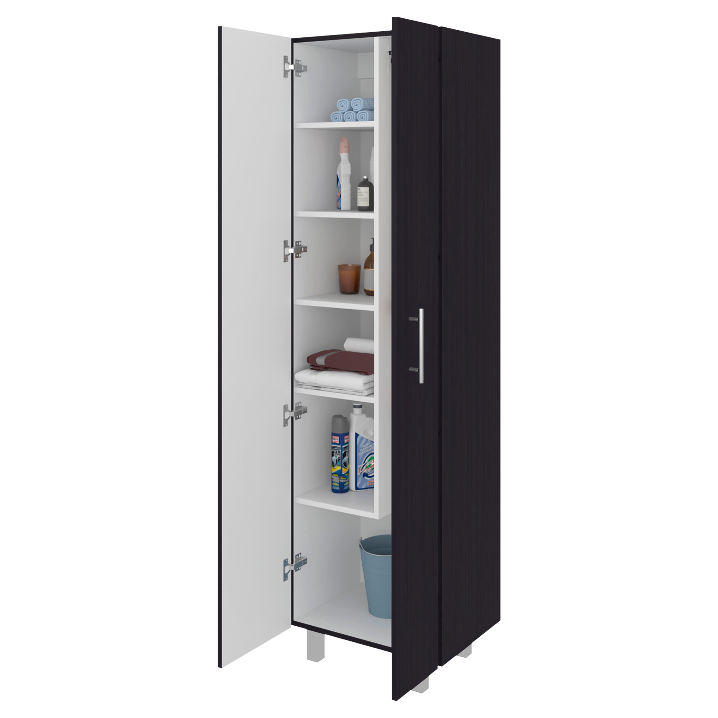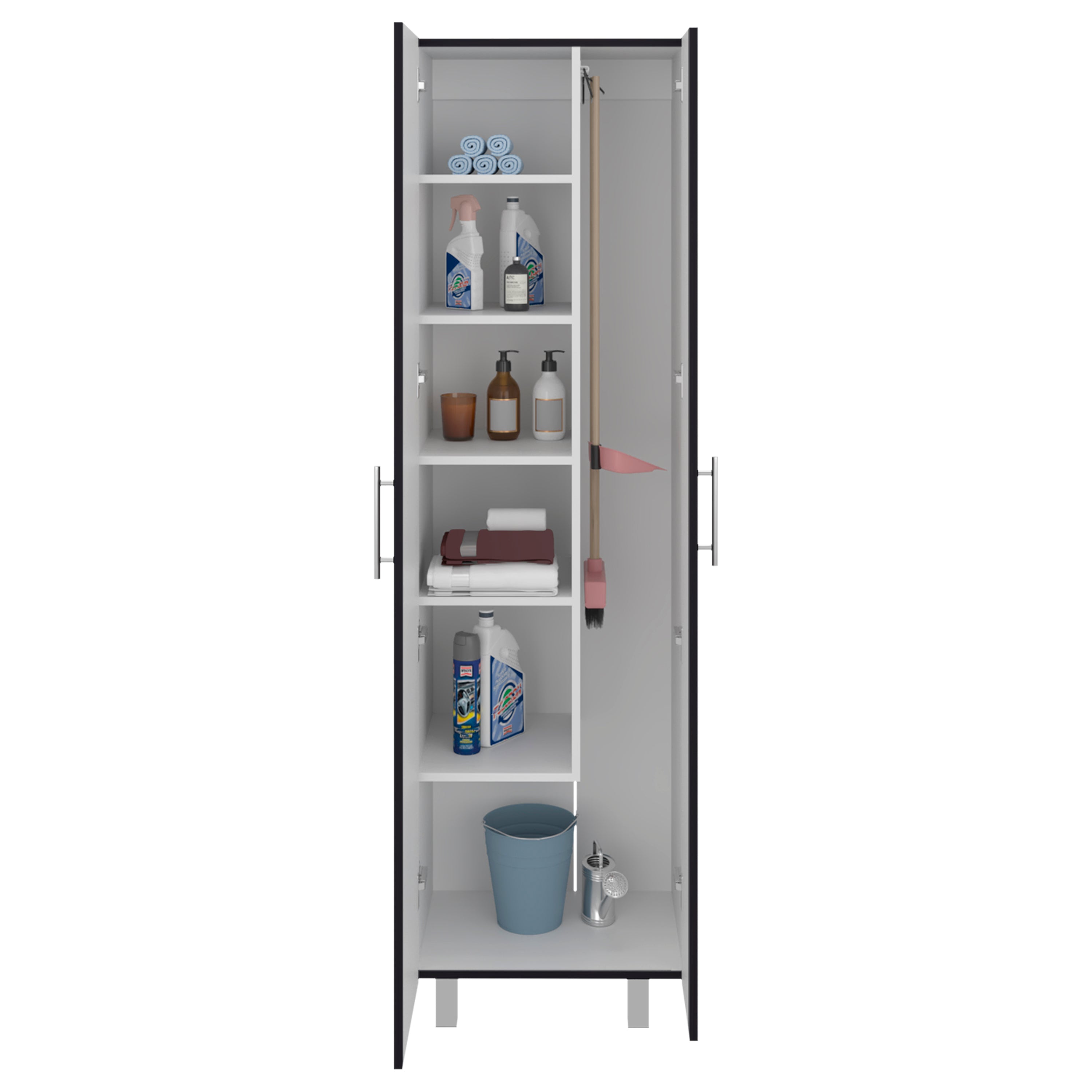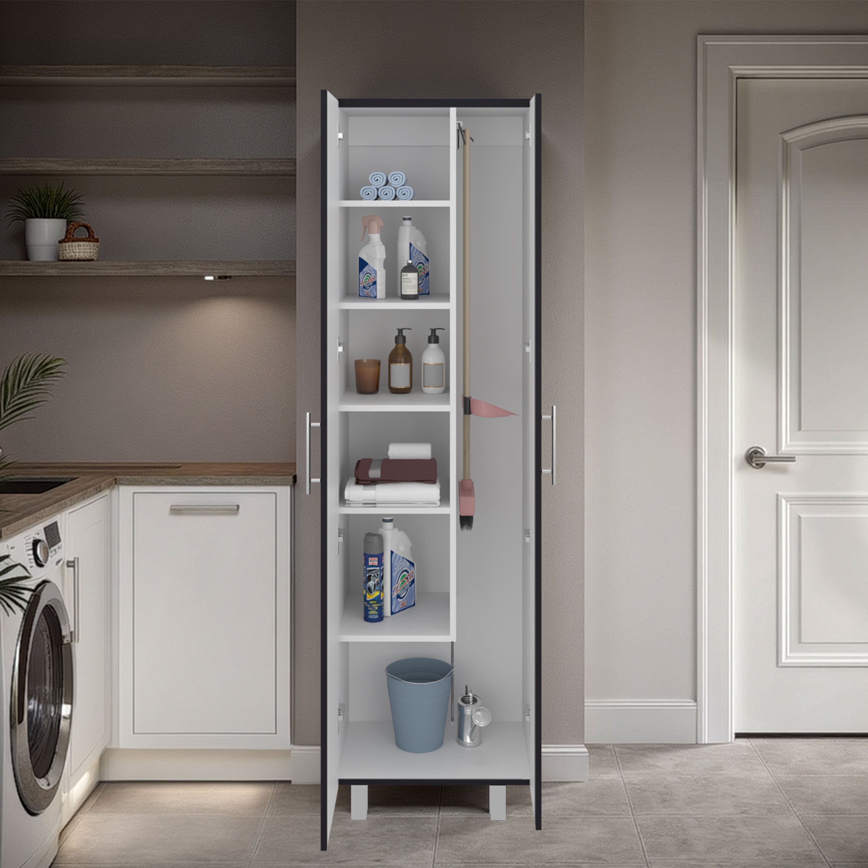 storage cabinet is specifically made for your cleaning supplies. Features two doors with metal hinges and handles, standing at 71.3 In High and 20.1 Inches wide. Inside you will find a 66.1 inches high x 7.3 inches wide space specially designed to store your broom and mop with a hanging rack to have them elevated and in the best condition possible; six different shelves, starting at the bottom with a 13.5-inch-high space that will be enough to store your buckets and bigger cleaning supplies. You will also find another five different shelves in different sizes for the rest of your cleaning supplies. With this product, you will save a lot of space in your kitchen and garage and have the perfect solution for concealed storage. Designed with elegant Light Grey / White, Black Wengue / White manufactured wood.