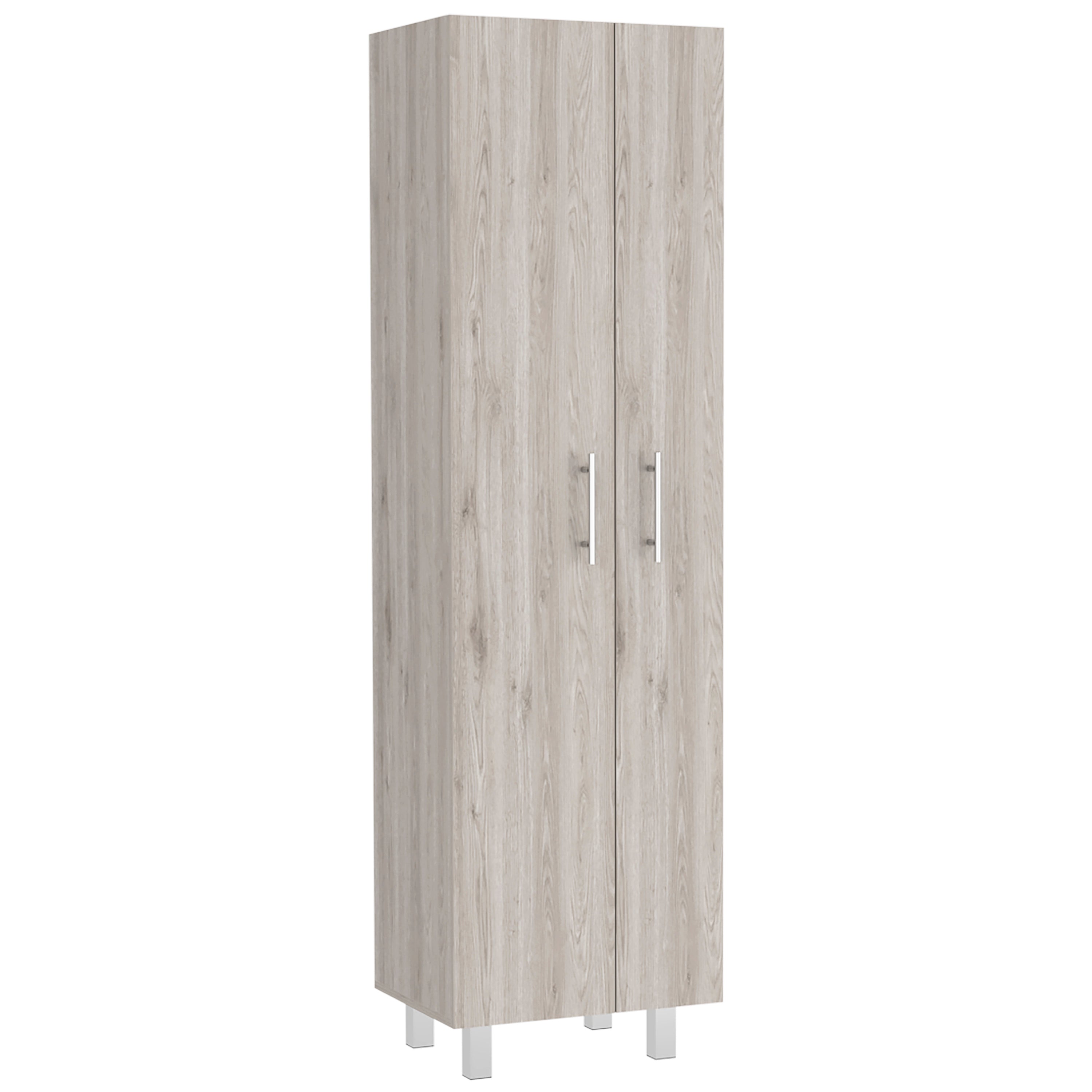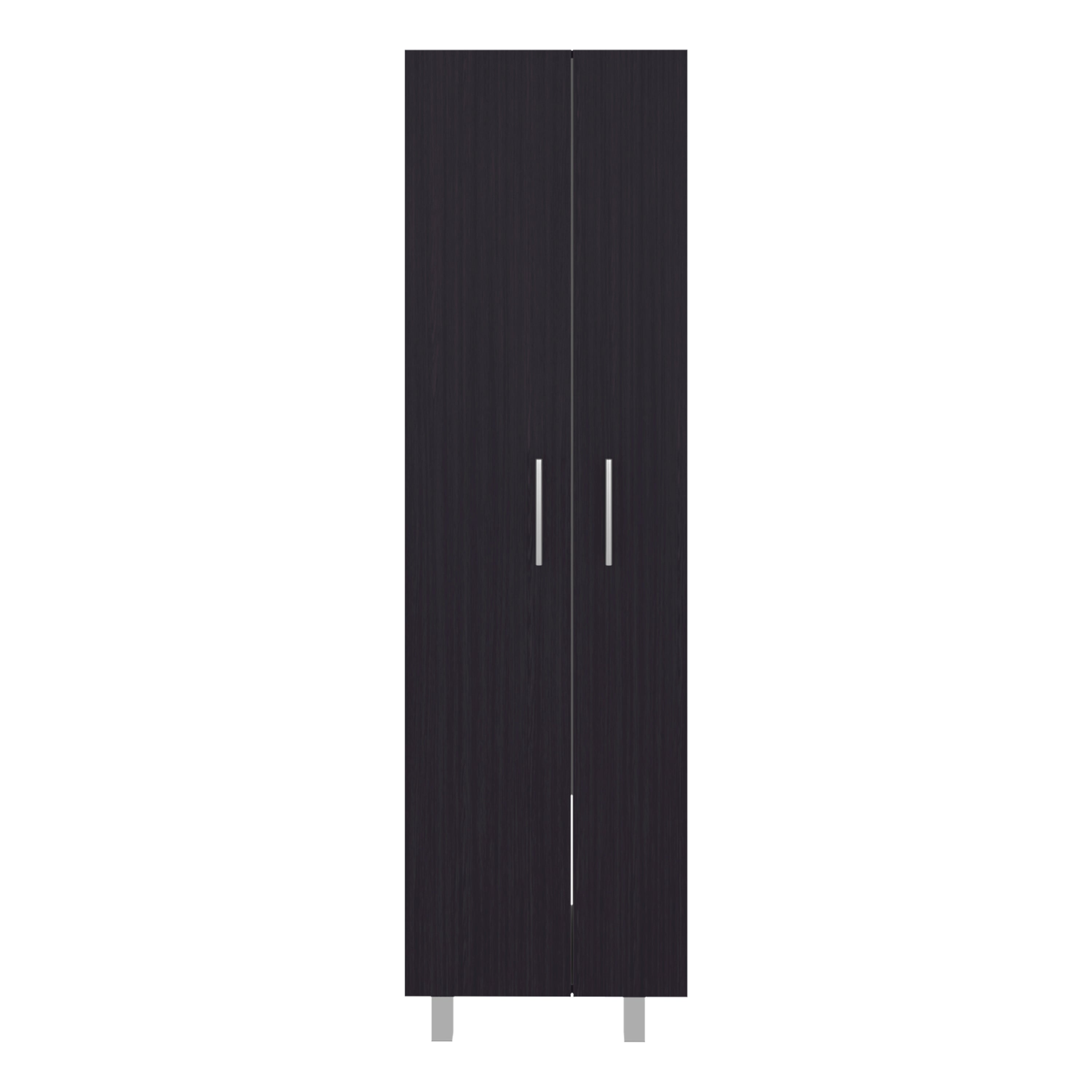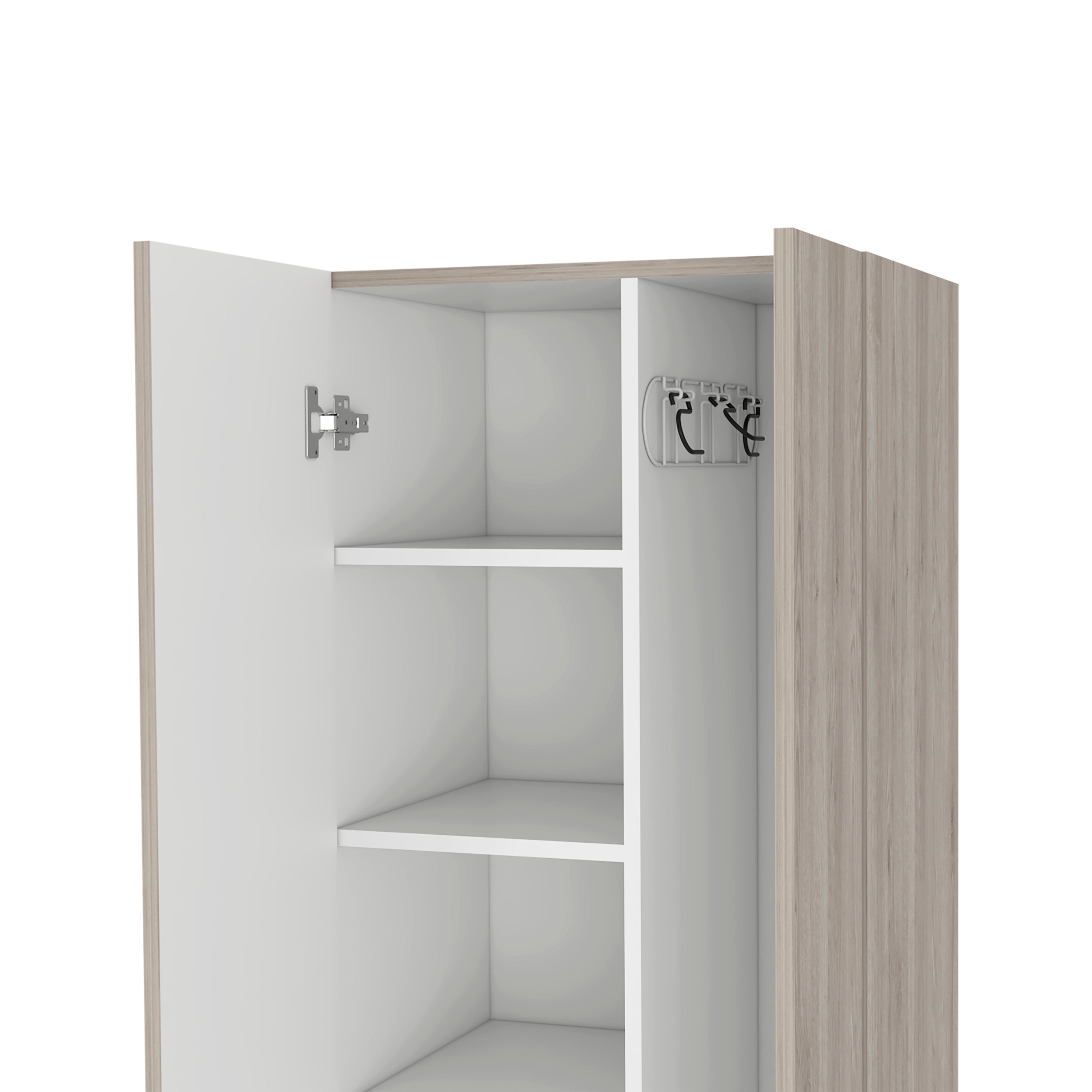 storage cabinet is specifically made for your cleaning supplies. Features two doors with metal hinges and handles, standing at 71.3 In High and 20.1 Inches wide. Inside you will find a 66.1 inches high x 7.3 inches wide space specially designed to store your broom and mop with a hanging rack to have them elevated and in the best condition possible; six different shelves, starting at the bottom with a 13.5-inch-high space that will be enough to store your buckets and bigger cleaning supplies. You will also find another five different shelves in different sizes for the rest of your cleaning supplies. With this product, you will save a lot of space in your kitchen and garage and have the perfect solution for concealed storage. Designed with elegant Light Grey / White, Black Wengue / White manufactured wood.