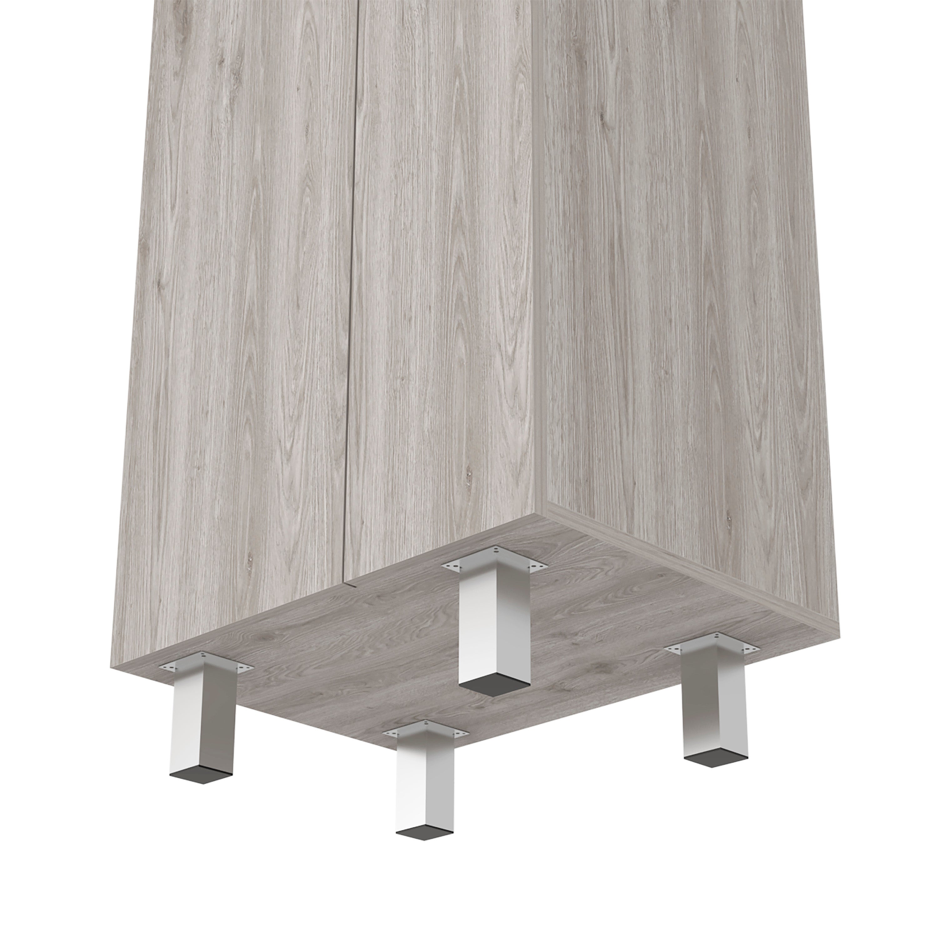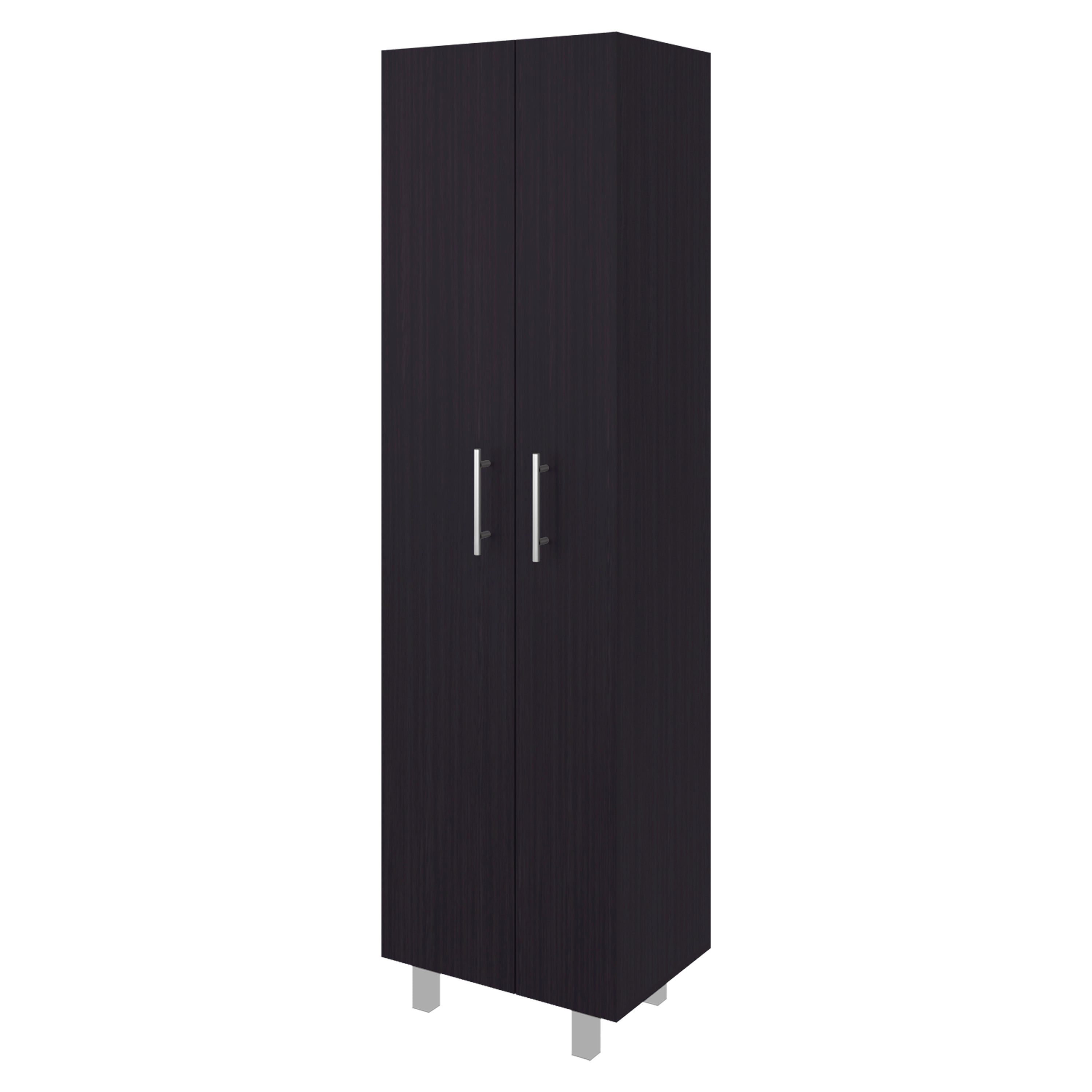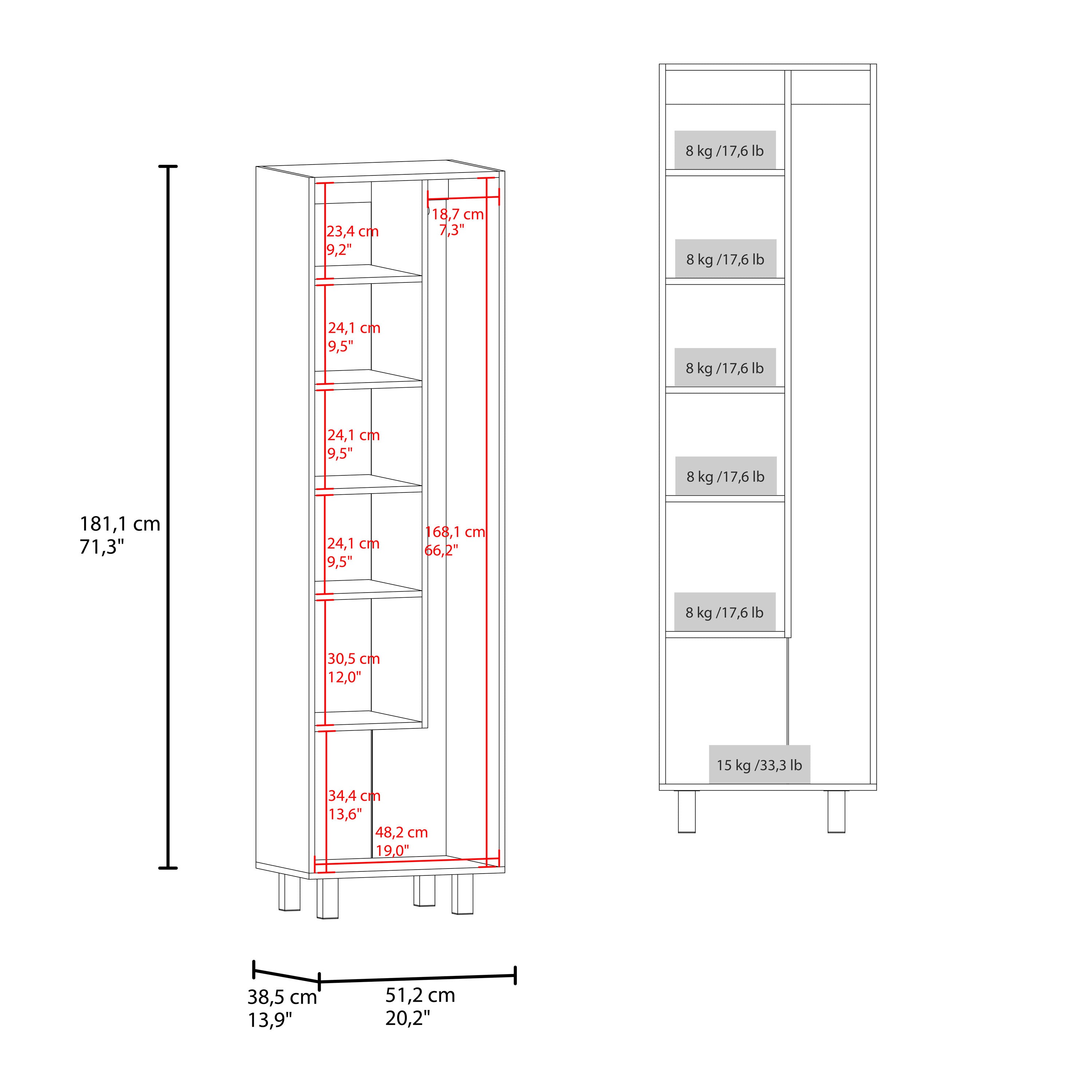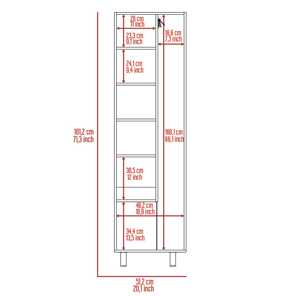 storage cabinet is specifically made for your cleaning supplies. Features two doors with metal hinges and handles, standing at 71.3 In High and 20.1 Inches wide. Inside you will find a 66.1 inches high x 7.3 inches wide space specially designed to store your broom and mop with a hanging rack to have them elevated and in the best condition possible; six different shelves, starting at the bottom with a 13.5-inch-high space that will be enough to store your buckets and bigger cleaning supplies. You will also find another five different shelves in different sizes for the rest of your cleaning supplies. With this product, you will save a lot of space in your kitchen and garage and have the perfect solution for concealed storage. Designed with elegant Light Grey / White, Black Wengue / White manufactured wood.