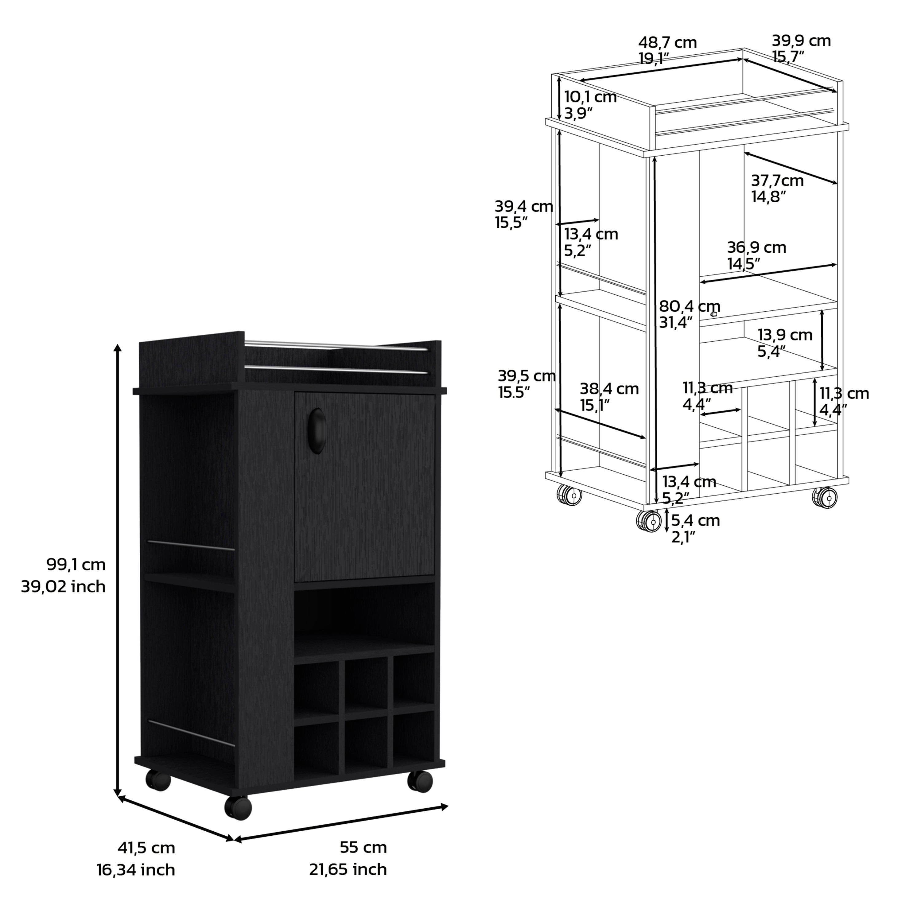 The Fraser Bar Cart is the ultimate addition to your home bar setup! With its sleek design and versatile functionality, this stylish bar cart is perfect for entertaining guests and displaying your favorite spirits collection. Available in a range of colors, including white, light gray, and black, this elegant bar cart is designed with high-quality white manufactured wood that will complement any home decor. Equipped with casters for easy mobility, you can effortlessly move this cart from room to room, ensuring you always have access to your favorite drinks. The Fraser Bar Cart features 6 built-in wine racks (4,4"), a single-door cabinet, and an ample upper surface (21,65"W X 16,34"D), providing plenty of storage space for all your bar essentials and two side open shelves. Upgrade your home bar game with the Fraser Bar Cart today!