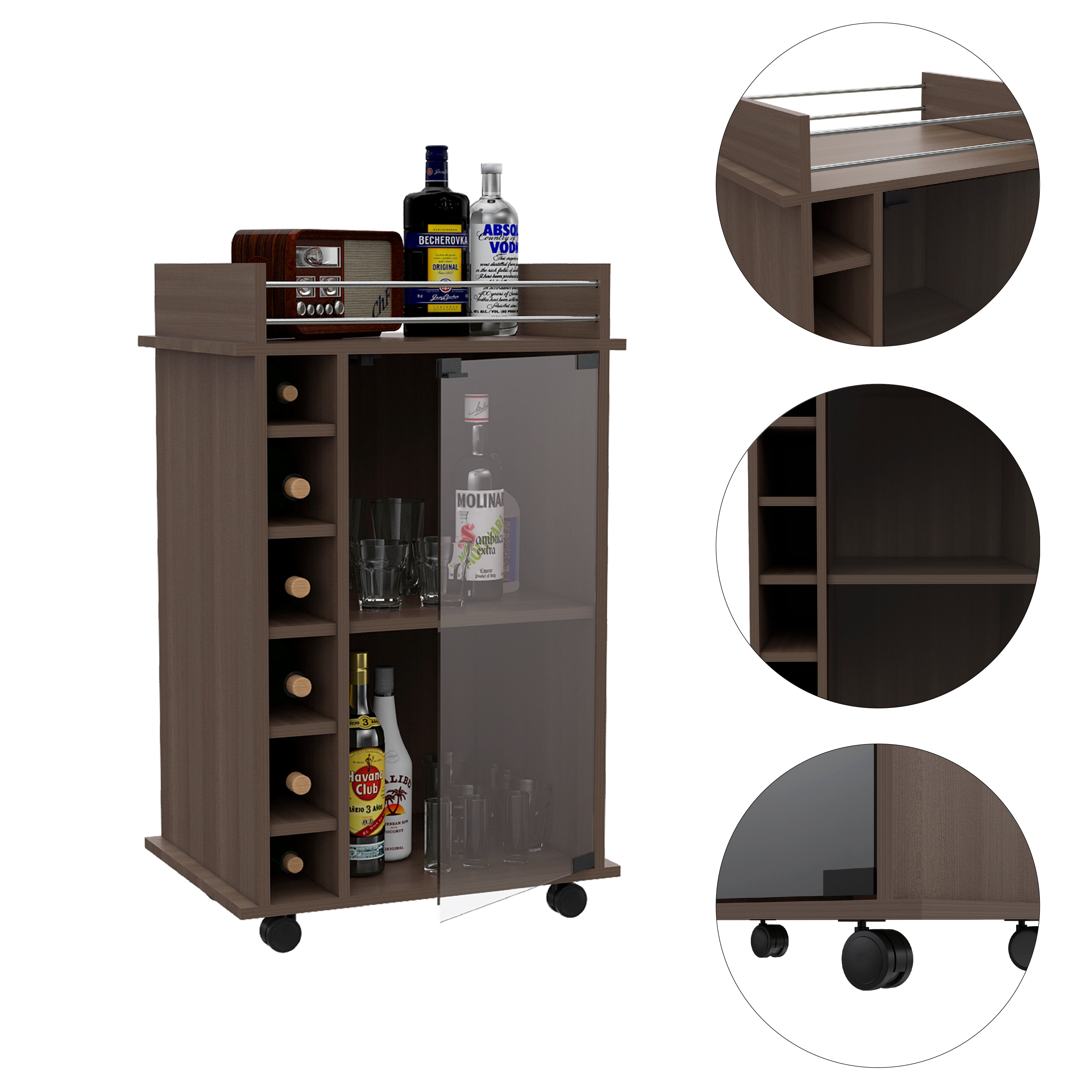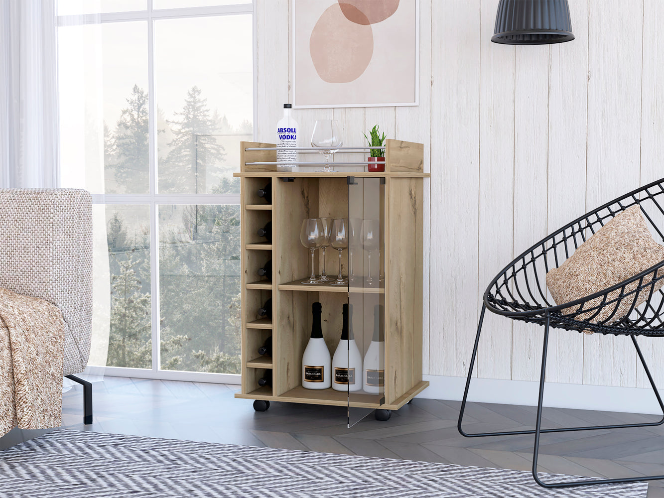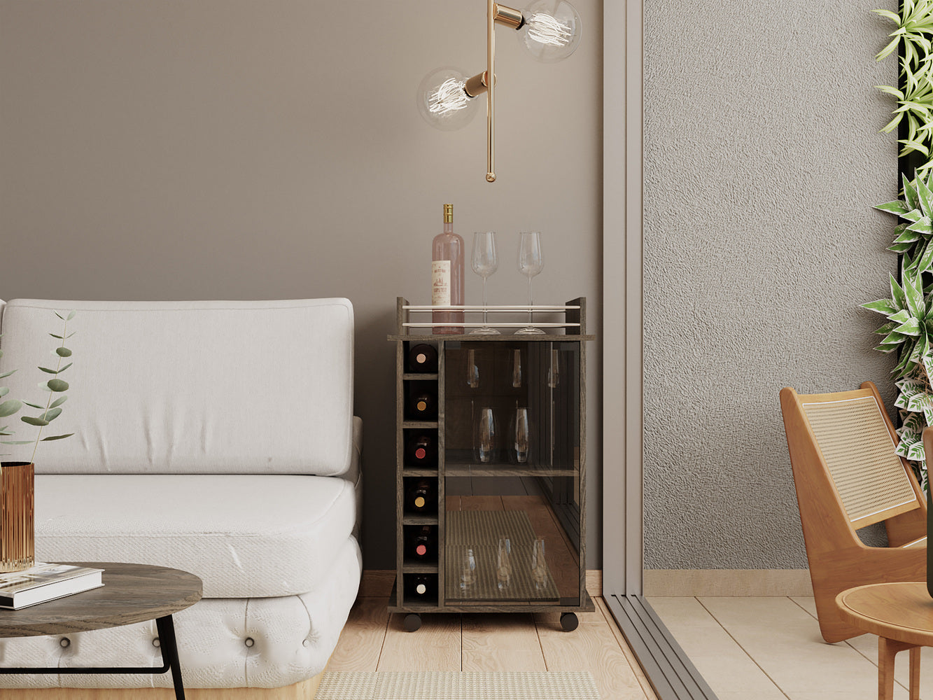 The Huali Bar Cart sharing with your friends a drink will always be a pleasure. The perfect bar cabinet is waiting for you. It features a beautiful glass door cabinet with two internal shelves, including six liquor bottle cubbies, wheels with a locking mechanism, spacious top surface with a metal rail. Designed with elegant Carbon Espresso, Black Wengue, Light Oak, Light Grey, Smokey Oak, and White manufactured wood finish.