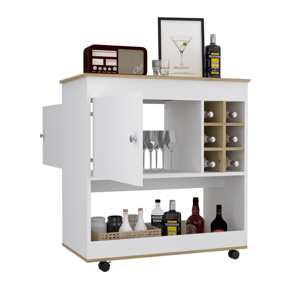 Lotus Bar Cart, Six Bottle Cubbies, One Cabinet, Four Casters