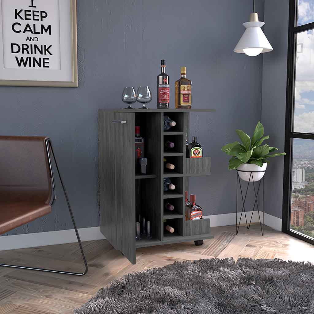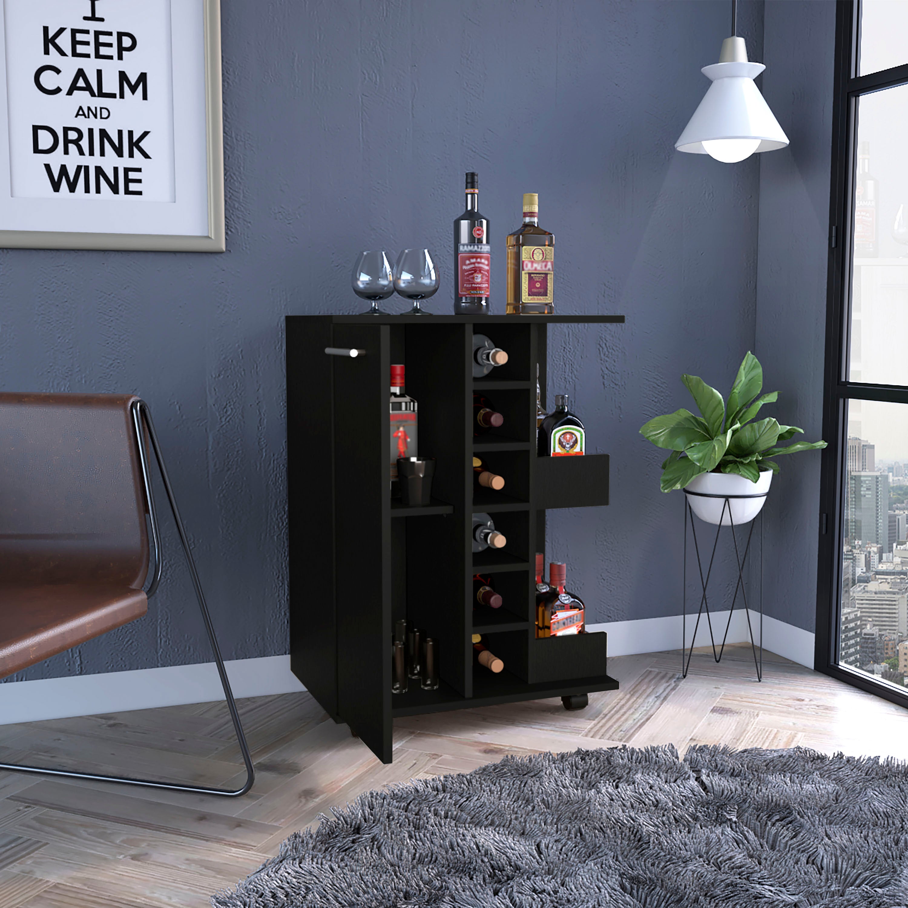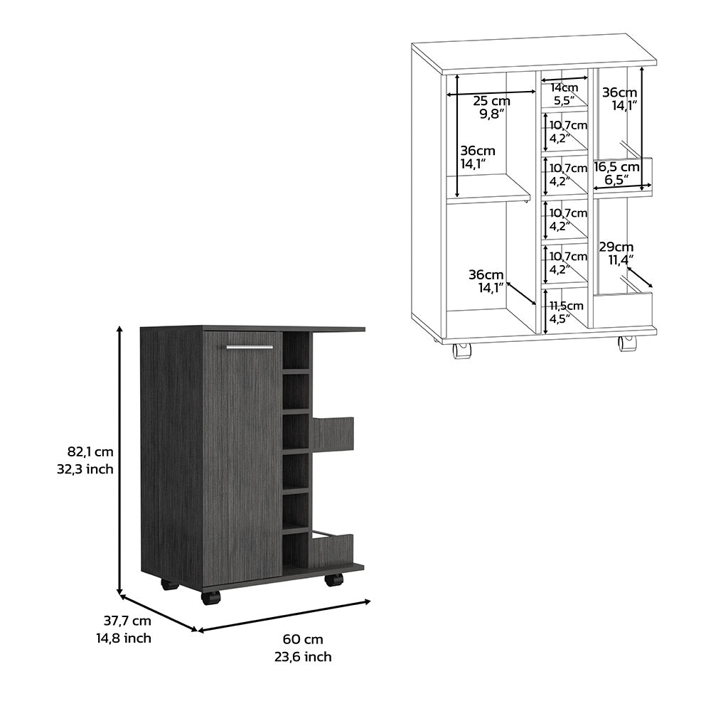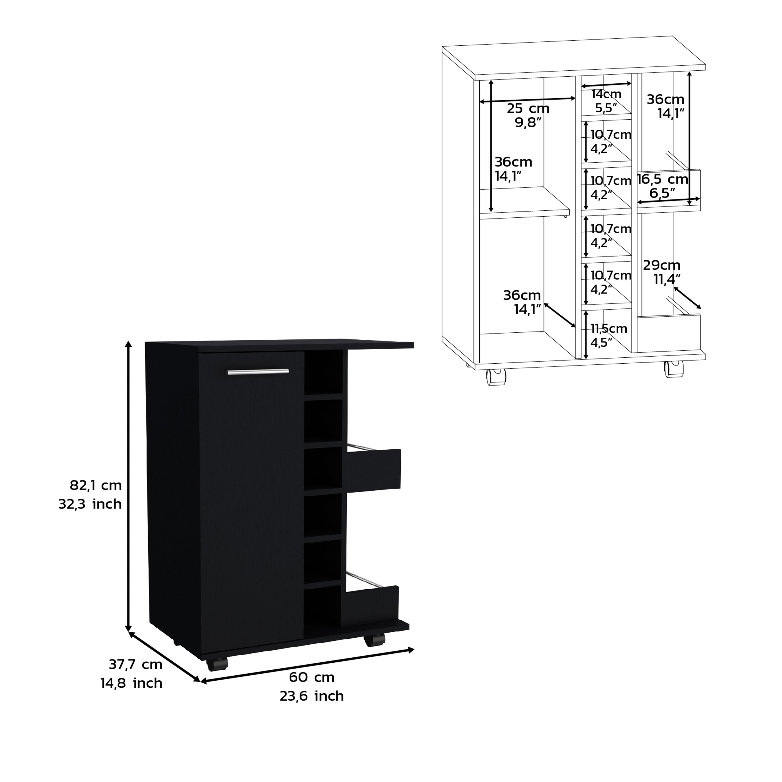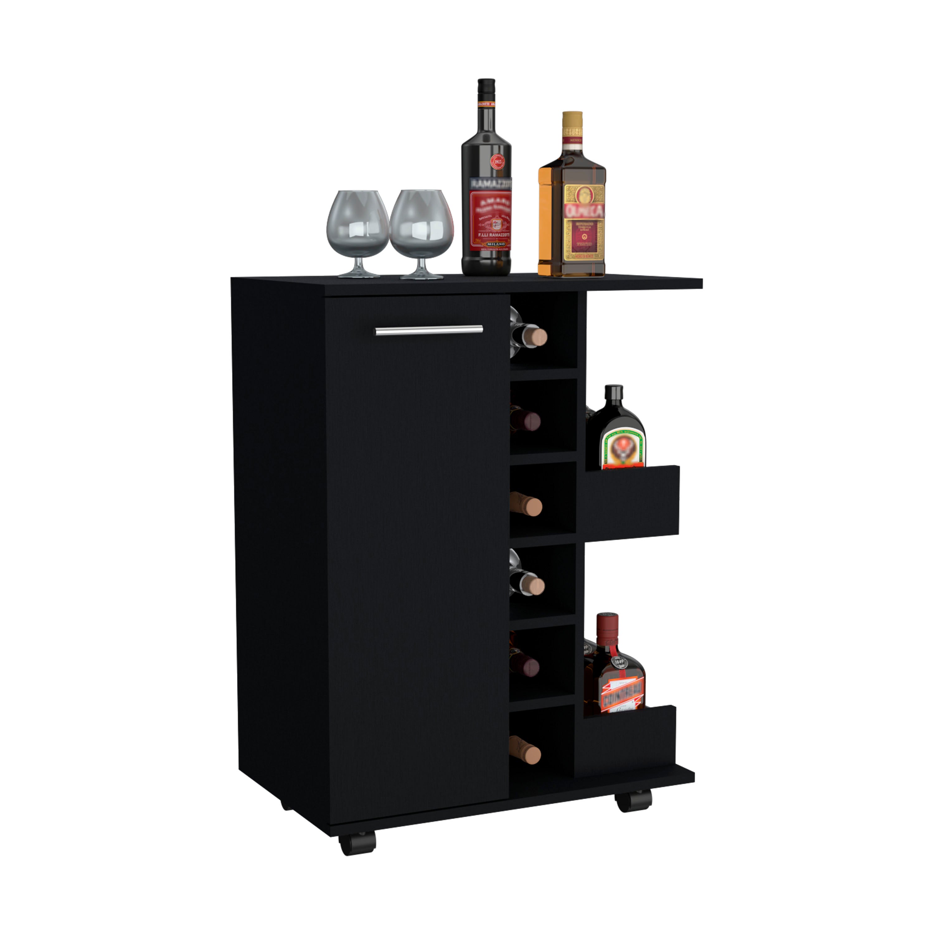 Magda Bar Cart, Four Casters, Six Built-in Wine Rack, Single Door Cabinet, Two External Shelves