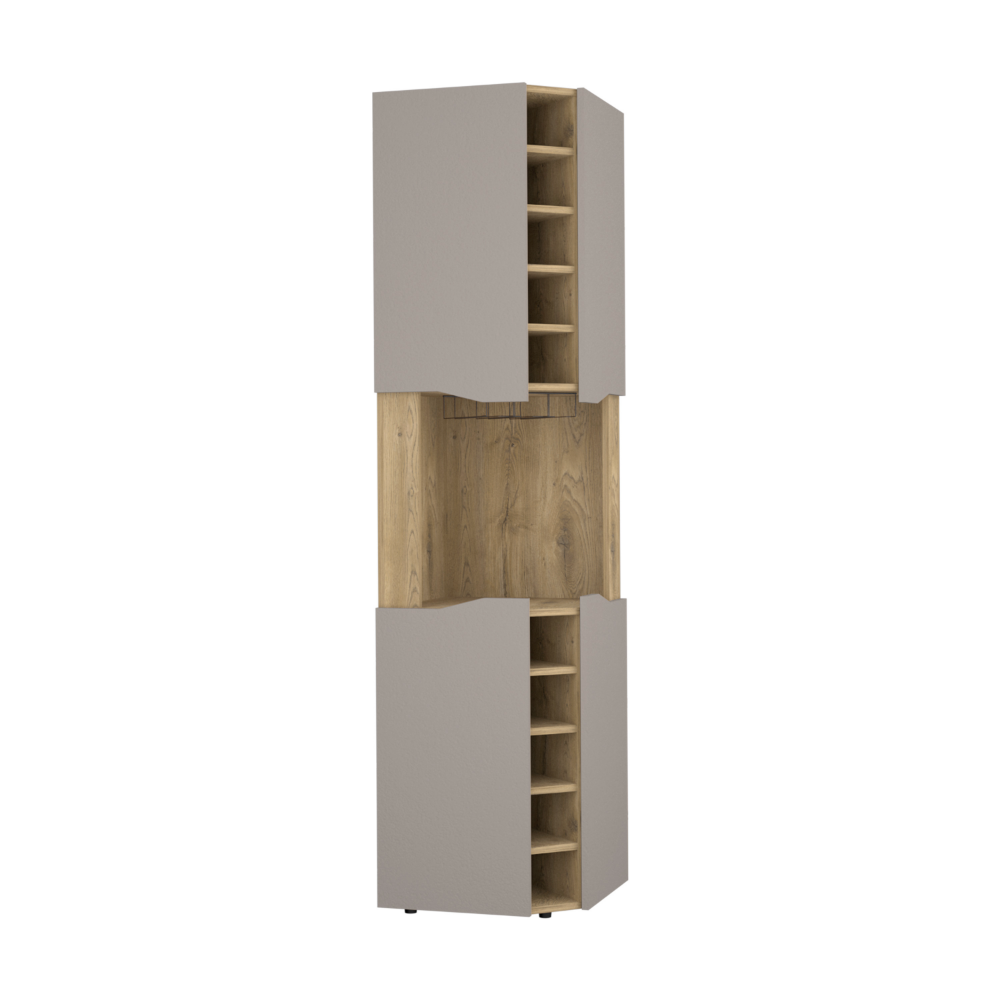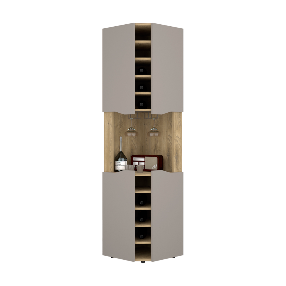 Mecca Corner Bar Cabinet, add some luxury to your home bar with this exquisite Mecca Corner Bar Cabinet. Featuring a beautiful finish, this bar is sure to be the envy of all your friends. This piece has ample storage capacity with ten wine cubbies (4,2''H X 4,4''D), a cup rack, a superior-top (17,7''W X 17,7''D), and other bar supplies is a must-have for any serious home bartender. With ideal dimensions, it is perfect for the final touch that your home needs! Designed with elegant macadamia-taupe manufactured wood finish.