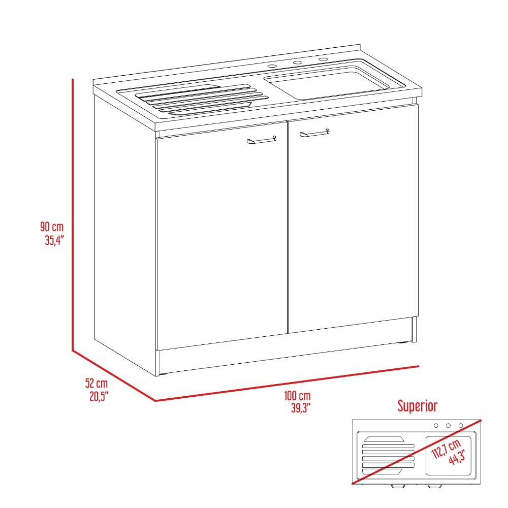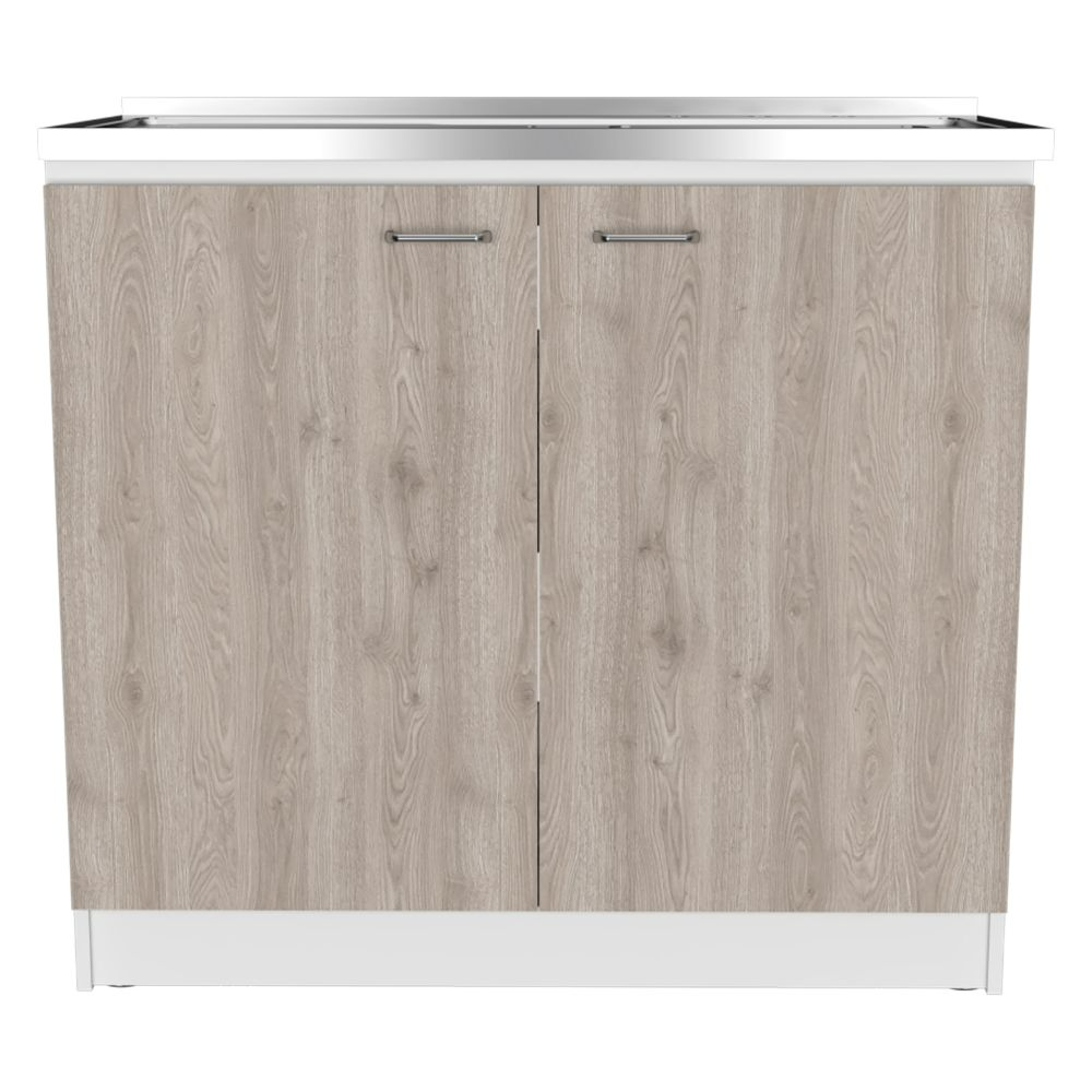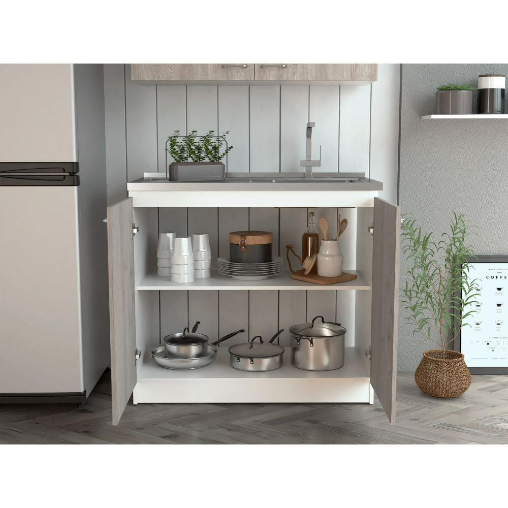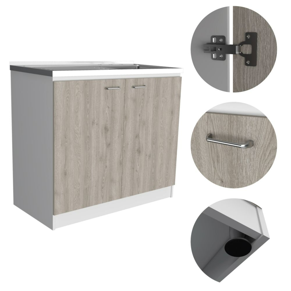 Salento Freestanding Sink strikes a rectangular silhouette, featuring two spacious shelves (38,4''W X 29,5''H) perfect for storing pots and pans or placing your daily kitchen utensils behind two cabinet doors that provide private storage. Features an integrated steel sink. Complete the Salento look with a matching Salento Wall Cabinet. *****FAUCET NOT INCLUDED****Designed with elegant white-light grey manufactured wood finish.