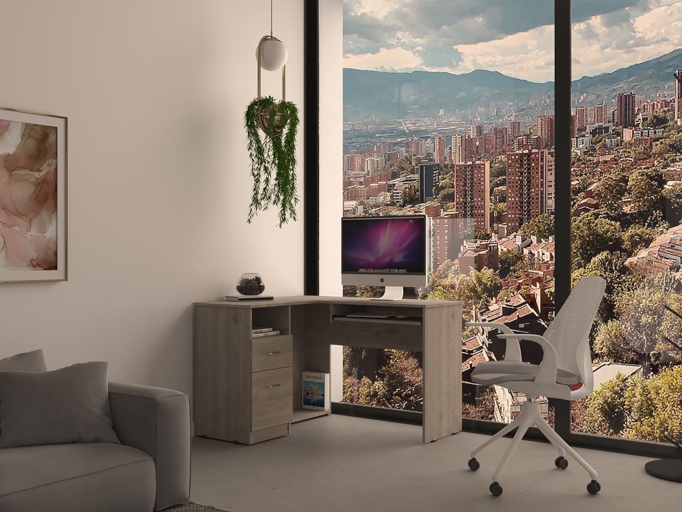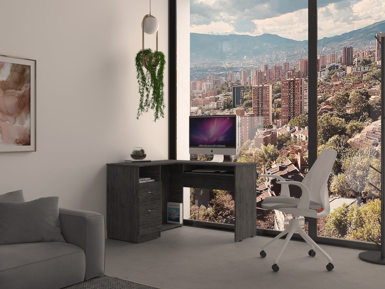 Idra L-Shaped Desk, Keyboard Tray, Two Drawers, One Open Shelf