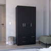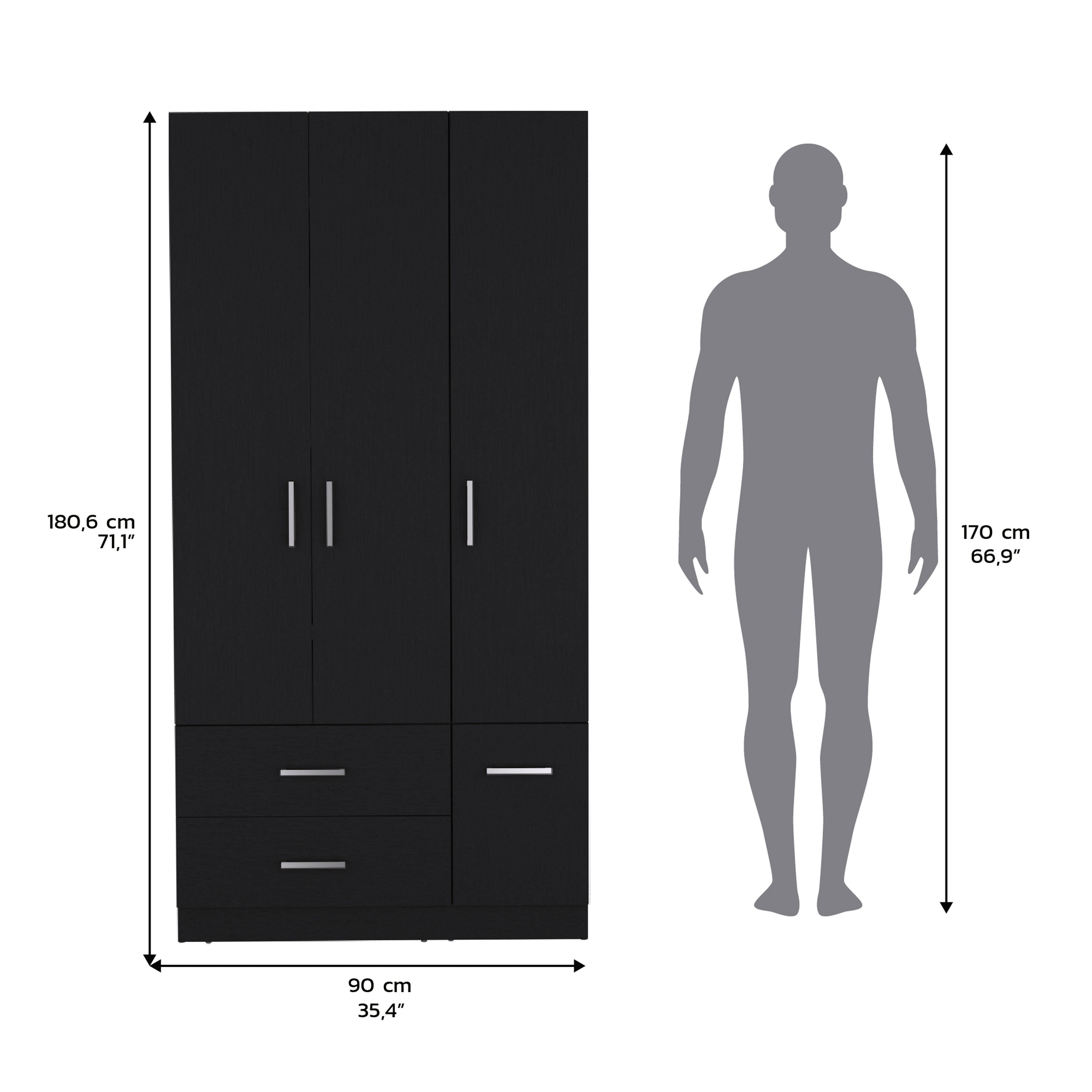 This sleek wardrobe features a combination of two spacious drawers and three doors, making it an excellent solution for organizing your clothing and accessories. Inside, it provides ample storage space with multiple shelves, including a top shelf and three adjustable side shelves for smaller items, as well as a dedicated hanging space for longer garments like dresses and coats. Constructed with precision and a modern design, it adds both functionality and style to any bedroom.