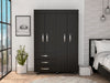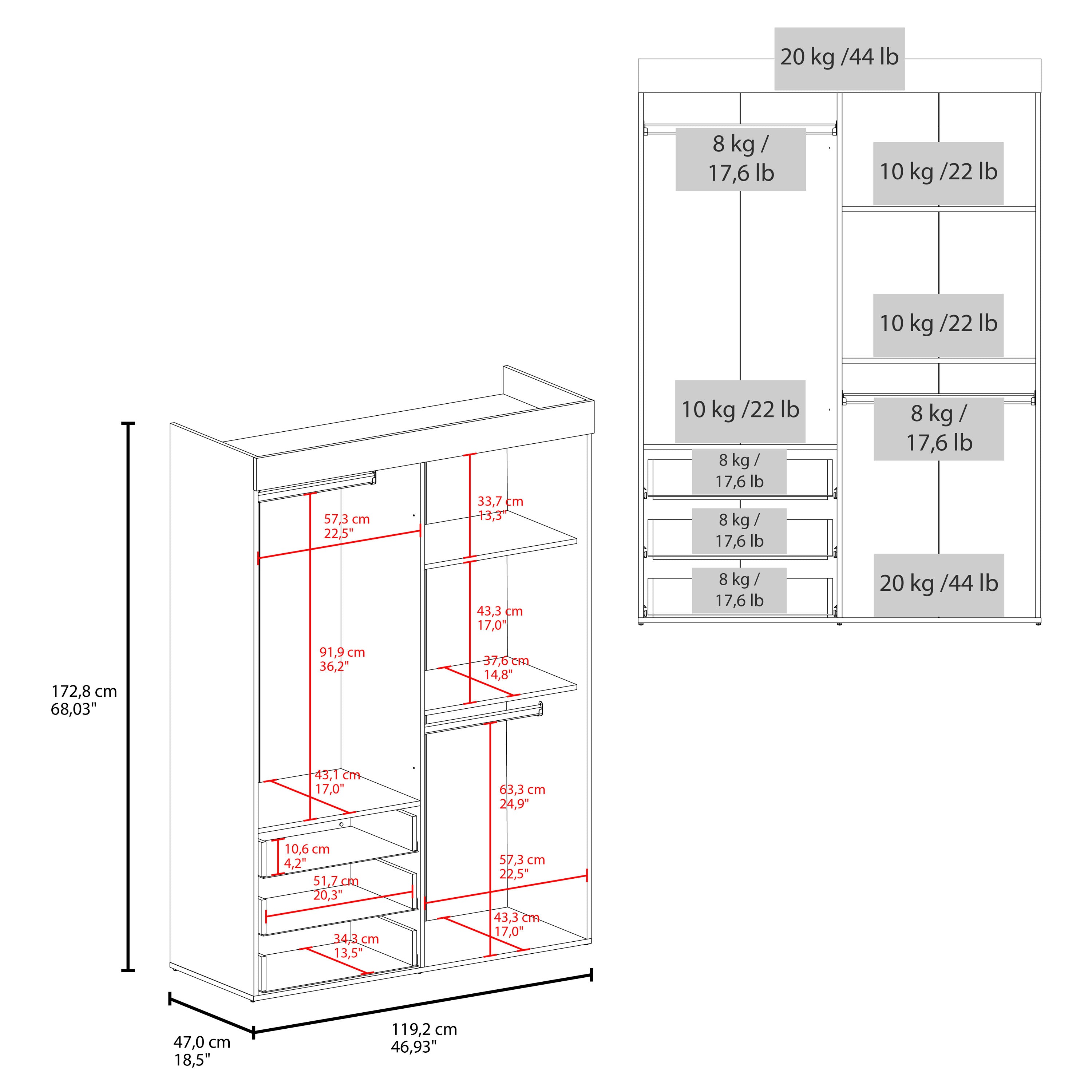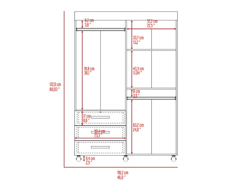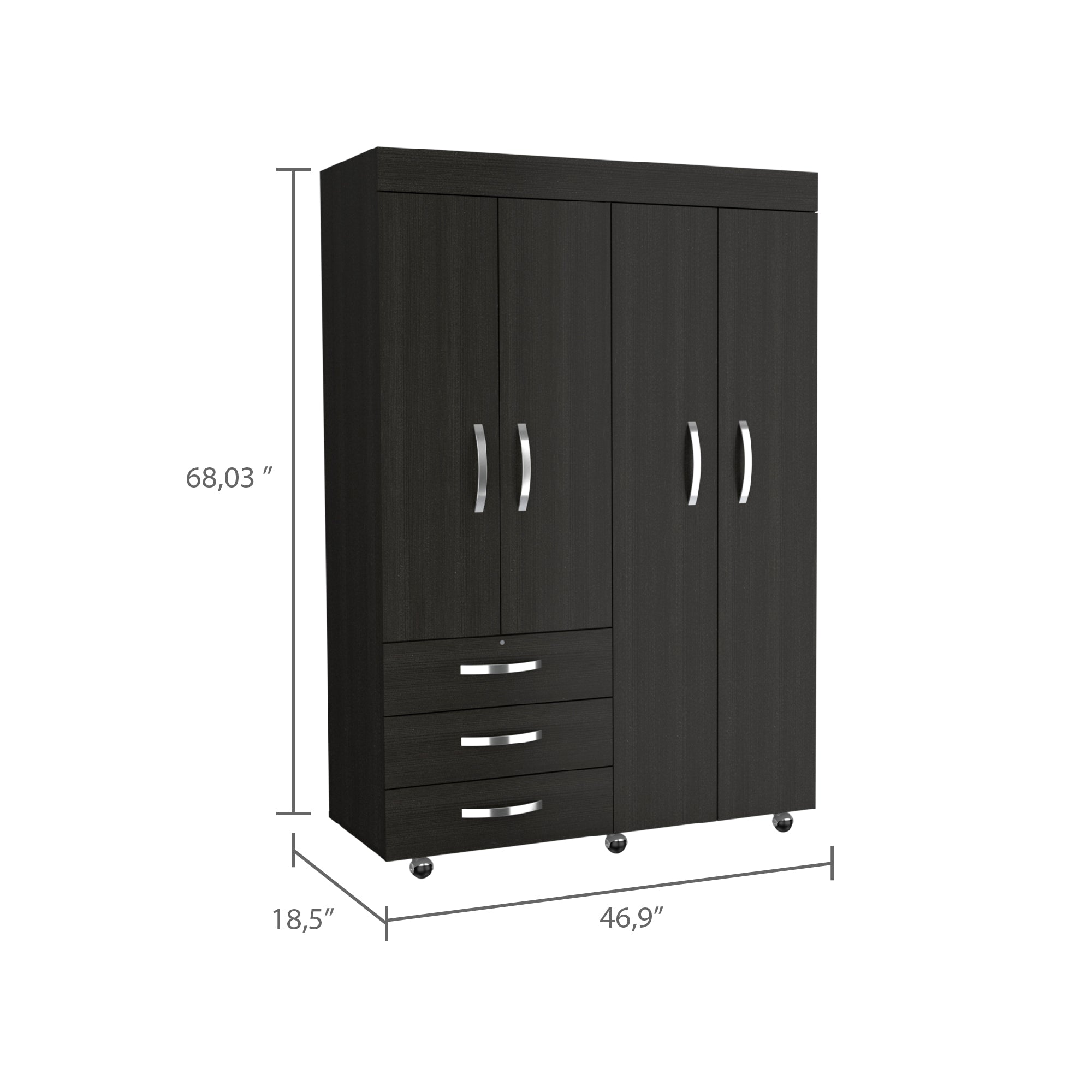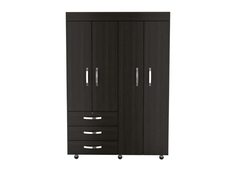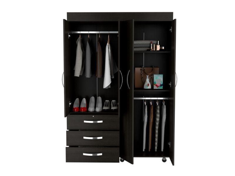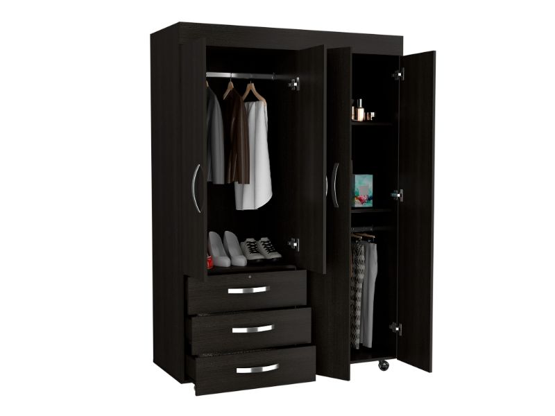 On the left side, a two-door cabinet with an interior hanging rod will give you great space to hang your clothing. On the right side, another tall two-door cabinet conceals two shelves (13.4" High and 17" High). At the bottom of the cabinet, a second space with a hanging rod expands your options. Last, Six casters with a locking mechanism will give the product mobility and provide you with the flexibility to place it easily wherever you want it in your room. Designed with elegant black wengue manufactured wood finish.