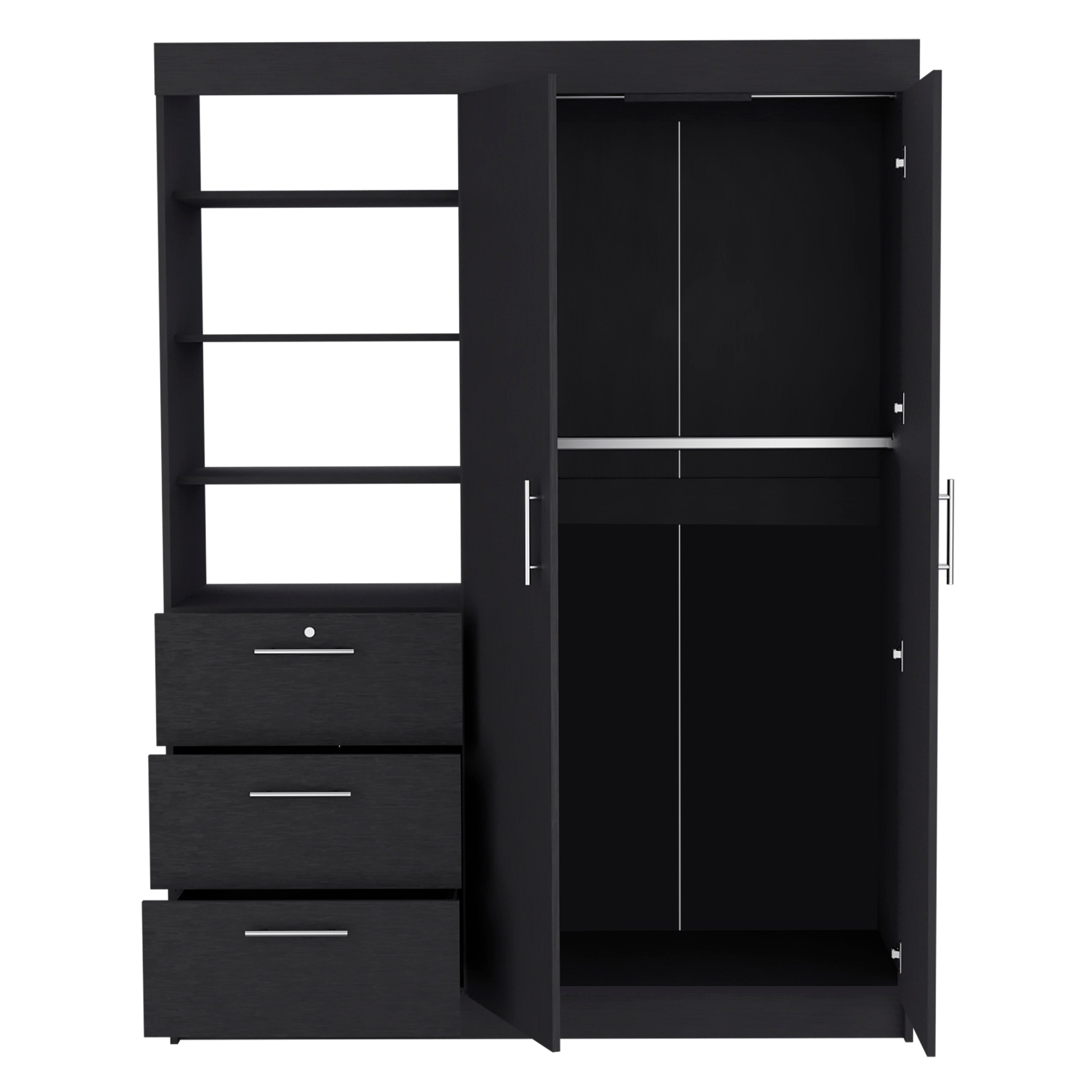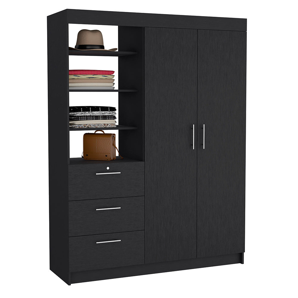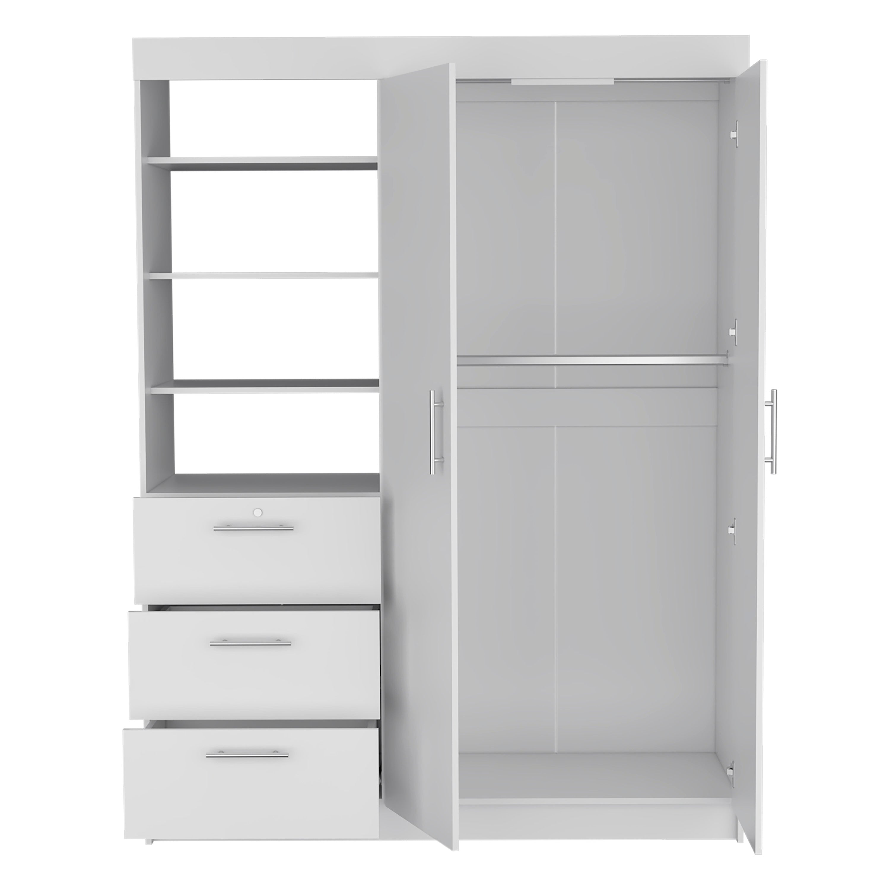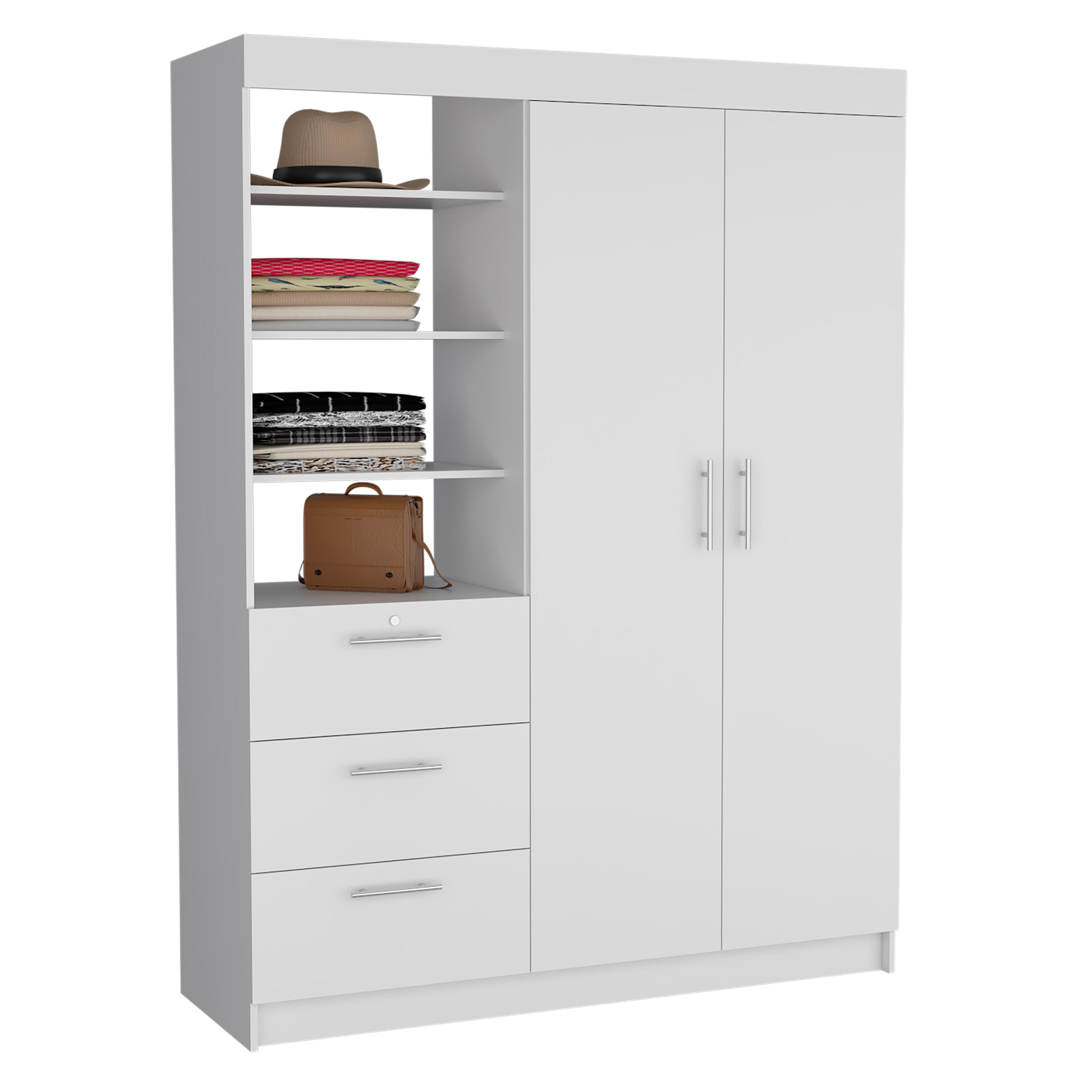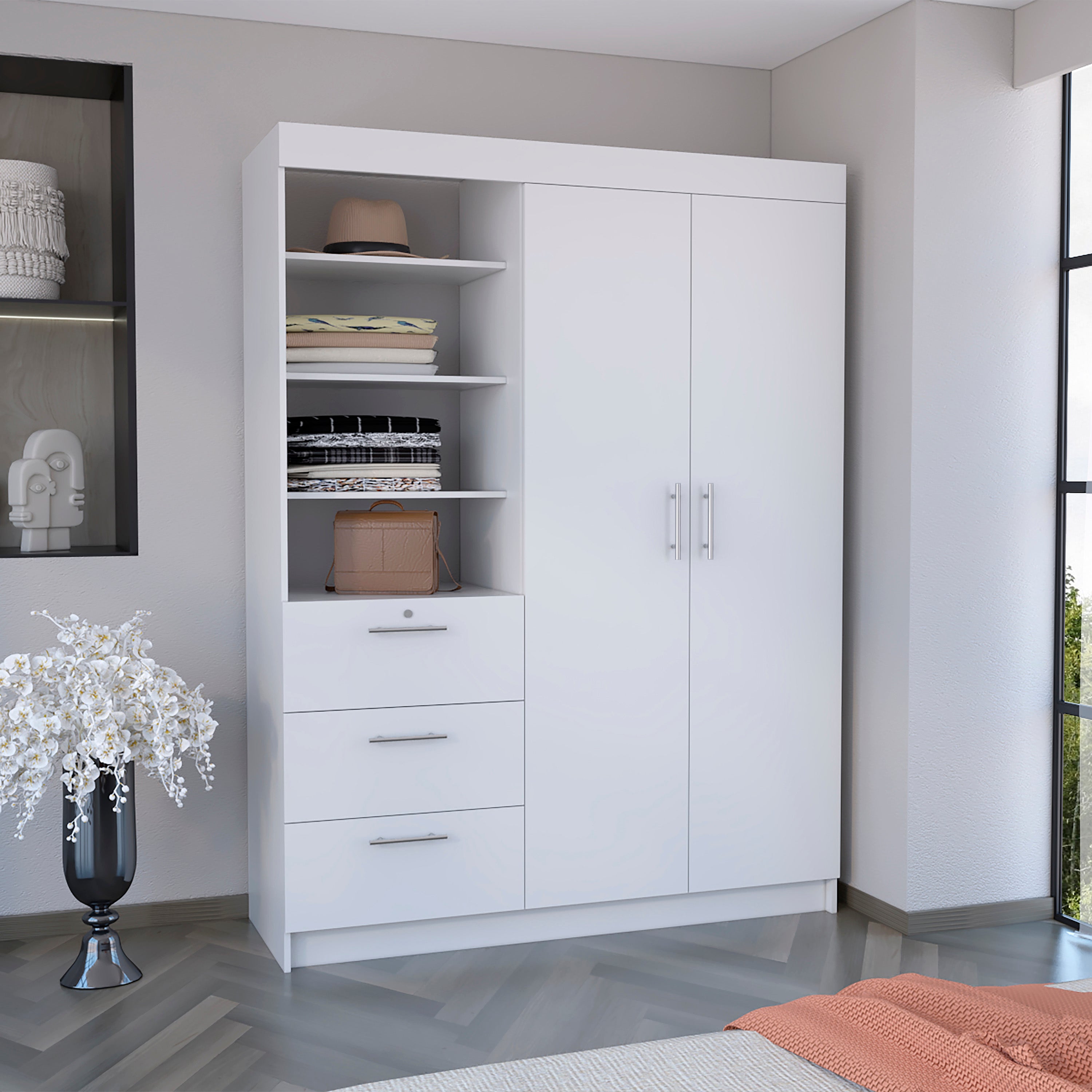 Looking for an armoire with plenty of storage space? Here's the Laurel 3-Tier Shelf and Drawers Armoire! The three tiers are perfect for displaying your favorite decor or essentials, and the three spacious drawers provide plenty of room to store clothes, accessories, or anything else you need. Plus, the two-turn armoire with sturdy metal handles makes it easy to access your belongings. Hang your clothes in an orderly fashion on the two hanging rods inside, and enjoy having everything you need all in one place. Designed with an elegant white manufactured wood finish.