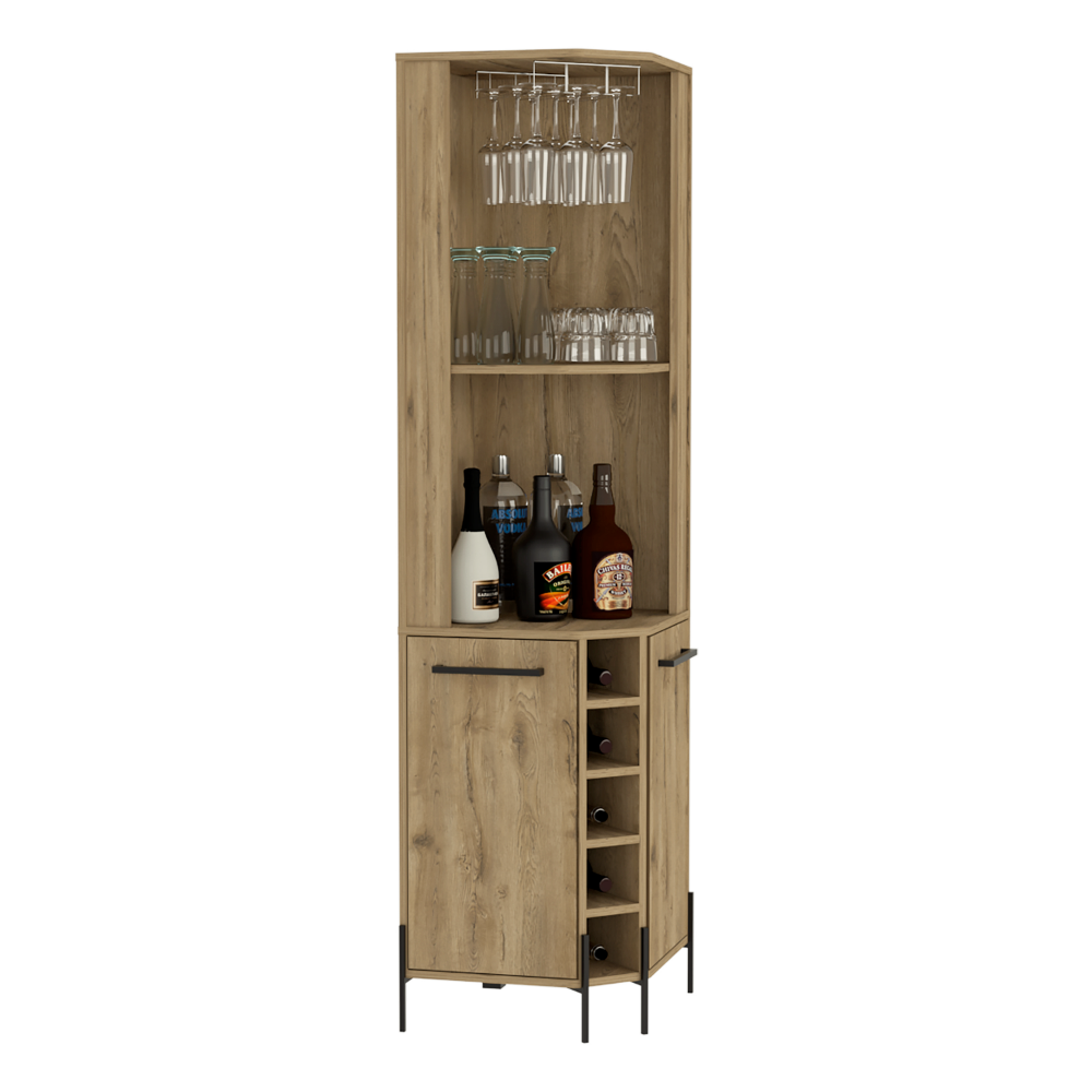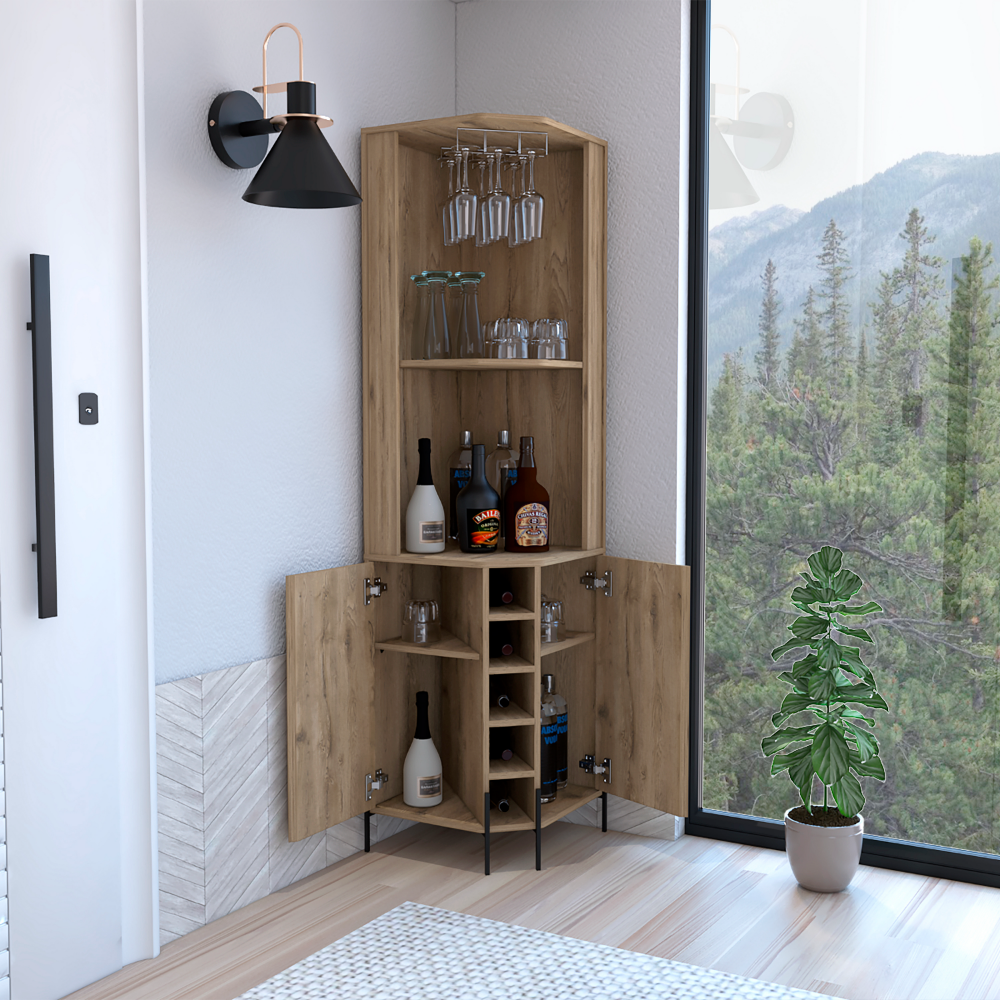 Bosnia Corner Bar Cabinet is the perfect way to show your style with ample storage space. This exclusive color includes a stylish manufactured wood finish. It comes complete with a cup rack, five wine cubbies (4,4''), and two shelves (22,2''H X 17,7''H X 23''W) perfect to expose your glasses or create a new cocktail. With its contemporary design, the Bosnia Corner Bar Cabinet is sure to be a hit in any home. Designed with elegant Macadamia manufactured wood finish.