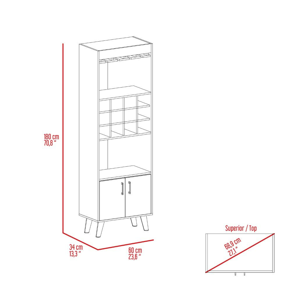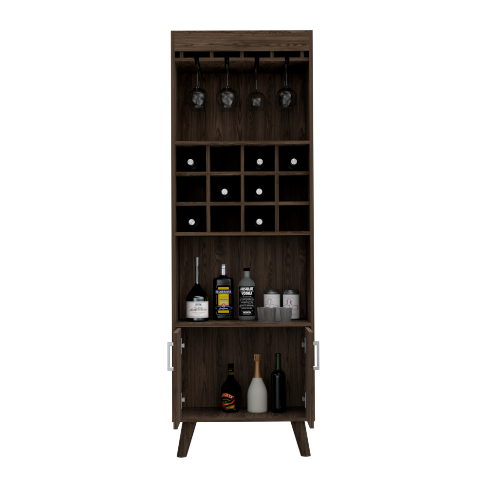 Harvey Bar Cabinet is unique, exclusive, and elegant, this home bar can be both stylish and functional. The Harvey Bar Cabinet has twelve wine cubbies (5,1'') to store your favorite bottles, along with plenty of additional space for spirits, mixers, and glasses with its two ample shelves (22,4''W X 14,5''H). Whether you're throwing a party or just relaxing at home after a long day, the Harvey Bar Cabinet is the perfect addition to your decor. Designed with elegant dark walnut manufactured wood finish.