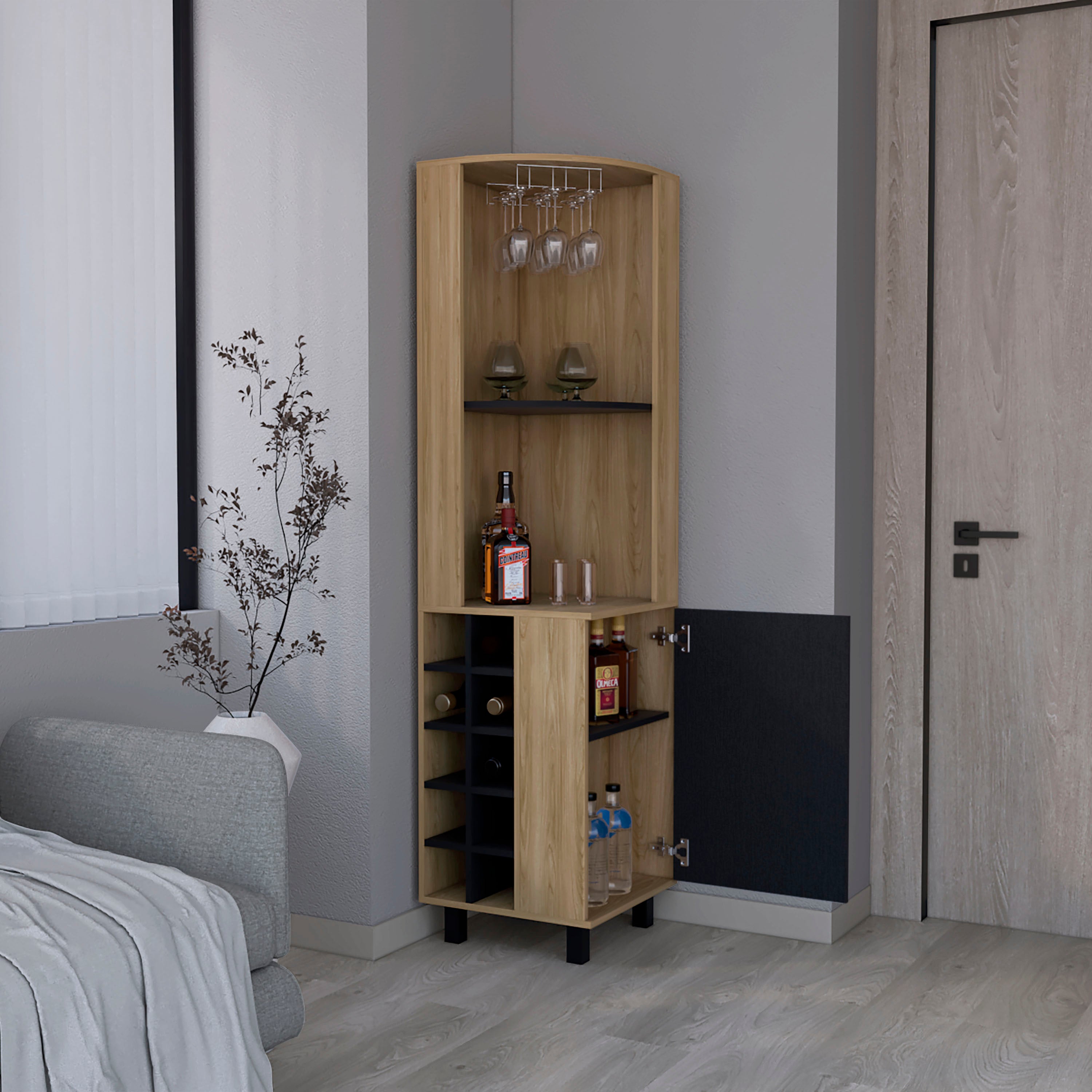 Morocco Corner Bar Cabinet is sure to add a touch of sophistication to any room. This stylish piece is perfect for storing your drinks, snacks, and other bar supplies. Plus, it comes with everything you need to set up your very own bar, including ten wine cubbies (4,4''W X 4,7''H), a single-door cabinet with two interior shelves (10''H X 15,3''H), and two ample superior shelves (20,8''H X 17,7''H X 11.8''W). So why not take advantage of this fantastic offer today? With a contemporary style with four legs and ergonomic size. Designed with elegant Natural oak / Balck wood finish.