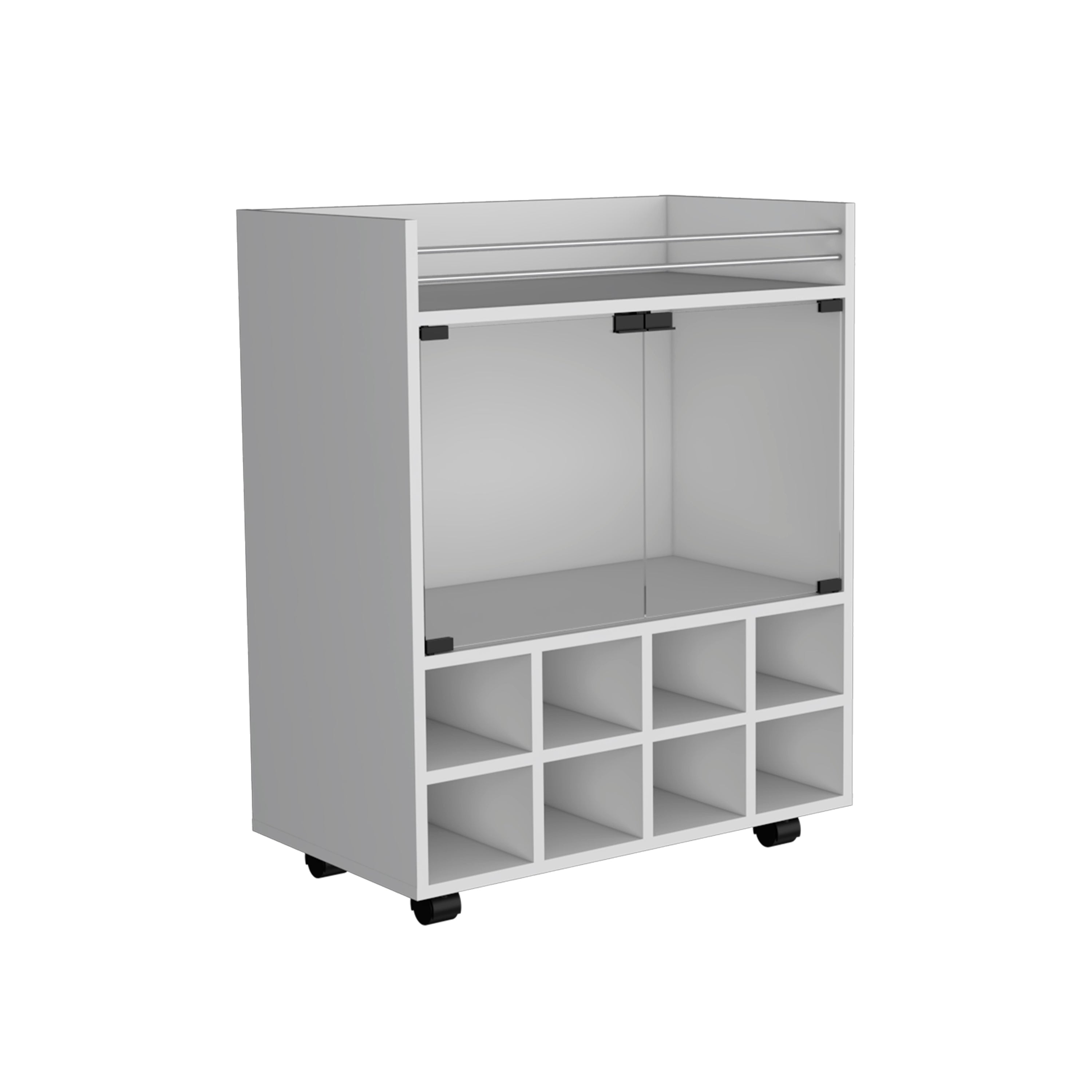 Elevate your hosting game with the Queens Bar Cart. Showcasing an 8-bottle holder (5.7"W x 4.5"H) and a double glass door cabinet (24.6"W x 14.5"H), it's a blend of form and function. Craft cocktails on the aluminum-touched top glide through gatherings with its smooth caster wheels. Finished in premium manufactured wood, choose between white or classic black—a symbol of sophistication in every detail.