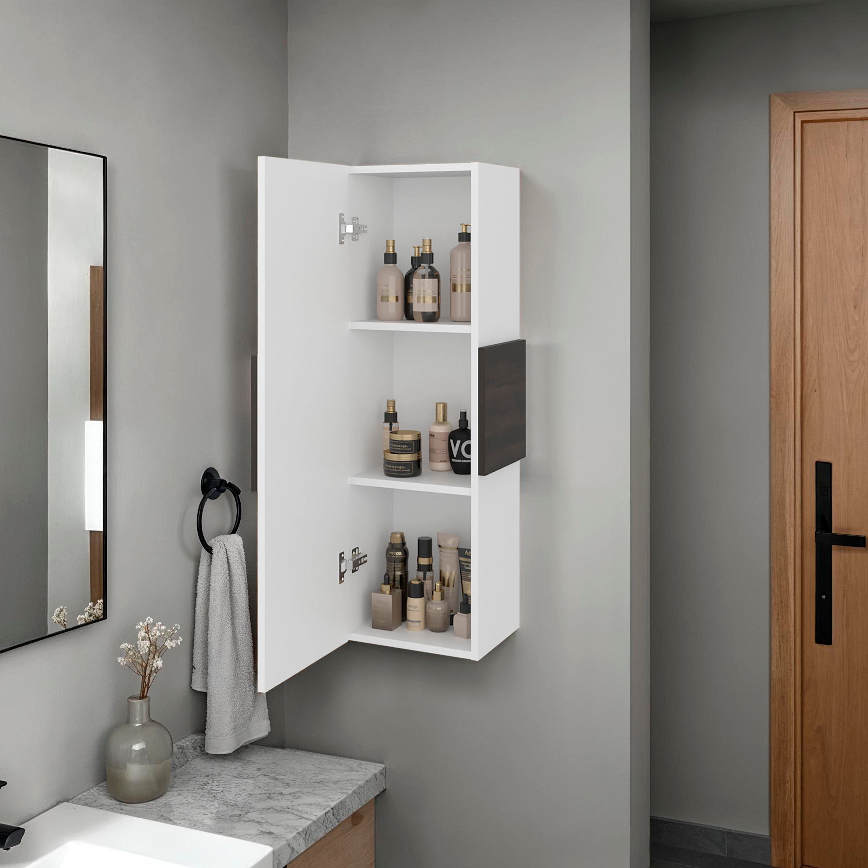 The Magna Medicine Single Door Cabinet is an excellent choice for limited space, it features one door medicine cabinet with three shelves perfect for keeping your bathroom or any room neat and organized, excellent choice for hanging above a vanity, sink, or as auxiliary storage in the bathroom for towels and toiletries, sleek and modern design that blends perfectly with any style you have in your room. Designed with elegant Light Oak / White manufactured wood finish.