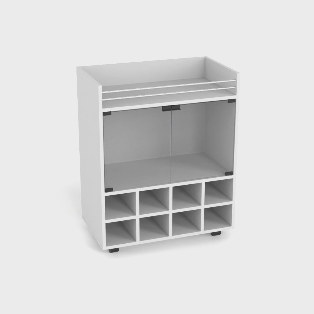 Elevate your hosting game with the Queens Bar Cart. Showcasing an 8-bottle holder (5.7"W x 4.5"H) and a double glass door cabinet (24.6"W x 14.5"H), it's a blend of form and function. Craft cocktails on the aluminum-touched top glide through gatherings with its smooth caster wheels. Finished in premium manufactured wood, choose between white or classic black—a symbol of sophistication in every detail.