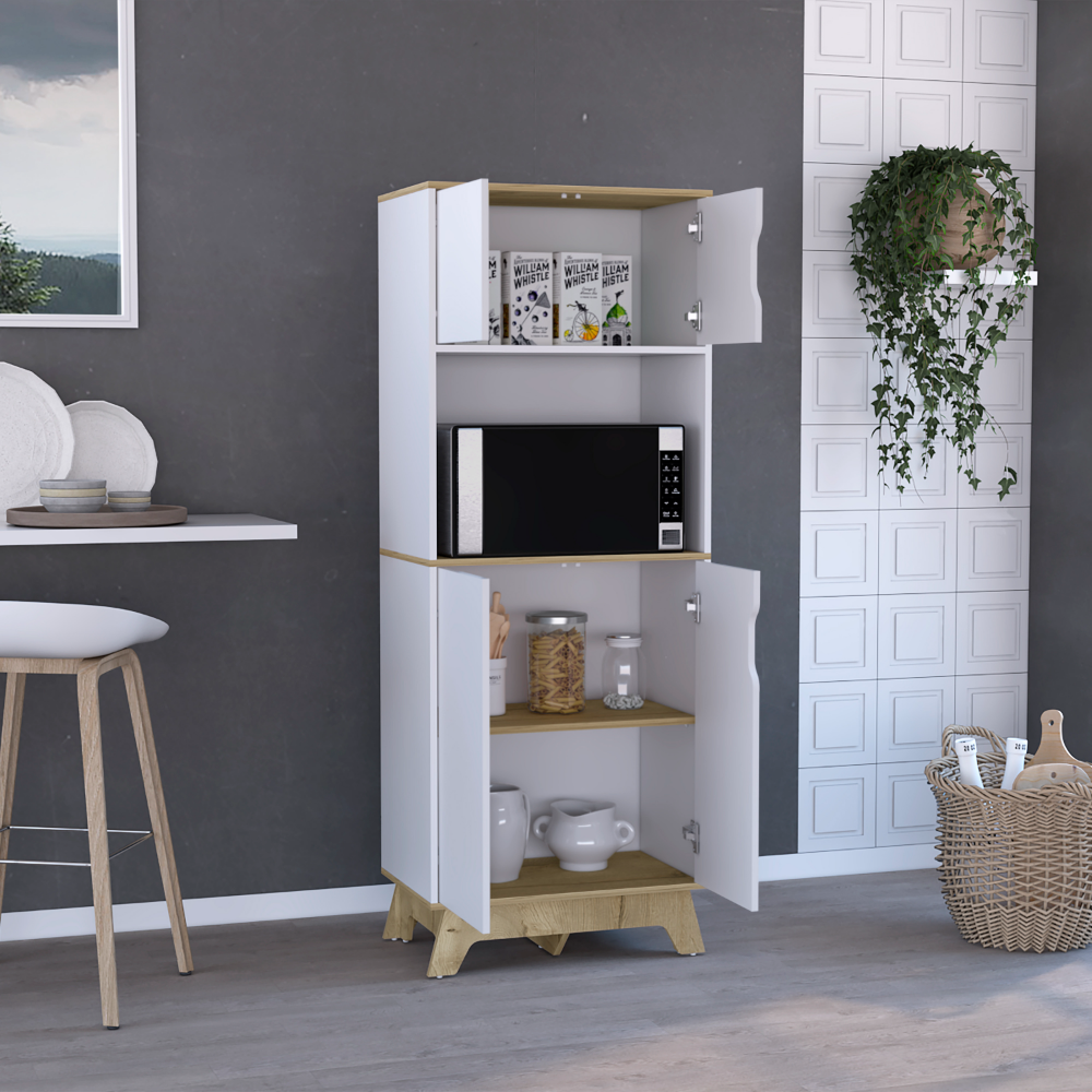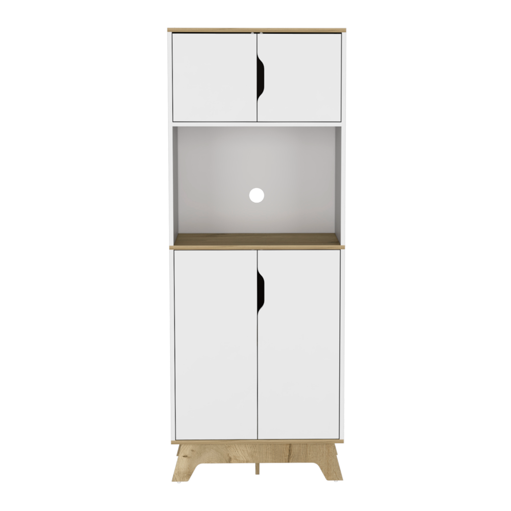 Catalhea Microwave Pantry Cabinet is perfect for anyone who wants to add more organization and style to their kitchen. This microwave cabinet has a contemporary design, with wide shelves perfect for storing all of your cooking supplies, especially for the back hole opening for the microwave. The double-door cabinets on the top and bottom provide even more space, and the shelf can be adjusted to fit your needs. Designed with an elegant light oak-white manufactured wood finish.