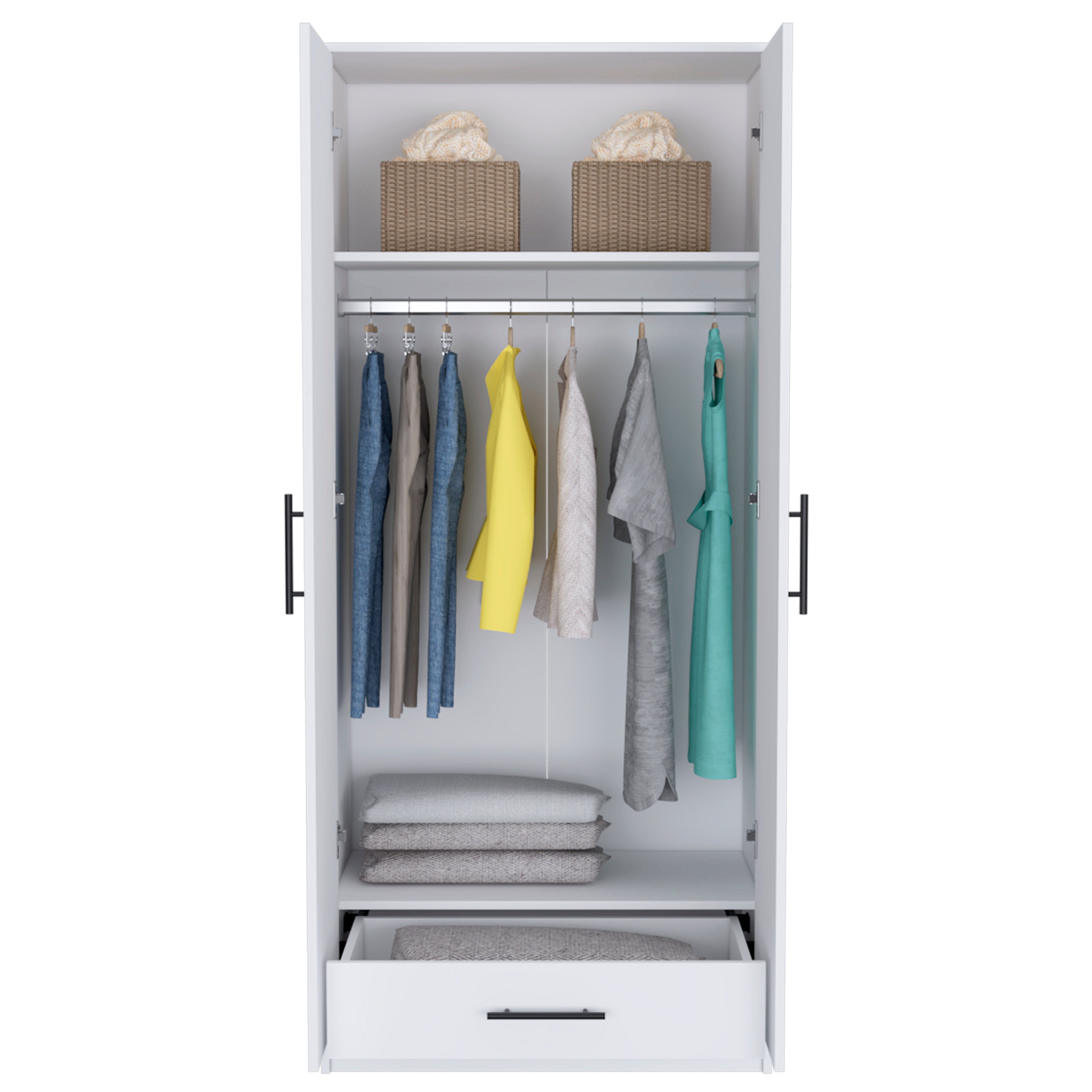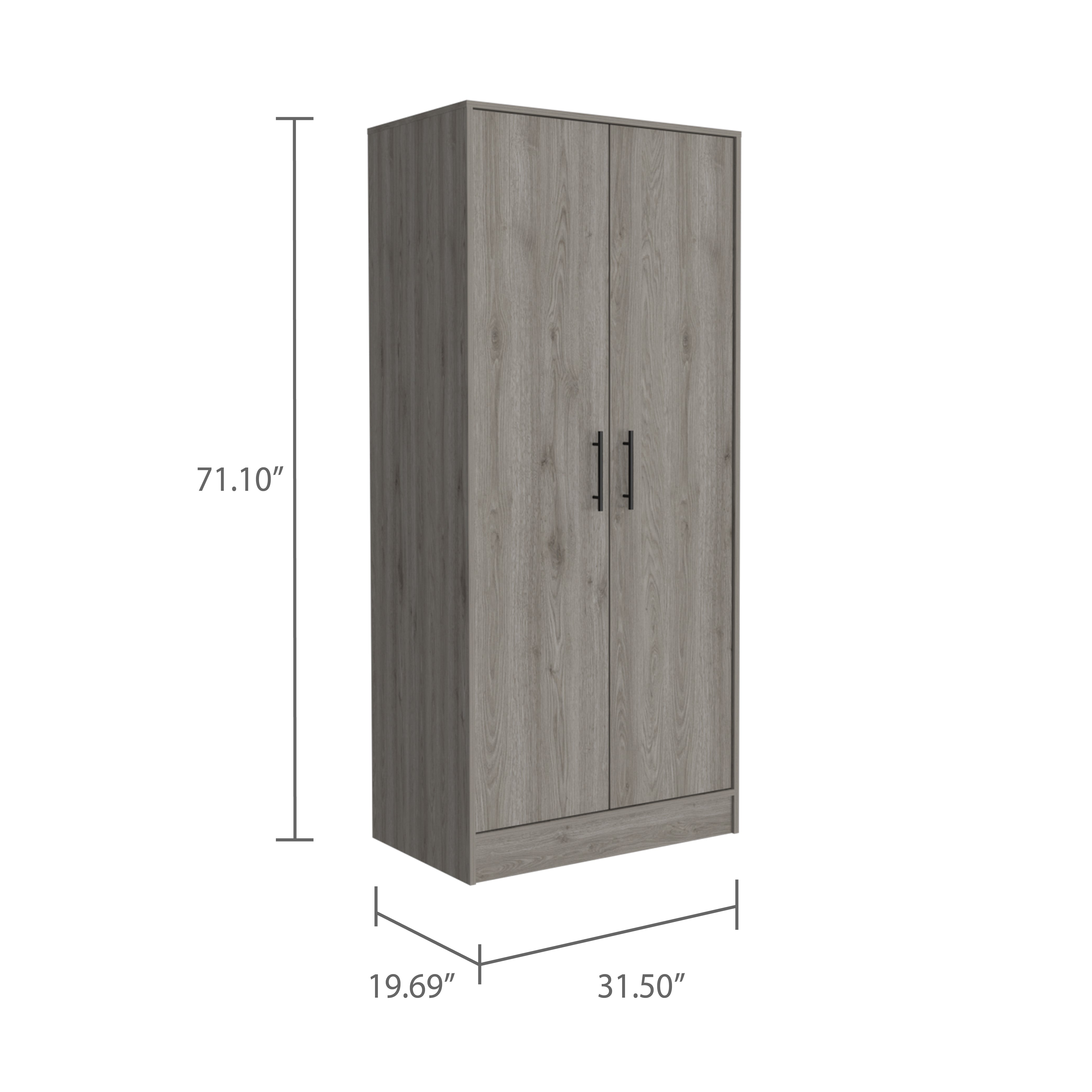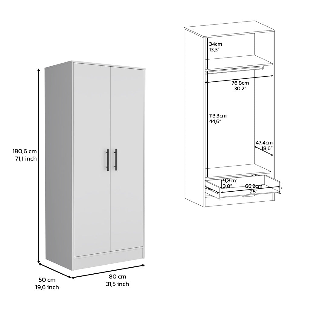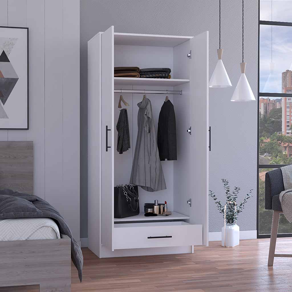 Darwin Armoire, Double Door Cabinets, Metal Rod, Metal Handle, Two Shelves, One Drawer