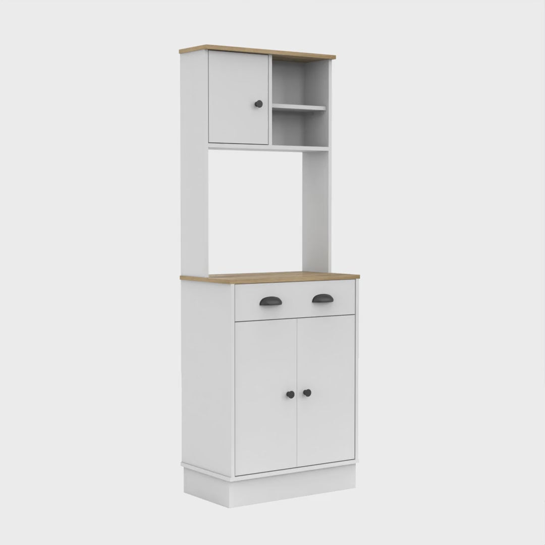This pantry cabinet comes with a spacious top surface (13,7" W X 23,6" D) that is perfect for holding your microwave and other electronics, along with an ample drawer that offers convenient storage for your utensils, linens, or other small items. The upper part of the cabinet also features a single-door cabinet with open storage, providing an excellent place for displaying your favorite dishes or decorative items.