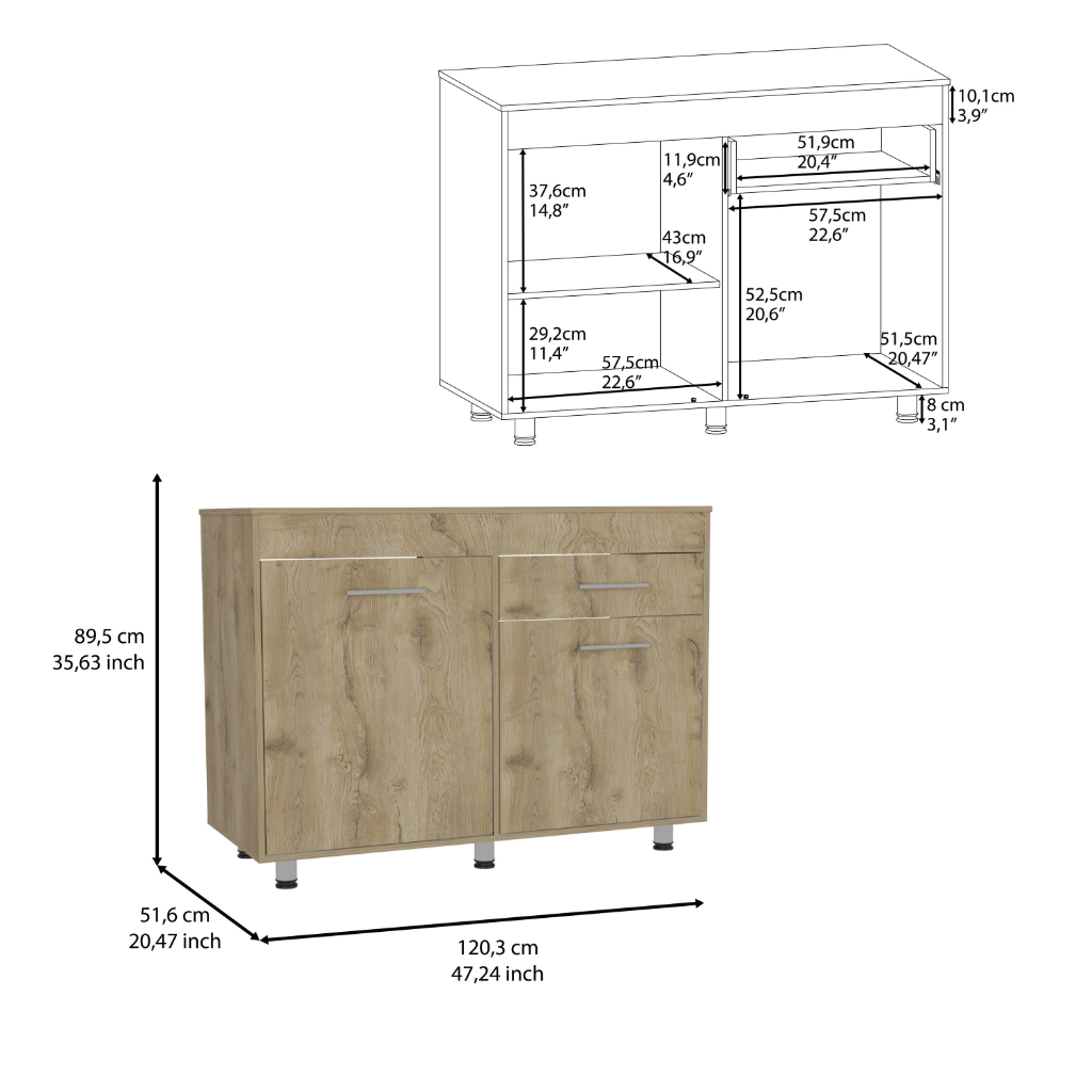 Cooking is a breeze with the Monet Utility Base Cabinet, It also features two doors, three shelves (22,6''W X 14,8''H), and an ample drawer, perfect for storing all your kitchen essentials. The countertop (47,24''W X 20,47')provides plenty of space for larger items, while the elegant macadamia manufactured wood finish adds a touch of class to your kitchen. You will love it!. Designed with elegant Macadamia manufactured wood finish.