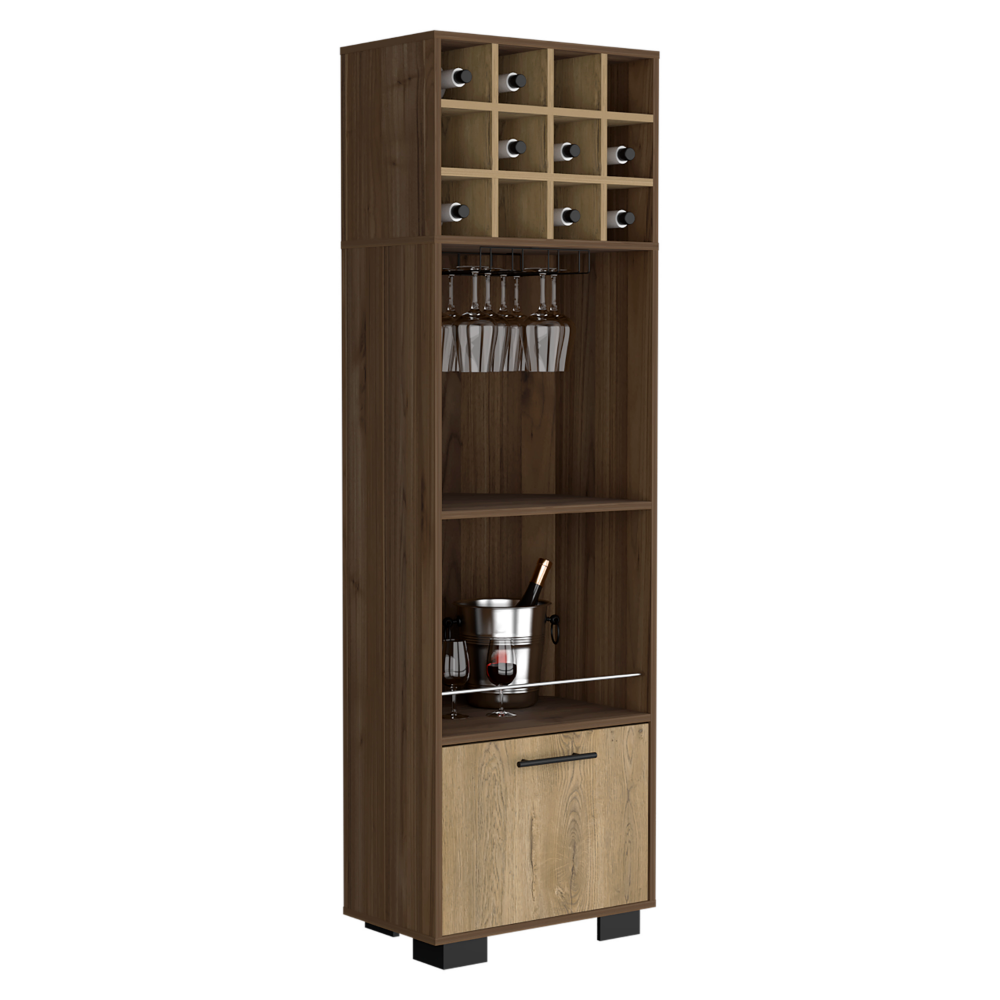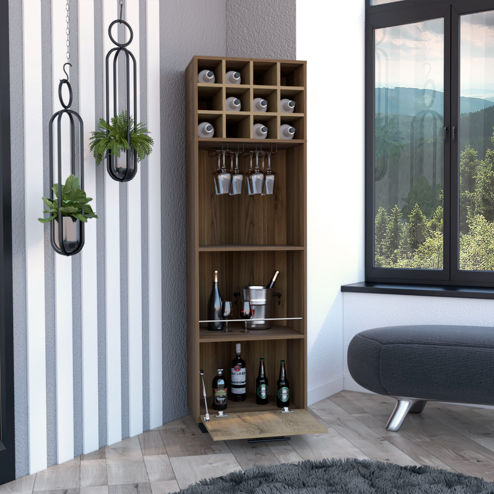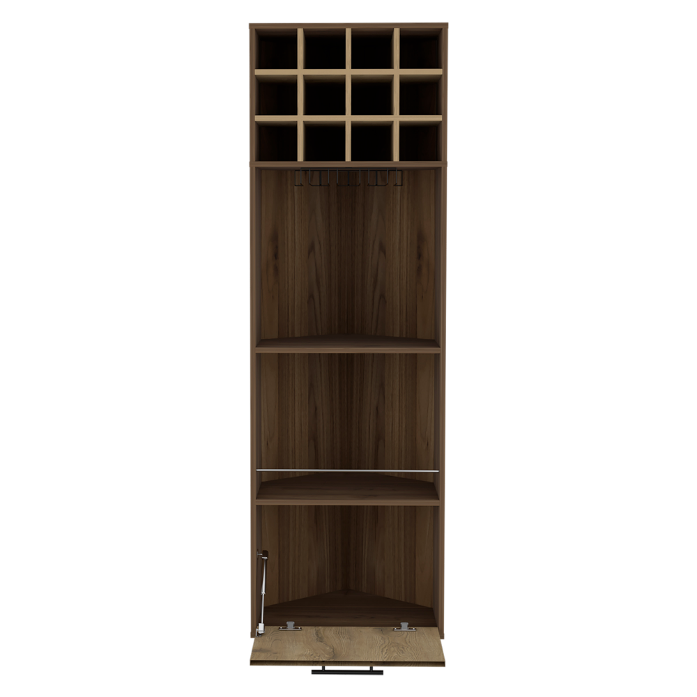 The Norway Corner Bar Cabinet is the perfect place to store your drinks! It has a cup rack and twelve wine cubbies (4,4'') perfect for your exclusive wine collection and glasses, as well as two open shelves (20''H X 16''H X 20.5''W) that are perfect for creating new cocktails. Designed with elegant mahogany-macadamia manufactured wood finish.