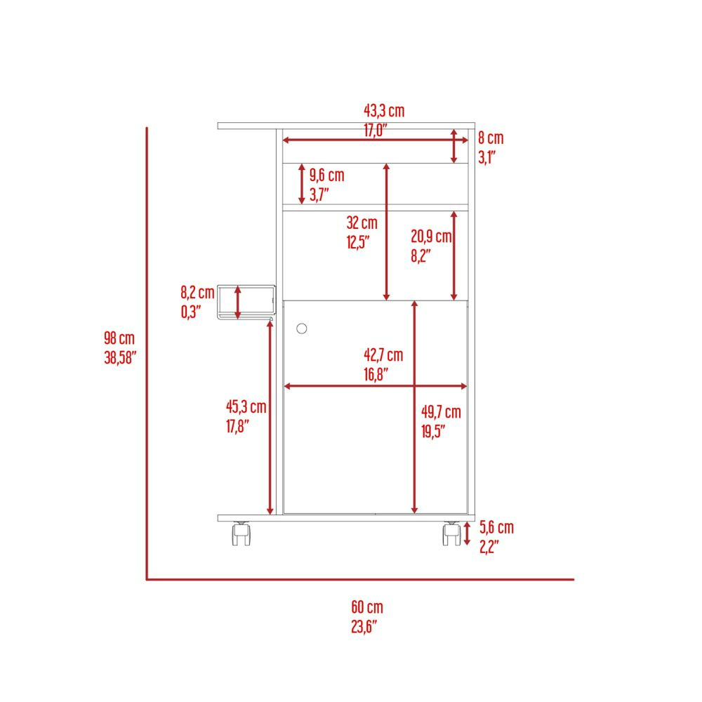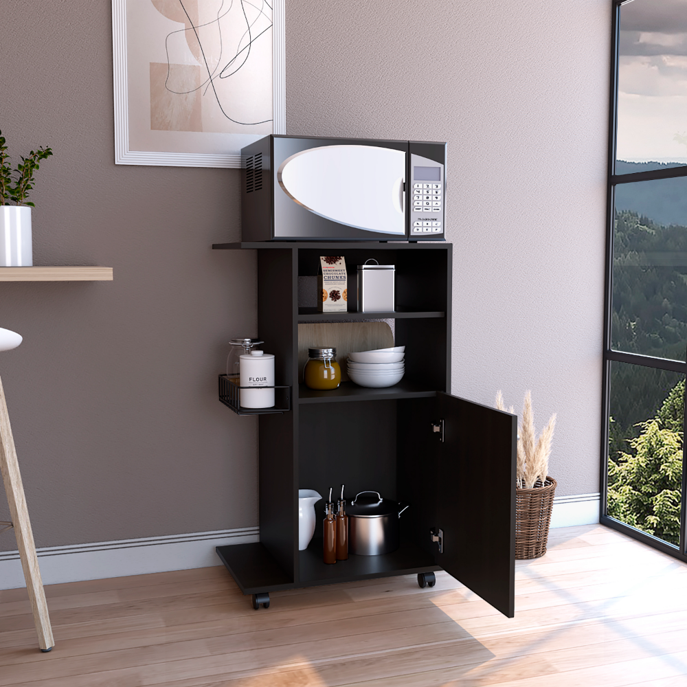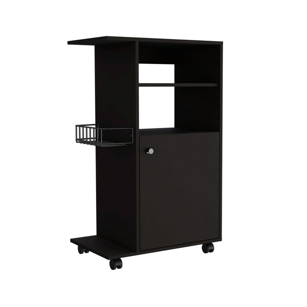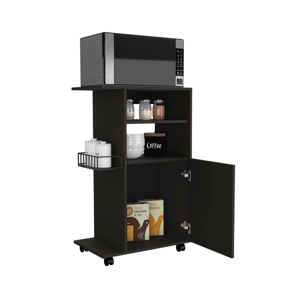 Opal Kitchen Cart, this ergonomic cart makes the idea of adding additional storage to your kitchen a reality. With a vast storage capacity, it is both elegant and functional. The superior top is designed exclusively for the microwave, and the four caster wheels (2,2'') can be relocated as needed, with a rack for extra storage. Complete your kitchen collection with this amazing kitchen cart! Designed with elegant black wengue and white manufactured wood finish.