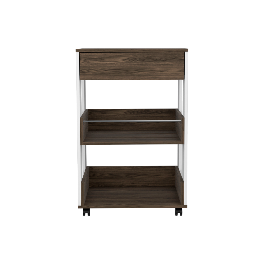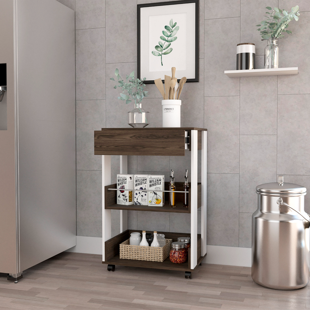 Pillar Kitchen Cart, don't be a kitchen wallflower! With the Pillar kitchen cart, you can spruce up your cooking area with a stylish, modern piece that offers extra storage and mobility. This handy cart has two large shelves (4,7’’H X 20,0’’W) to organize all of your essentials and a spacious drawer (5,5’’H X 20,9’’W) for even more organization. And the best part? The Pillar cart is easy to move around your kitchen, a superior-top size(22,5’’W X 15,6’’D) Designed with elegant white-dark walnut manufactured wood finish.