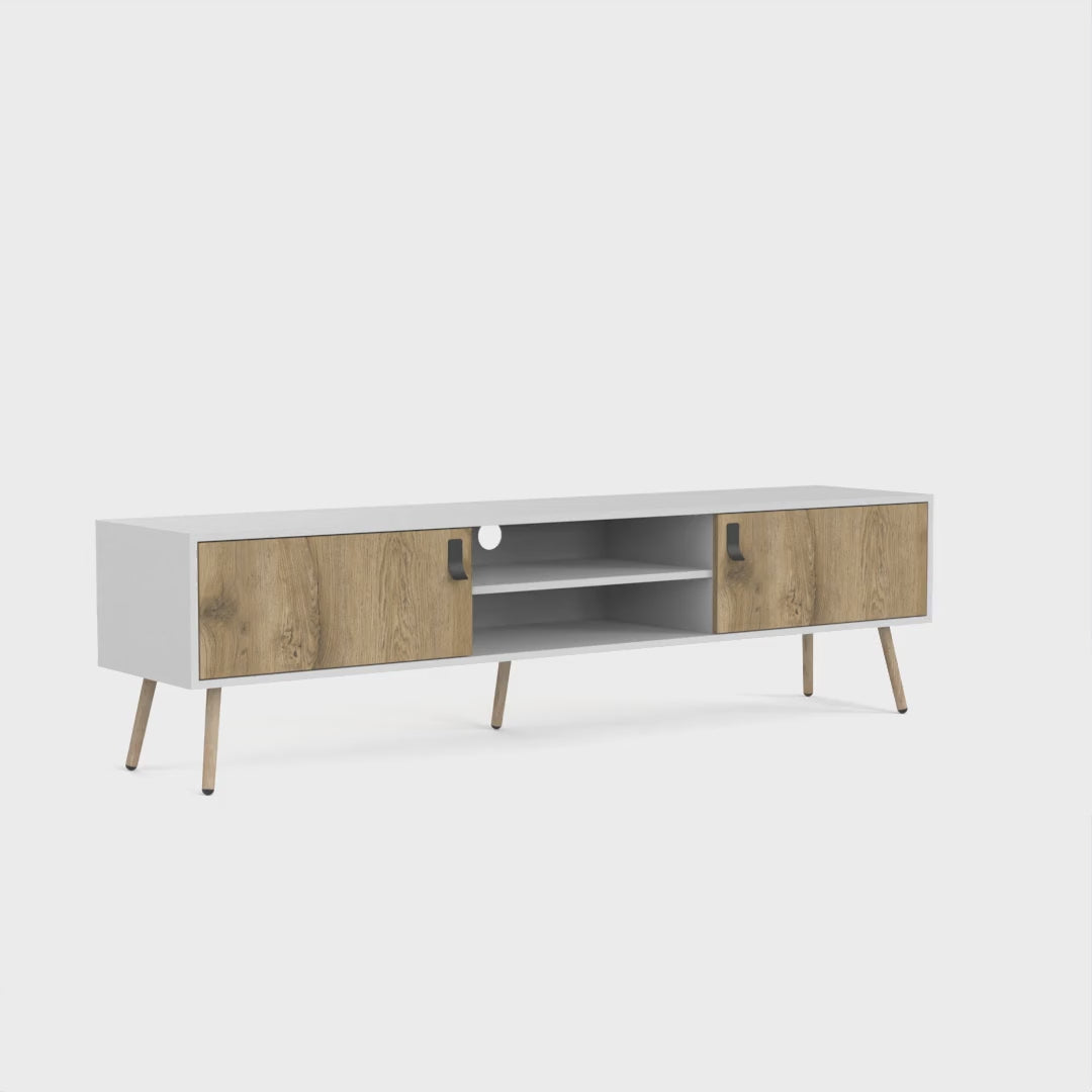 Introducing the Toka TV Rack, a centerpiece of modernity and convenience for your living space. In a dual-tone white/macadamia finish, this piece redefines media storage. Measuring 70.9"W x 15.3"D, it comfortably supports your TV, while two hinged doors (22.4"W x 9.8"H) conceal storage space for a clutter-free look. The central open shelves cater to your media devices, enhanced by a cable management system. Resting on four robust wooden legs, the Toka TV Rack isn't just about utility; it's about bringing a sleek, contemporary vibe to your entertainment area.