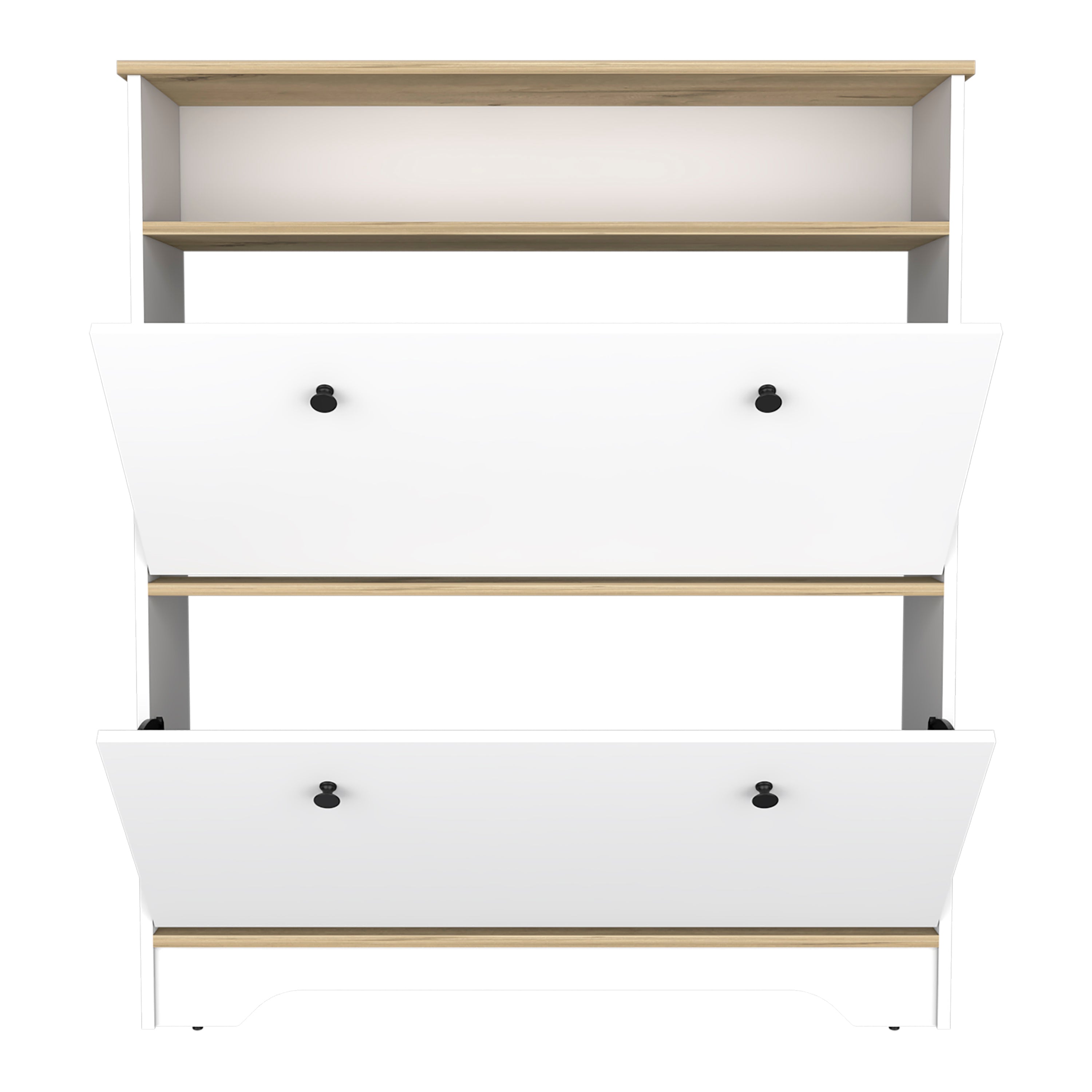 Wayne Shoe Rack, you'll be able to find a designated spot for every one of your shoes with this chic and functional shoe rack. With enough space to store up to 12 pairs of shoes with its two ample flexible shelves (37,4'W X 15,4''H), this rack is perfect for anyone who struggles with clutter. It also includes one shelf (37,4''W X 6,6''H) and an ample Superior Top (39,3''W X 10,6' 'D), the contemporary design means it'll look great in any room! Designed with elegant dark Brown and light oak-white manufactured wood finish.