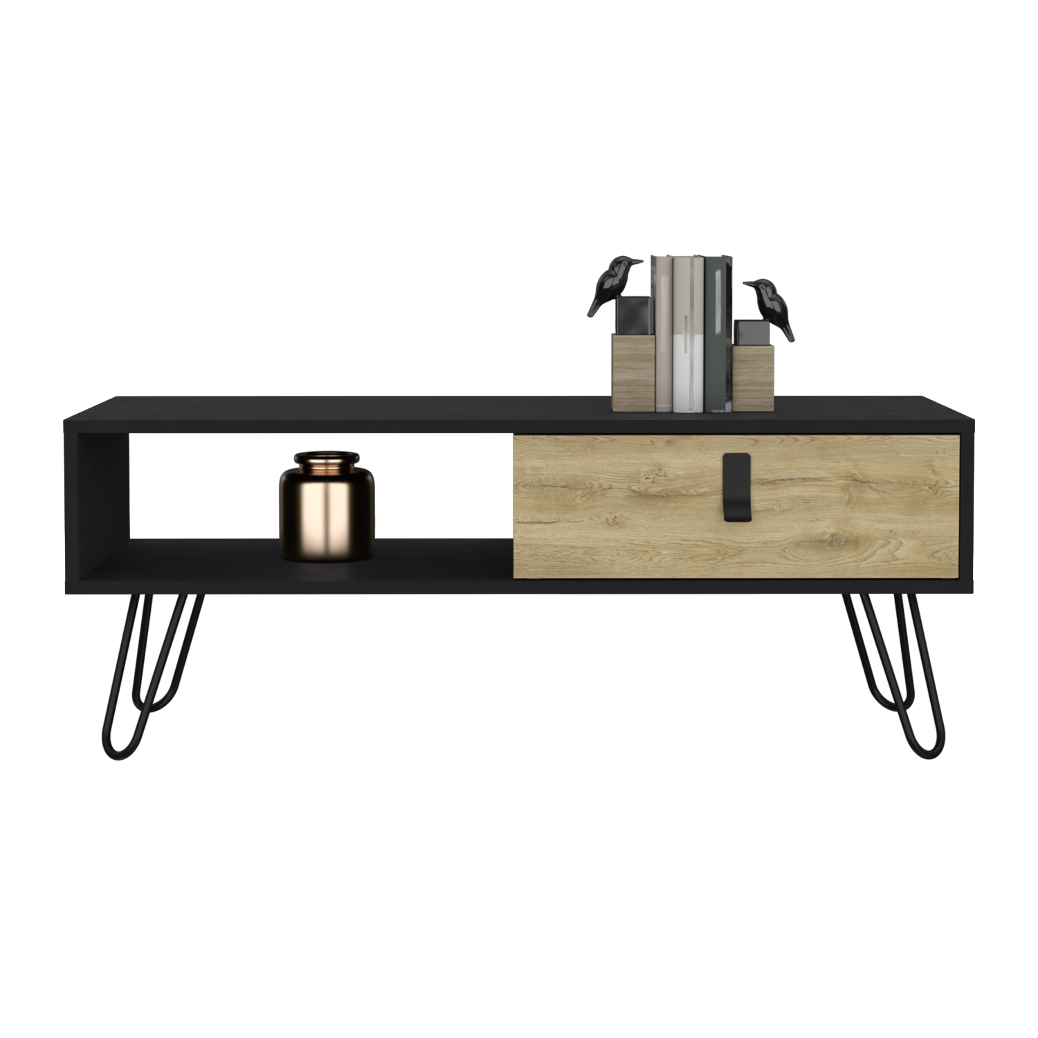 Presenting the Mosby Coffee Table, a contemporary masterpiece for your home. This table's distinctive black/macadamia manufactured wood finish, double color scheme, and chic hairpin legs give it a modern look. The spacious top surface (40.9"W x 14.1"D) accommodates your coffee and décor with adequate area, and the open storage space (19.5"W x 6.6"H x 11.1"D) makes it simple to retrieve your necessities. Nestled beneath is a roomy drawer (18.1"W x 11.1"D), ideal for maintaining a clutter-free area.