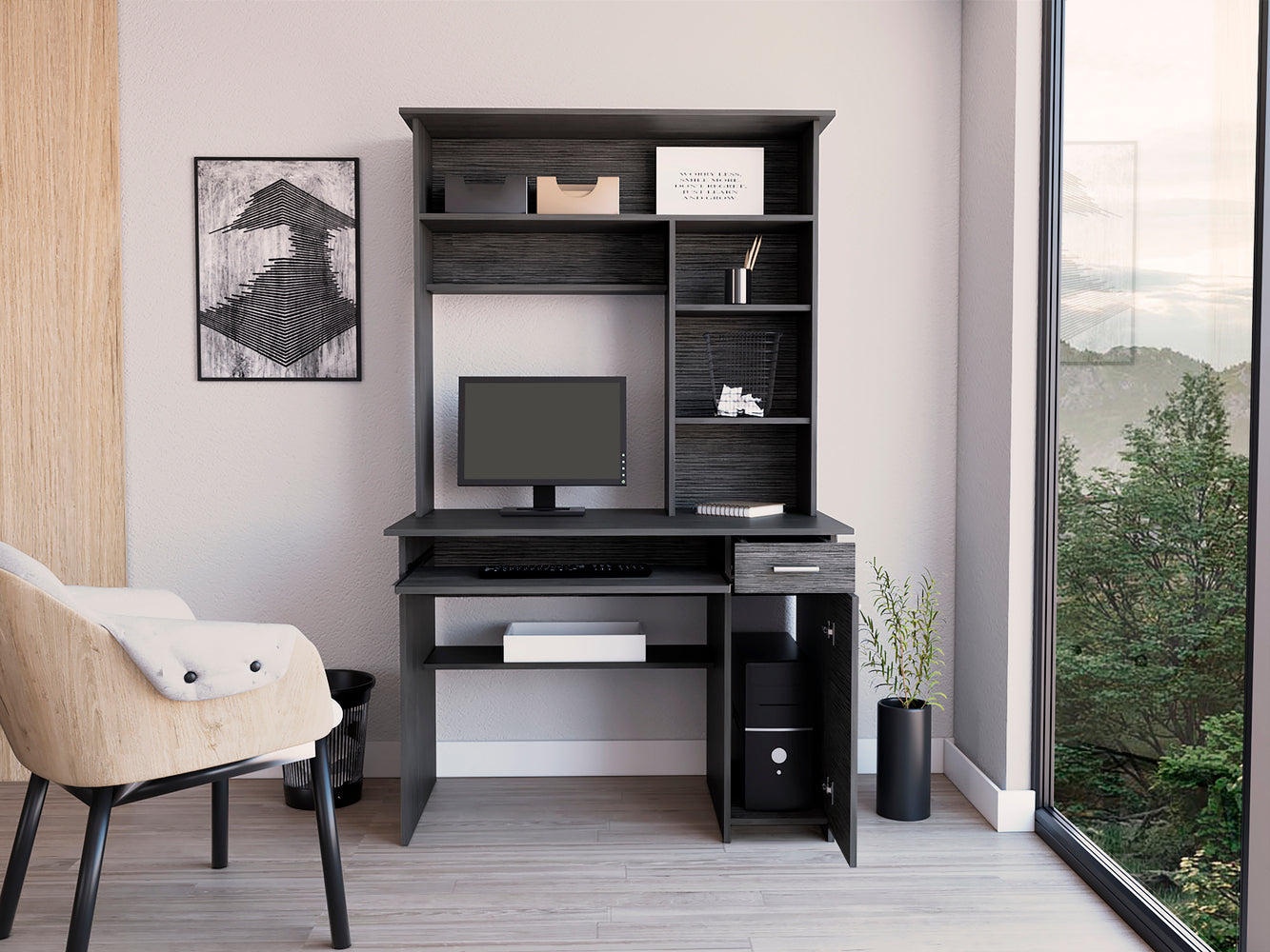 The Xalo 180 Hutch Desk is a sturdy hutch Desk standing 71” tall and providing multi-level storage and organizational options. CPU tower storage is neatly tucked below with an access area behind. A retractable keyboard tray tucks away below the Desktop to create less clutter and protect your keyboard. Multiple shelves for storage and decor make this Desk very versatile. It also includes an ample hutch, perfect to expose your accessories and favorite decoration. Designed with elegant black wengue, gray oak and light gray manufactured wood finish.