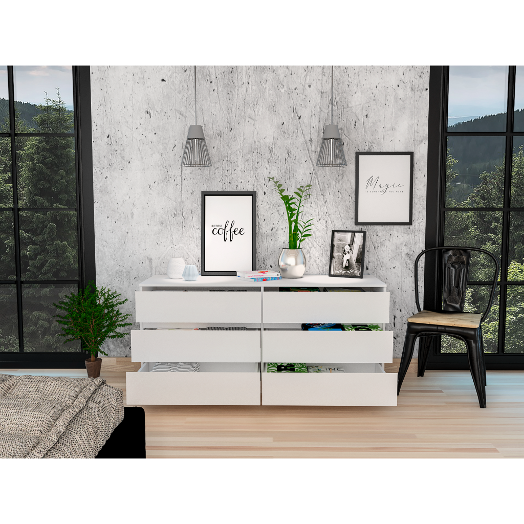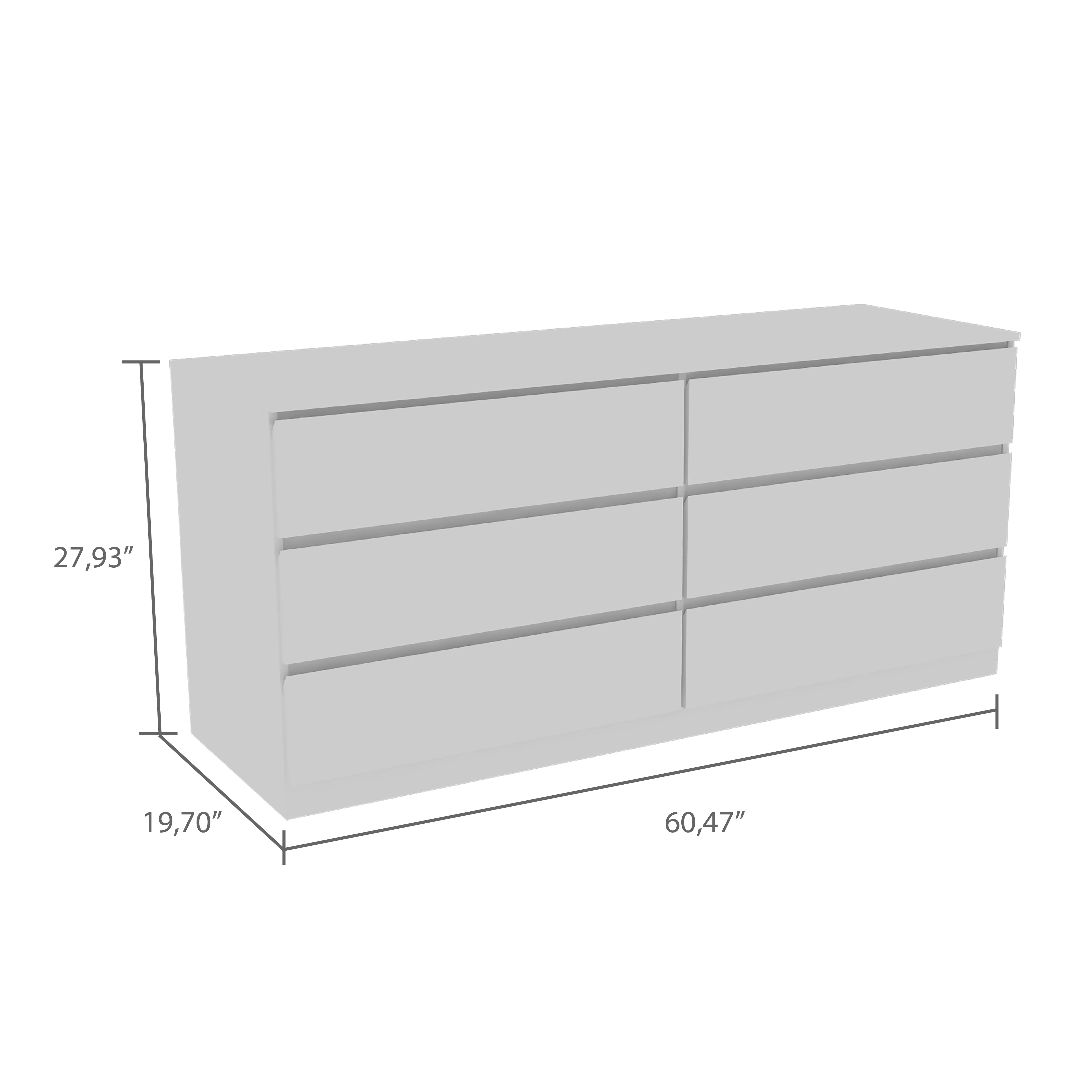 Cocora 6-Drawer Dresser has a timelessly modern look that blends easily with any decor. The modern style fits any bedroom, providing the necessary storage to help you keep your room organized as well as give a stylish update. It works great in rooms with reduced space and looks fantastic in larger areas. This dresser features six very spacious drawers (29,80’’W X 7,48’’H) with all-metal rails for smoother use and greater quality. Designed with elegant light oak-white and light grey-white manufactured wood finish.