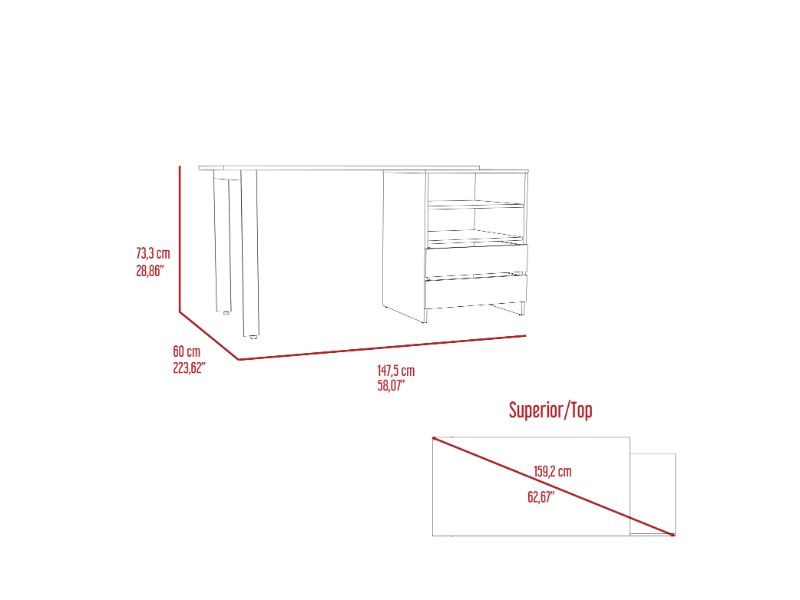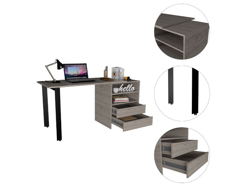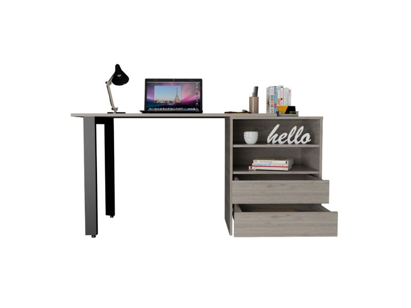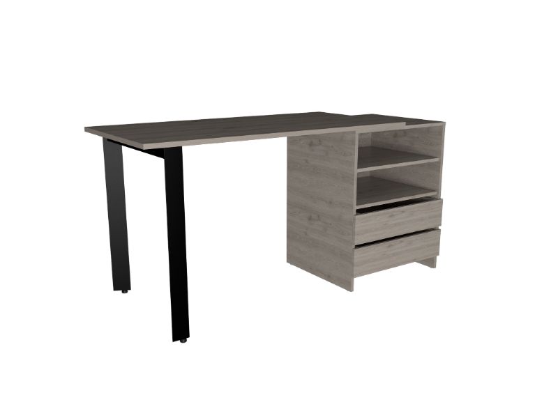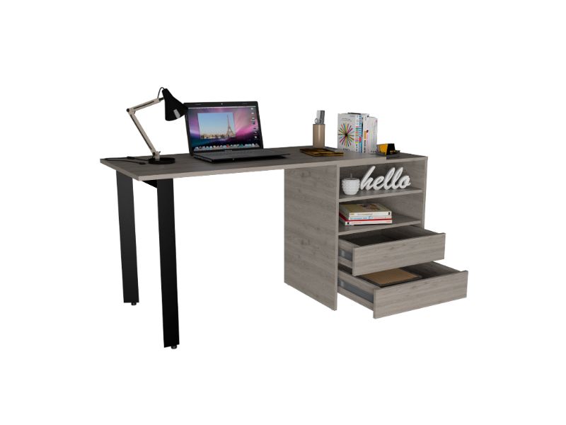 The Austral 120 writing desk is a classic, modern, and compact piece that will have your back regarding today's needs for remote learning or working from home. Standing 28.8" inches high, this desk is perfect, functional, and compact. It features two spacious drawers (18,18''W X 3,93''H) to store all your items and keep your space clean and neat. It also includes two open shelves (5,94''H X 20,39''W). The spacious tabletop allows you to work comfortably on your monitor or laptop, and the final touch with two stylish legs. Designed with elegant light grey manufactured wood finish.