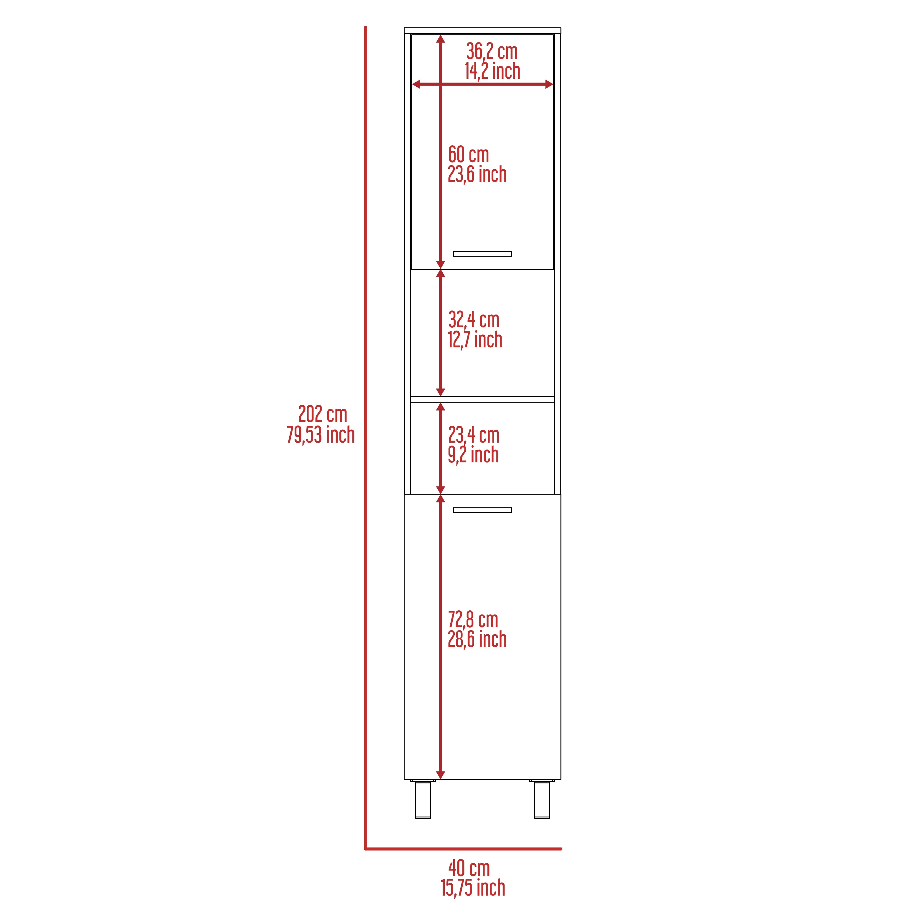 The Ikaria Kitchen Pantry is a kitchen organization station that frees up valuable counter and cabinet space, holding your microwave, coffee maker, and other small appliances. It features a 79" high pantry, two open shelves, a bottom cabinet with two interior shelves, top cabinet with 23" height X 13.7 " depth X 15.5 width" dimensions. Designed with elegant Black Wengue, White manufactured Wood finish.
