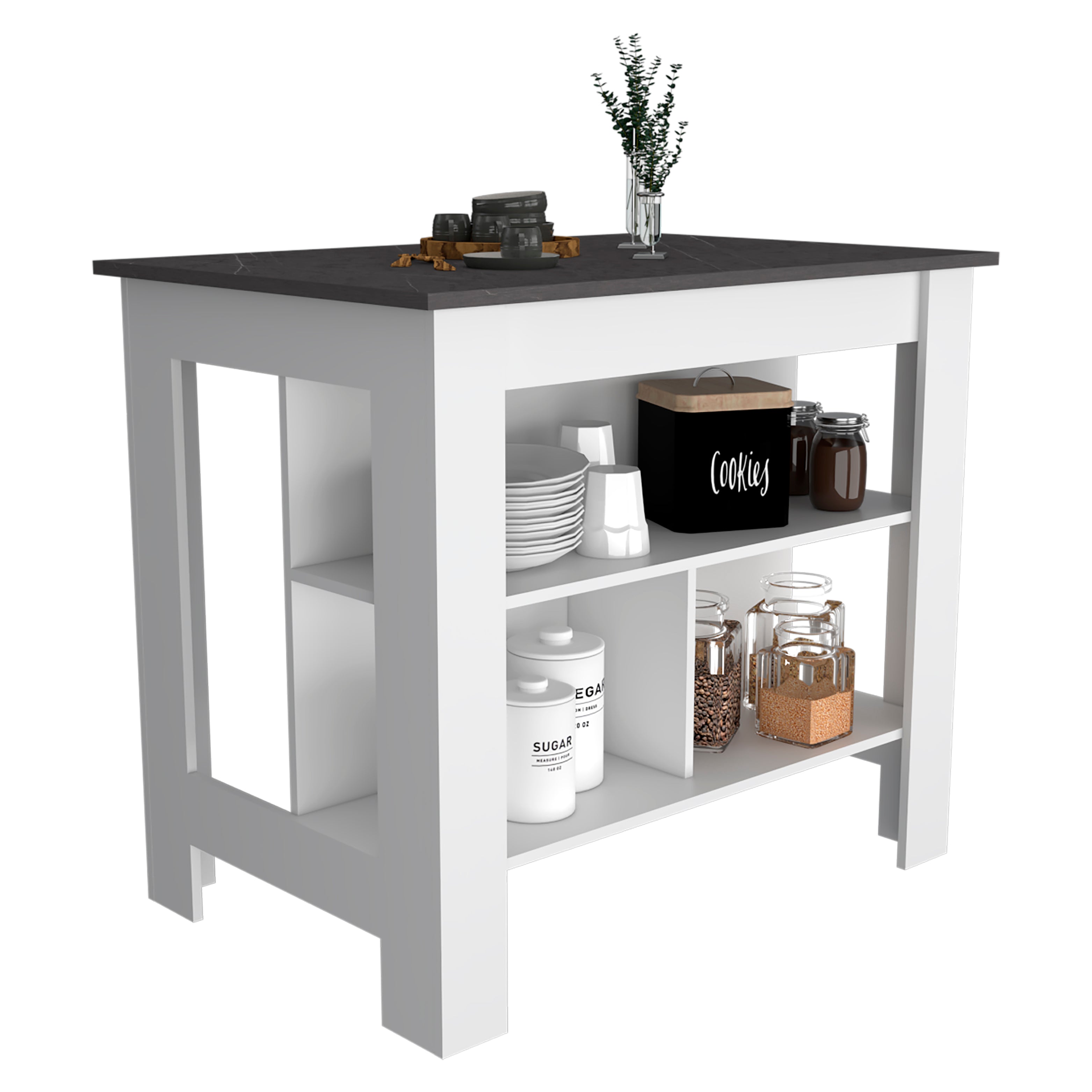 Delos Kitchen Island, kitchen table 35" H, Four Legs, Three Open Storage Shelves