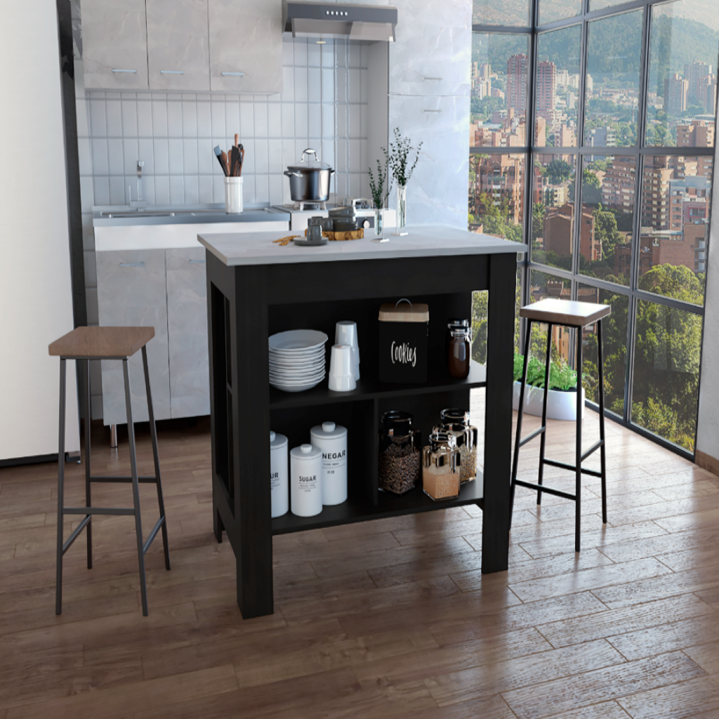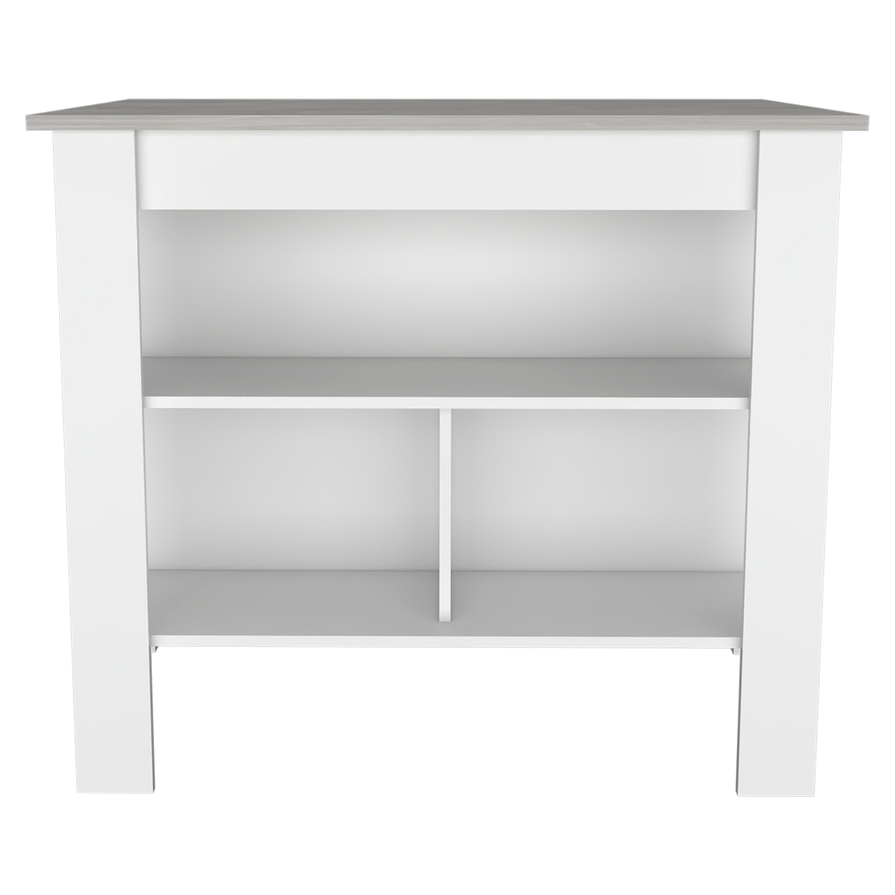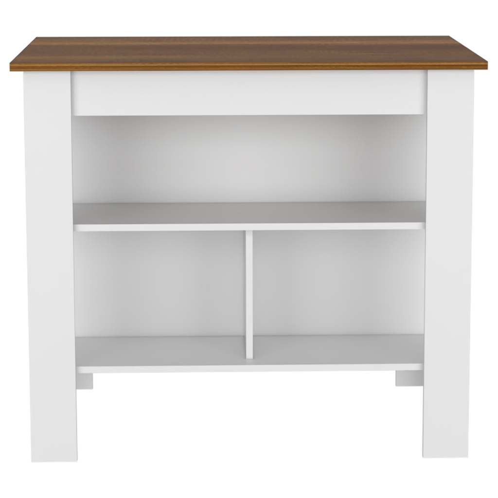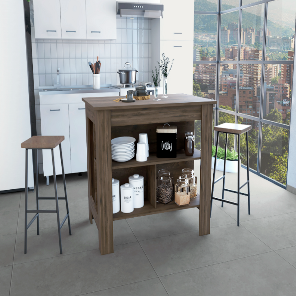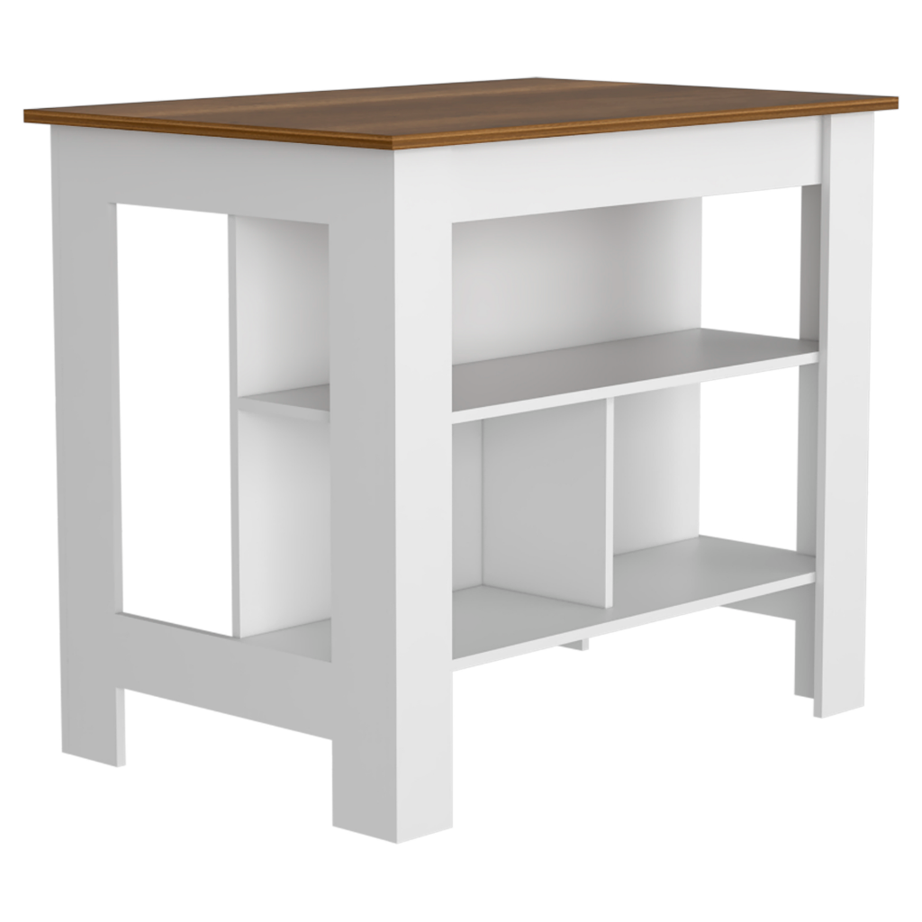 Delos Kitchen Island, kitchen table 35" H, Four Legs, Three Open Storage Shelves
