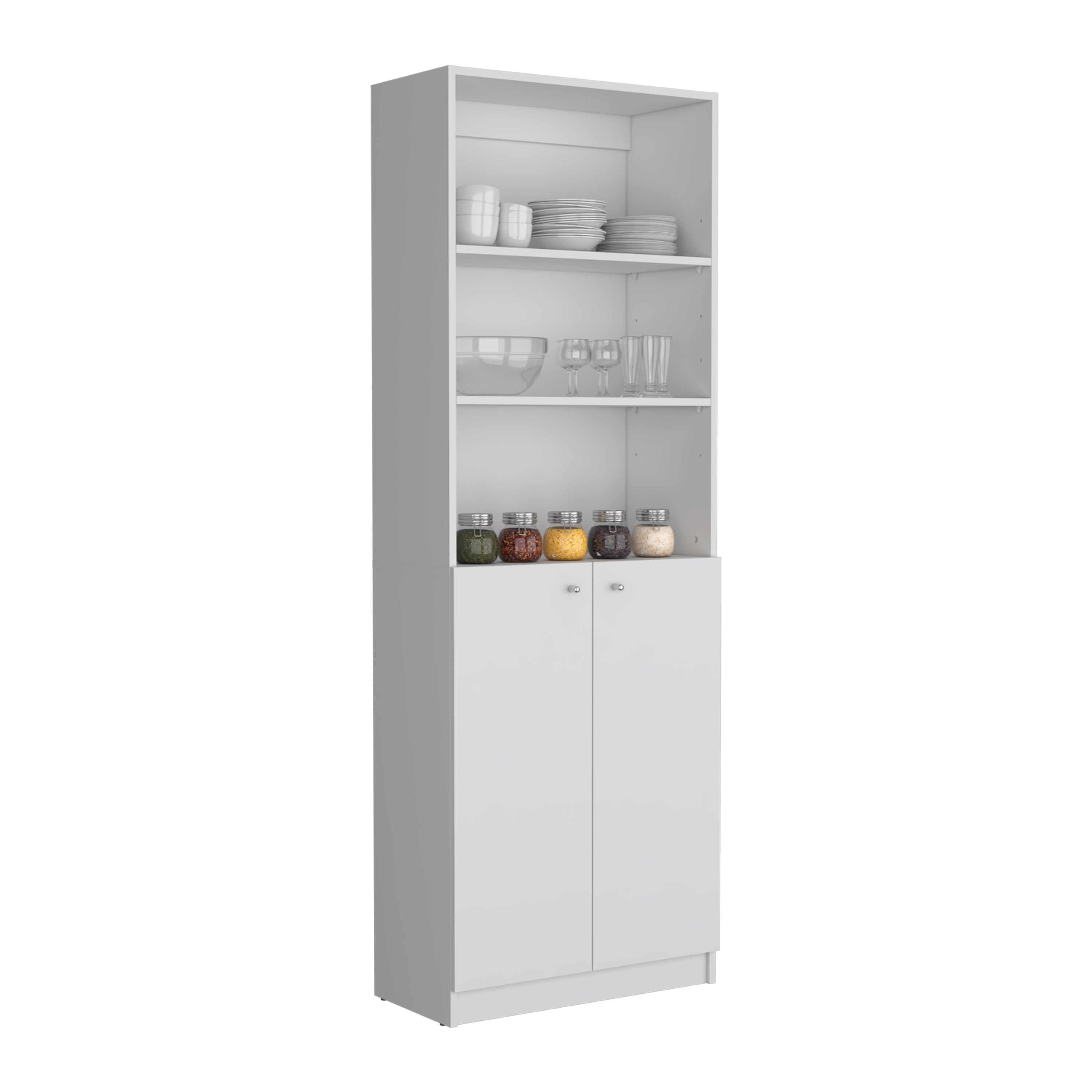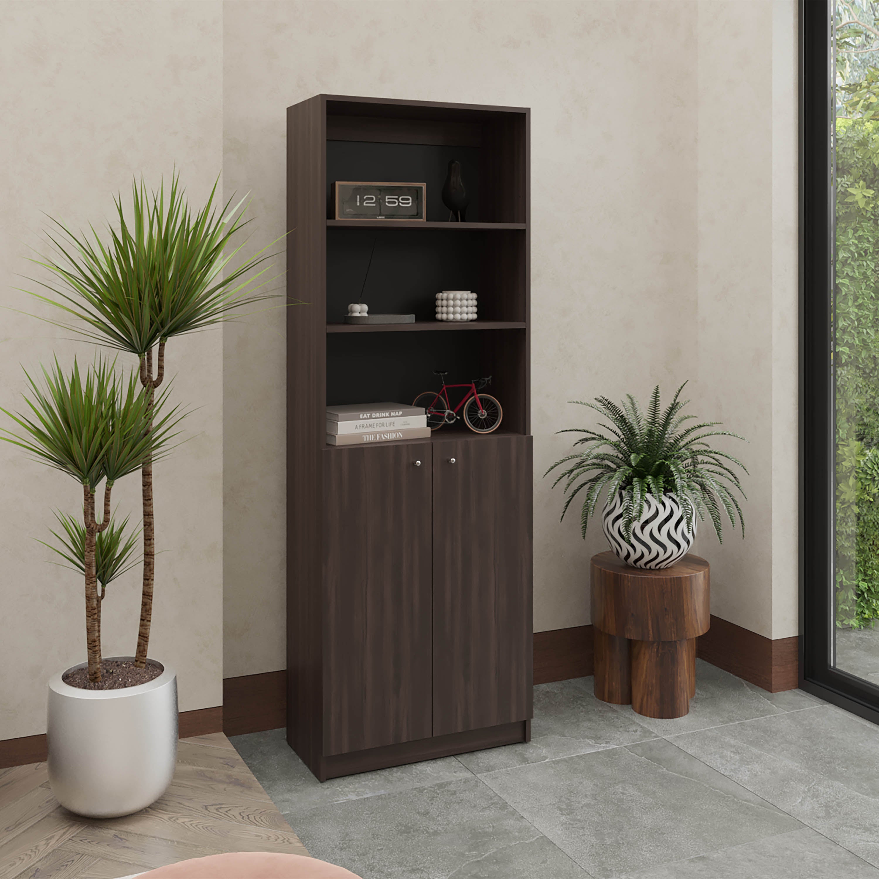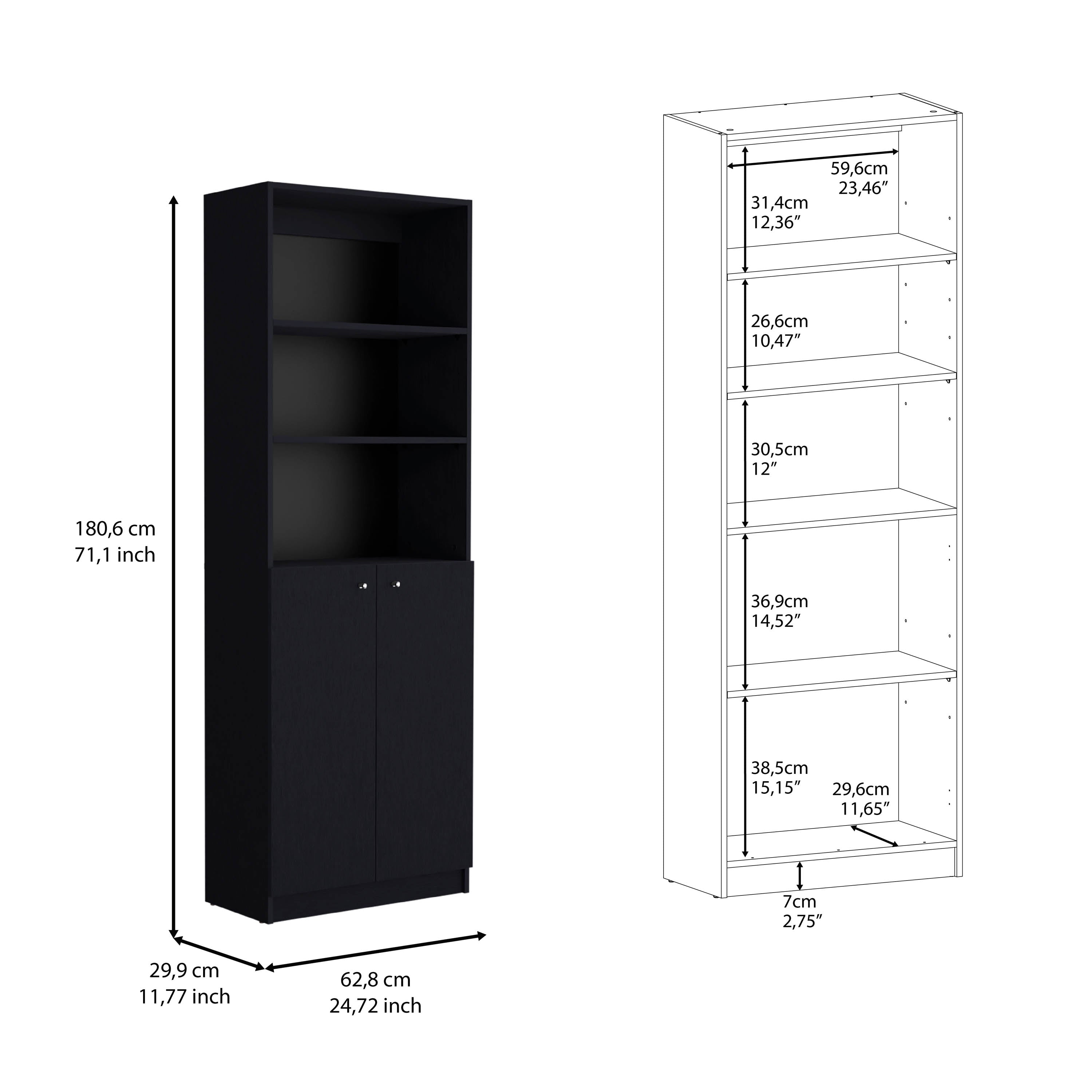 Utilize the Vinton 2-Door Bookcase to enhance your living area. It offers organized storage in a sleek design with two enclosed shelves (14.5"H x 15.1"H x 23.4"W x 11.6"D) and three open shelves (12"H x 10.4"H x 23.4"W x 11.6"D). This bookcase, which comes in black, white, or matt/gray finishes, perfectly combines contemporary design with practicality. Ideal for décor, books, and other things.