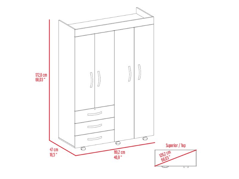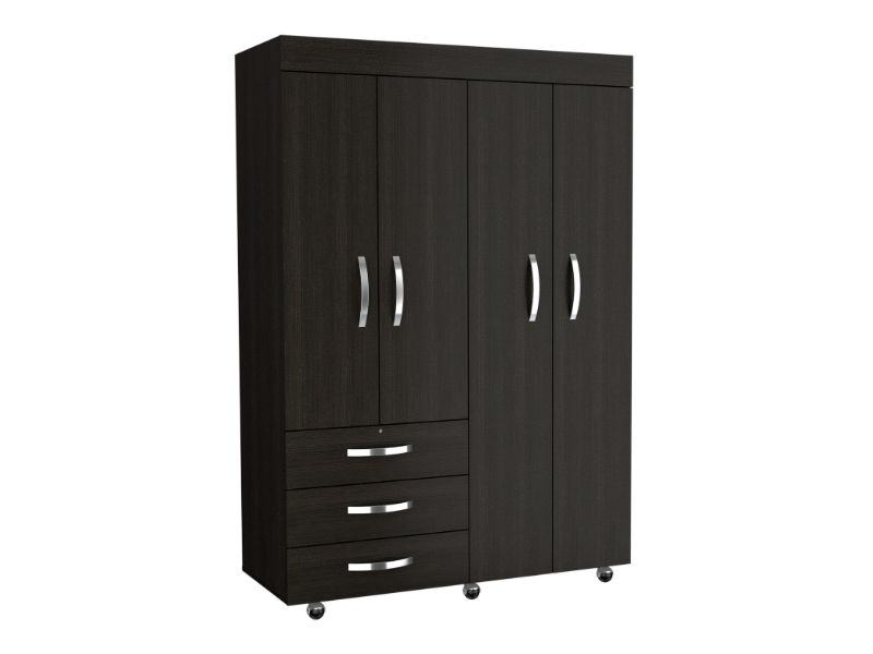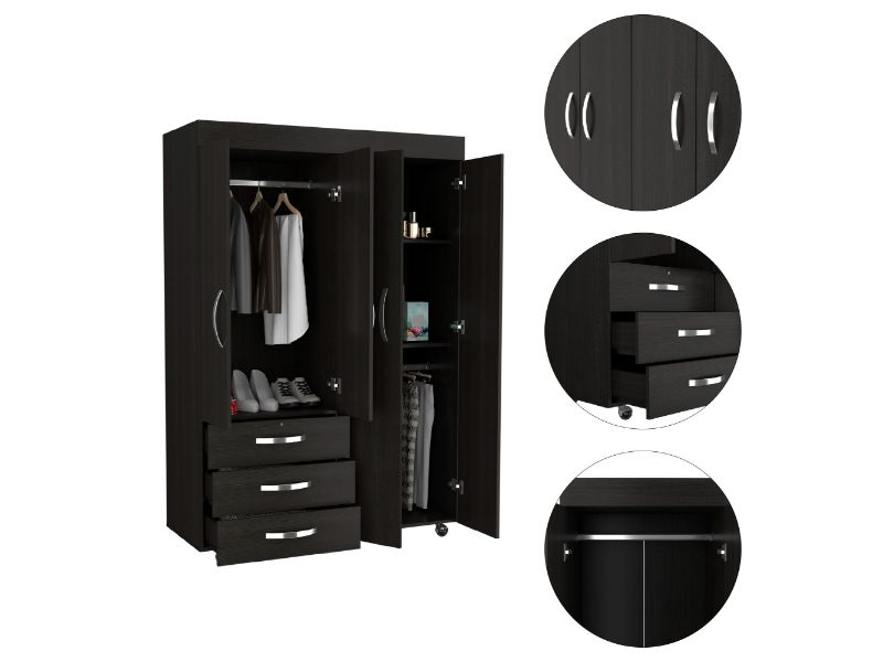 On the left side, a two-door cabinet with an interior hanging rod will give you great space to hang your clothing. On the right side, another tall two-door cabinet conceals two shelves (13.4" High and 17" High). At the bottom of the cabinet, a second space with a hanging rod expands your options. Last, Six casters with a locking mechanism will give the product mobility and provide you with the flexibility to place it easily wherever you want it in your room. Designed with elegant black wengue manufactured wood finish.