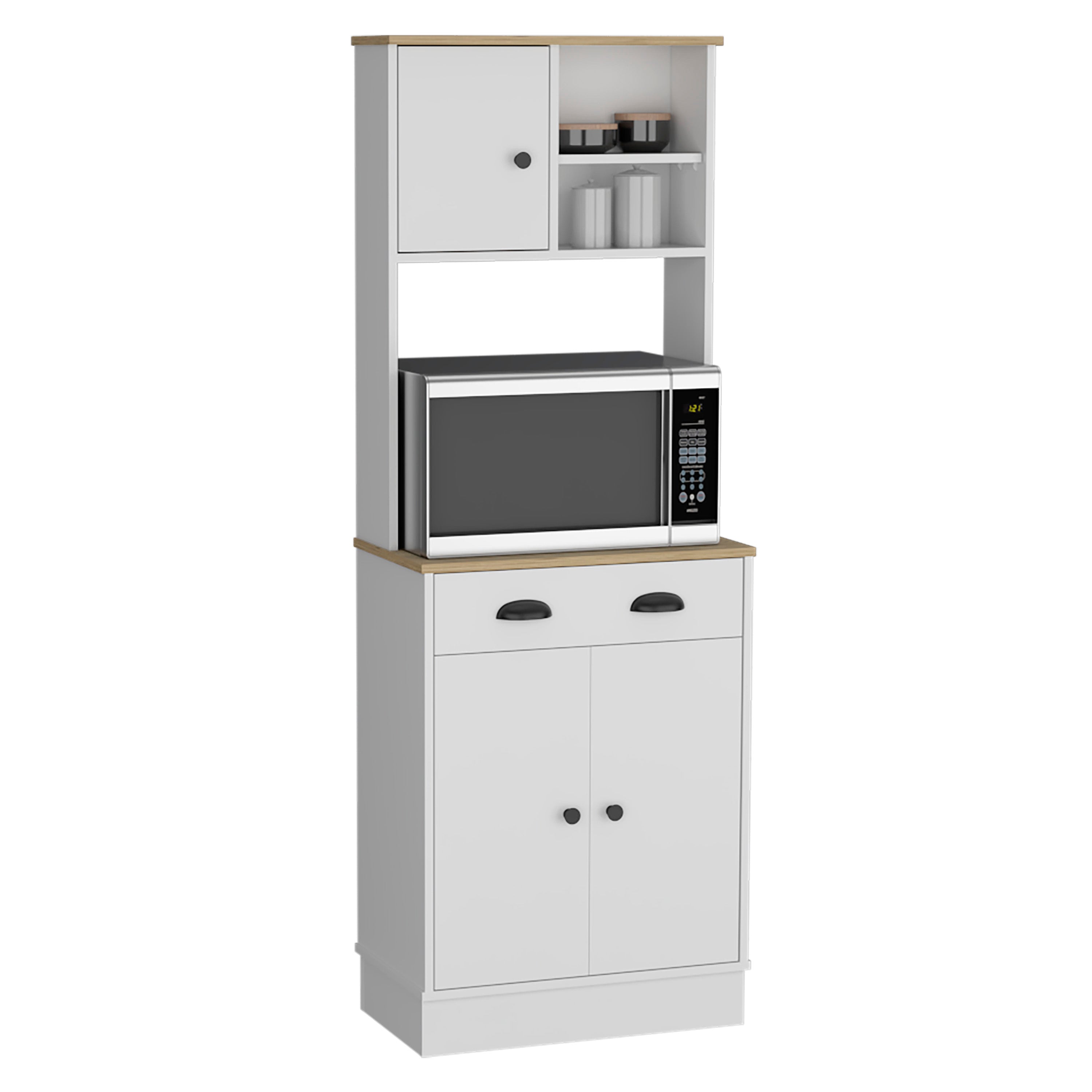 This pantry cabinet comes with a spacious top surface (13,7" W X 23,6" D) that is perfect for holding your microwave and other electronics, along with an ample drawer that offers convenient storage for your utensils, linens, or other small items. The upper part of the cabinet also features a single-door cabinet with open storage, providing an excellent place for displaying your favorite dishes or decorative items.