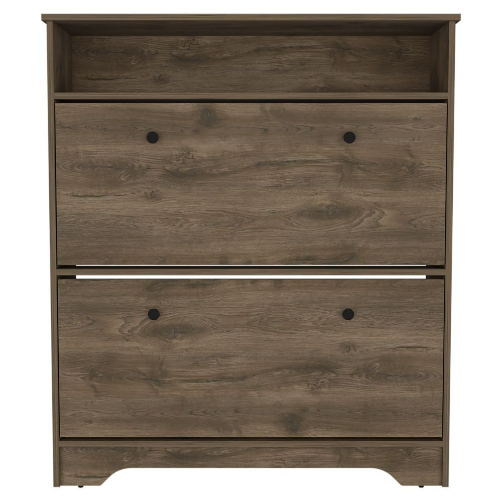 Wayne Shoe Rack, you'll be able to find a designated spot for every one of your shoes with this chic and functional shoe rack. With enough space to store up to 12 pairs of shoes with its two ample flexible shelves (37,4'W X 15,4''H), this rack is perfect for anyone who struggles with clutter. It also includes one shelf (37,4''W X 6,6''H) and an ample Superior Top (39,3''W X 10,6' 'D), the contemporary design means it'll look great in any room! Designed with elegant dark Brown and light oak-white manufactured wood finish.