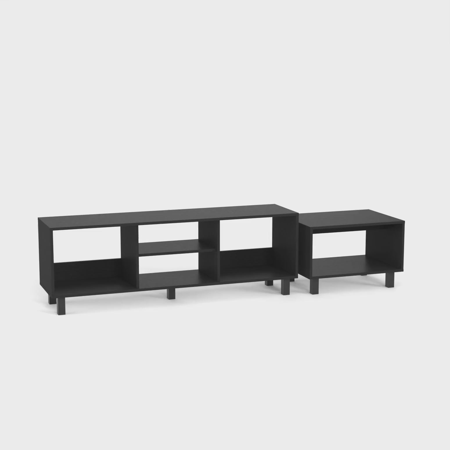 Transform your living space with the Carter 2 Piece Living Room Set, a perfect harmony of style and function. This set features a TV Rack and Coffee Table in a sophisticated black manufactured wood finish. The TV Rack is designed with open storage (two side shelves 17.5"W x 13.5"H and two central shelves 6.4"H x 17.5"W), offering ample space for your entertainment needs on a generous top surface (55.2"W x 13.7"D). The Coffee Table complements the look with its open shelf (10.6"H x 22.3"W) and a spacious top (23.3"W x 17.7"D). Both pieces rest on sturdy steel legs, bringing your home a modern, industrial vibe.