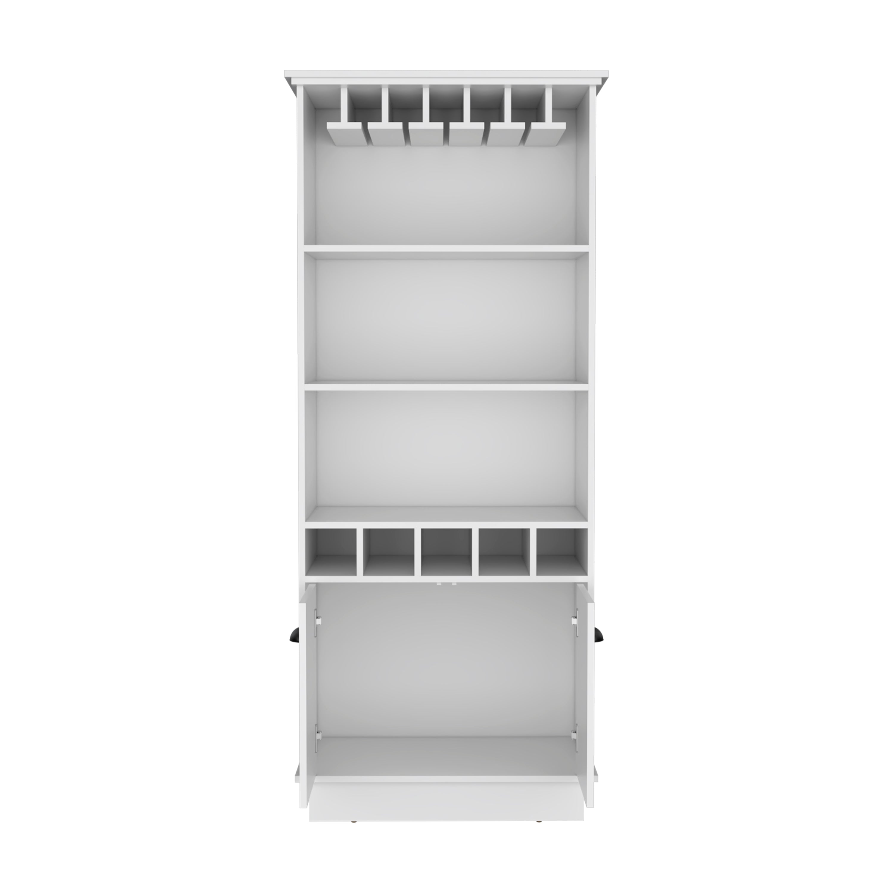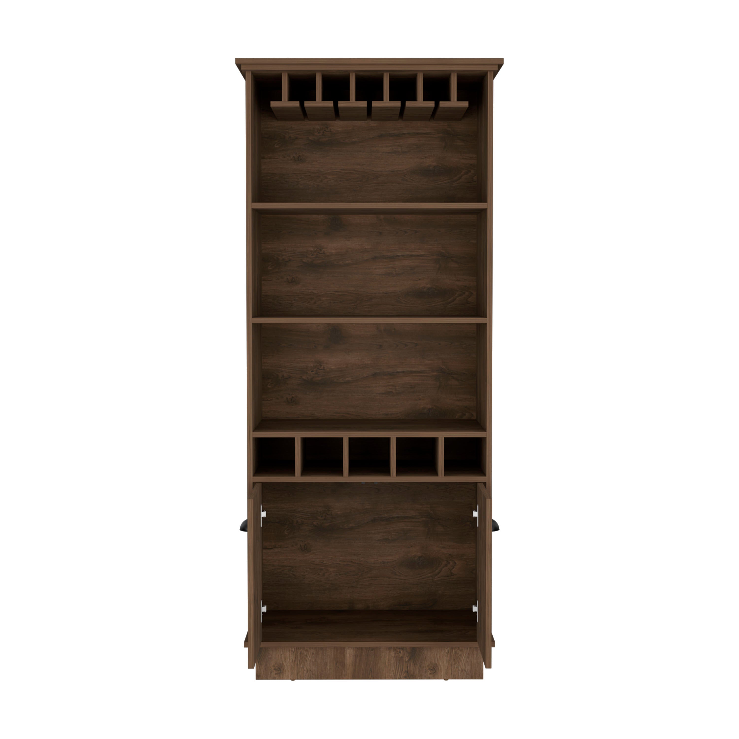Elon Bar Cabinet with Wine Rack, Upper Glass Cabinet, three Open Storage Shelves and One Cabinet