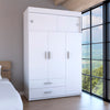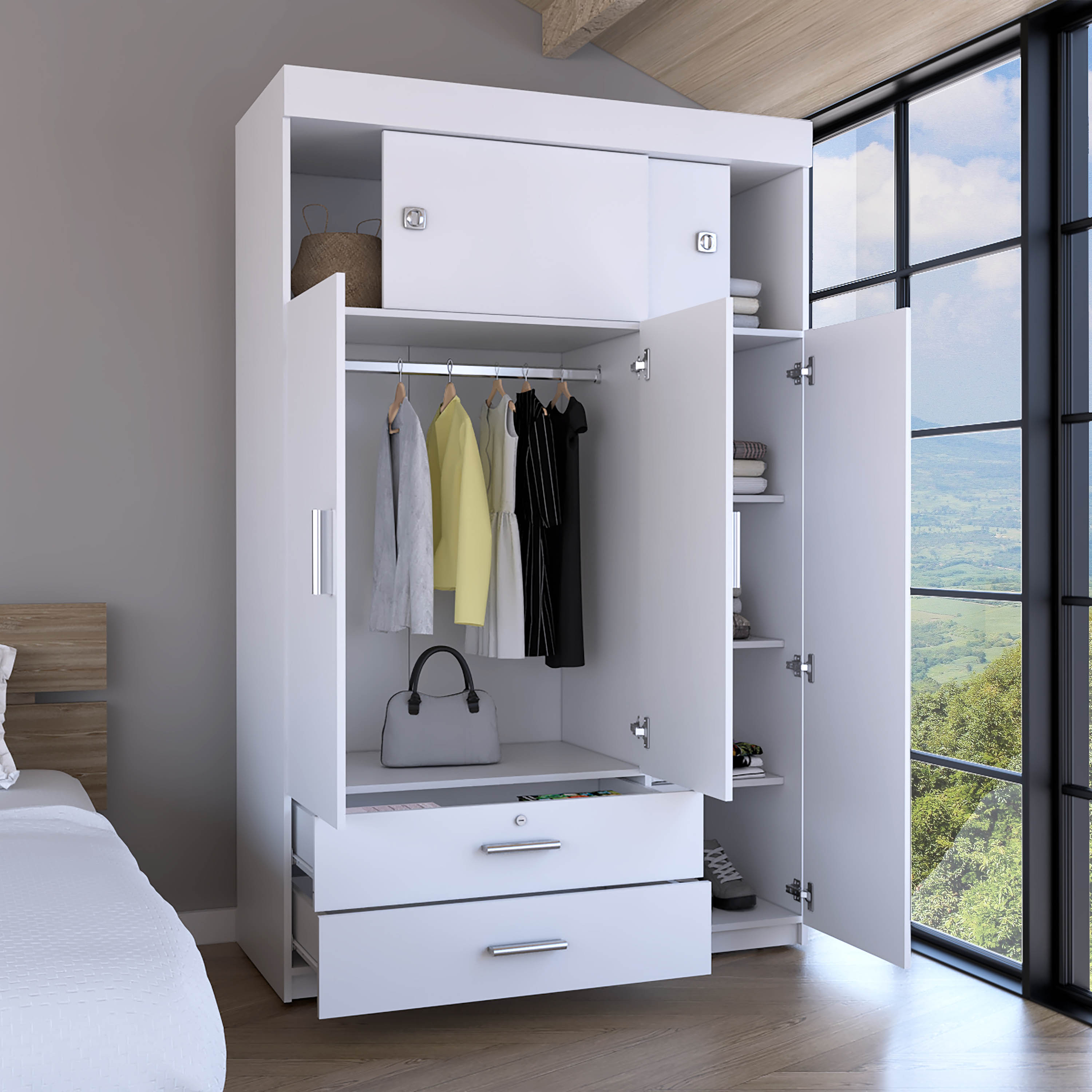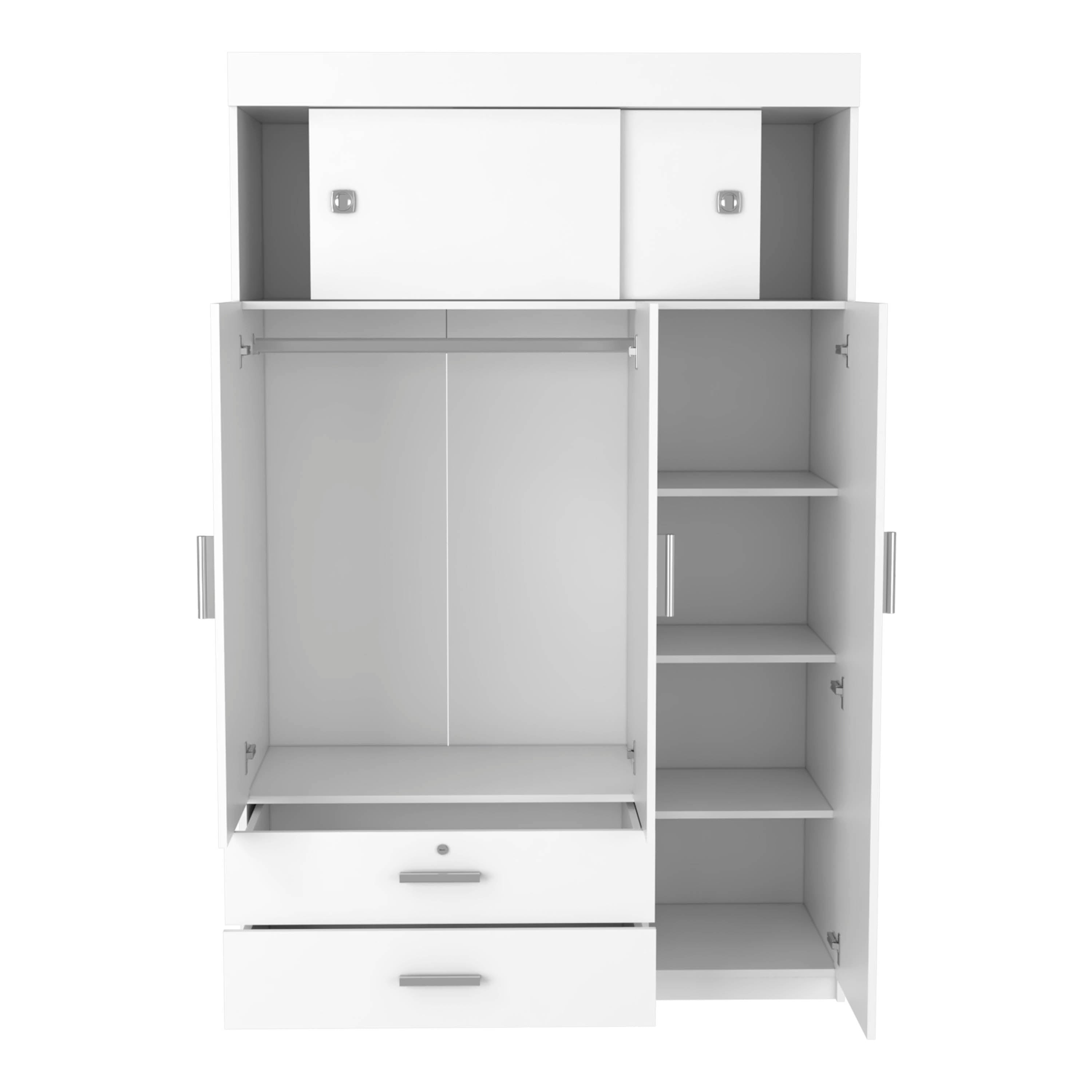 The Indiana Armoire offers the best way to organize your bedroom, standing at 73 “tall it features great functionality when it comes to extra storage and a modern design to fit any home decor. Two spacious and extra-wide drawers are perfect for underwear or small accessories. On the left side, above the drawers, a two-door wardrobe with an interior hanging rod gives you ample space to hang your clothes. On the right side, a tall one-door cabinet conceals four shelves, great for shirts, bags, lotions, or perfumes. Finally, at the top, you will get a spacious cabinet with two sliding doors for access to your things. All metal hardware for smooth running and quality of your drawers, and beautiful, modern door pulls are a great touch to this product. This product is made of high-quality Manufactured Wood/Particle board.