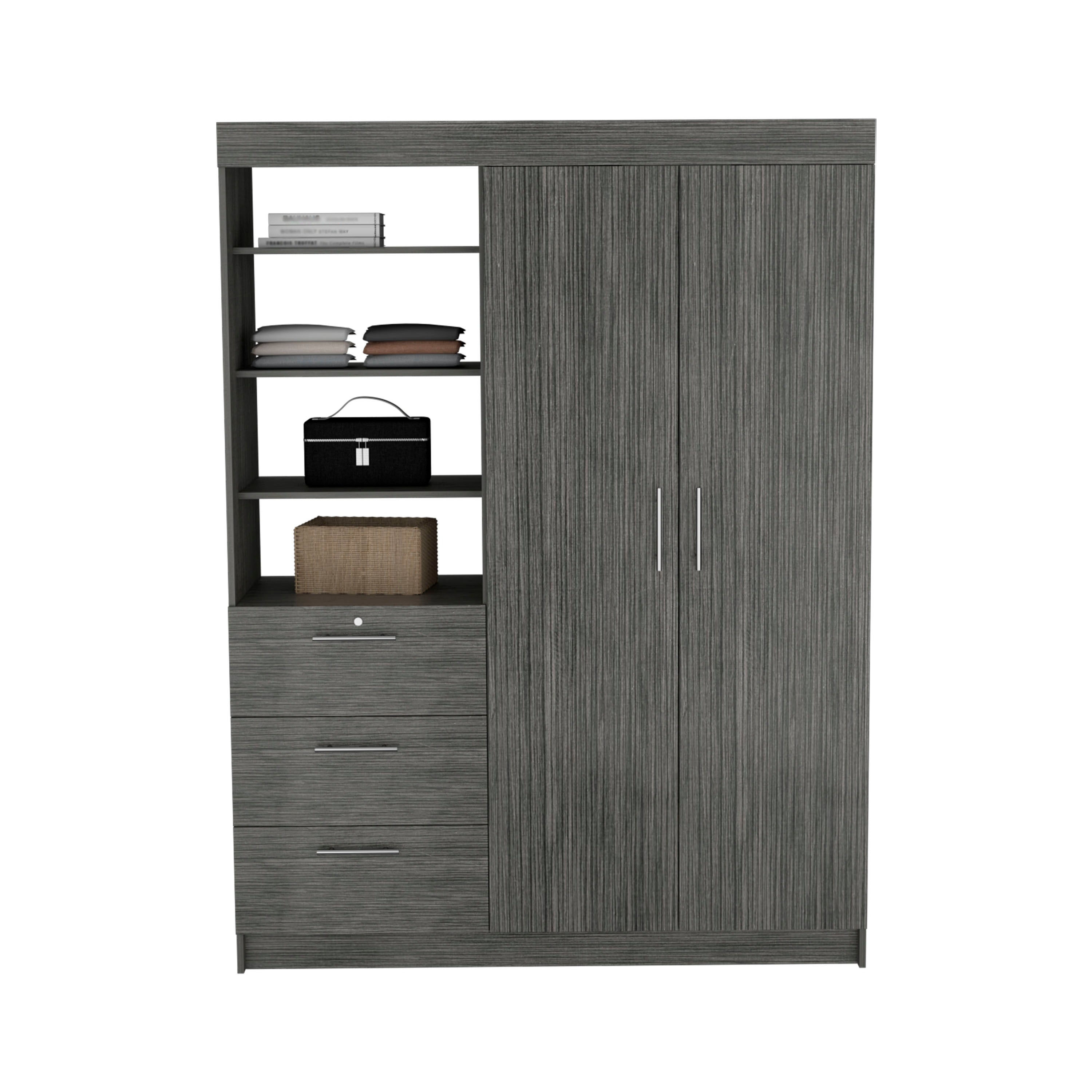 Looking for an armoire with plenty of storage space? Here's the Laurel 3-Tier Shelf and Drawers Armoire! The three tiers are perfect for displaying your favorite decor or essentials, and the three spacious drawers provide plenty of room to store clothes, accessories, or anything else you need. Plus, the two-turn armoire with sturdy metal handles makes it easy to access your belongings. Hang your clothes in an orderly fashion on the two hanging rods inside, and enjoy having everything you need all in one place.