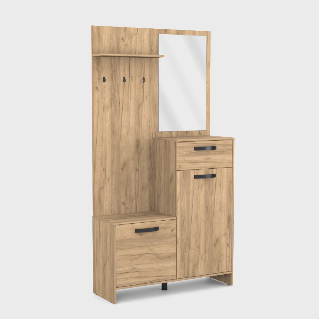 The Olpe Hall Tree is a functional and stylish addition to your living space, designed to provide practical storage and organization. Featurgin two doors, one drawer, a shelf, and a built-in mirror, this hall tree helps you keep your entryway neat while adding a touch of elegance. Its versatile design makes it perfect for any living room or hallway. Dimensions: