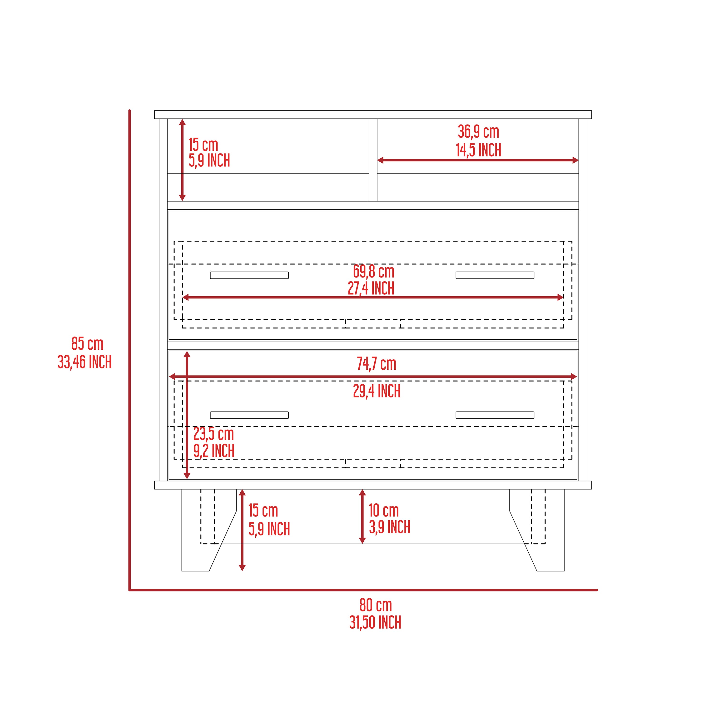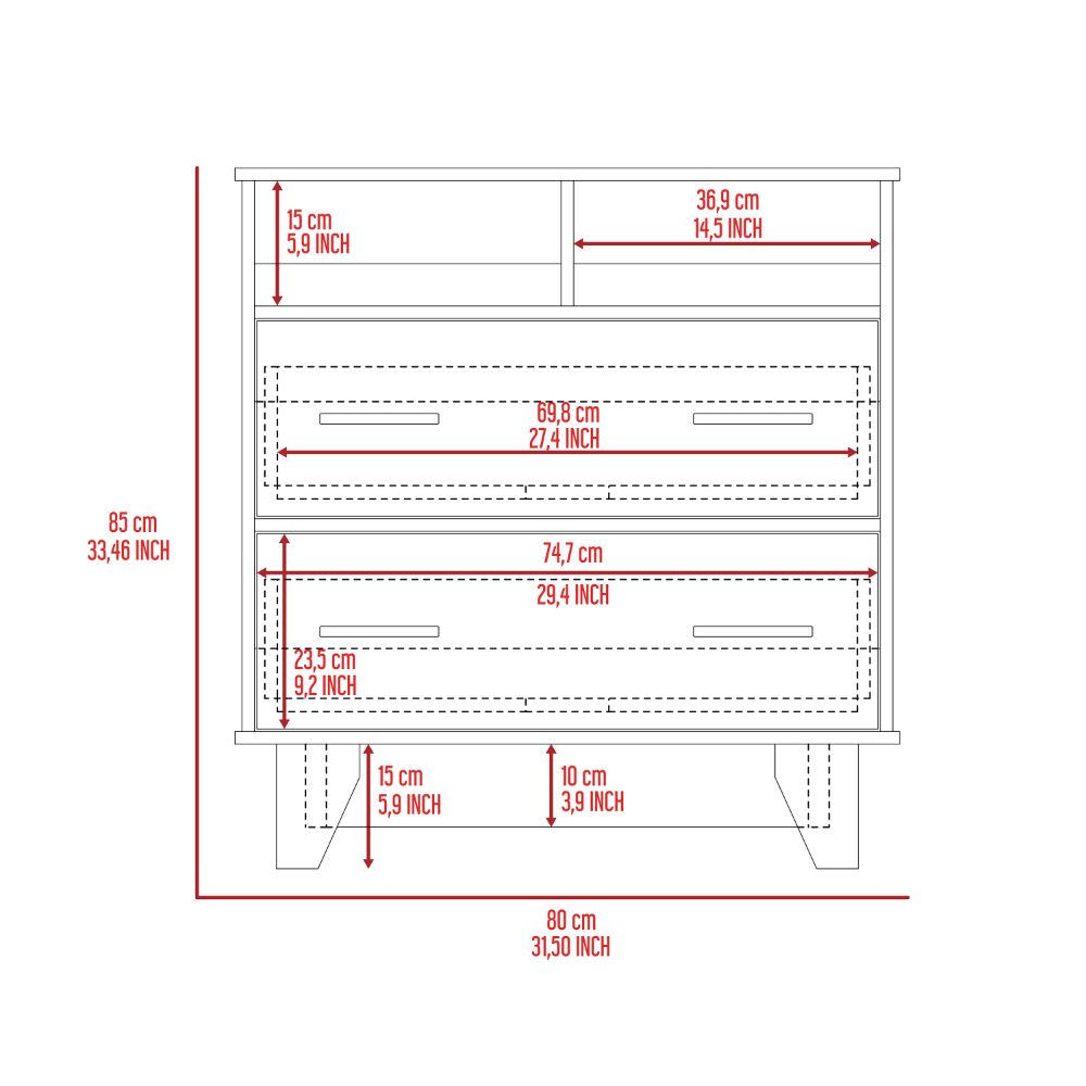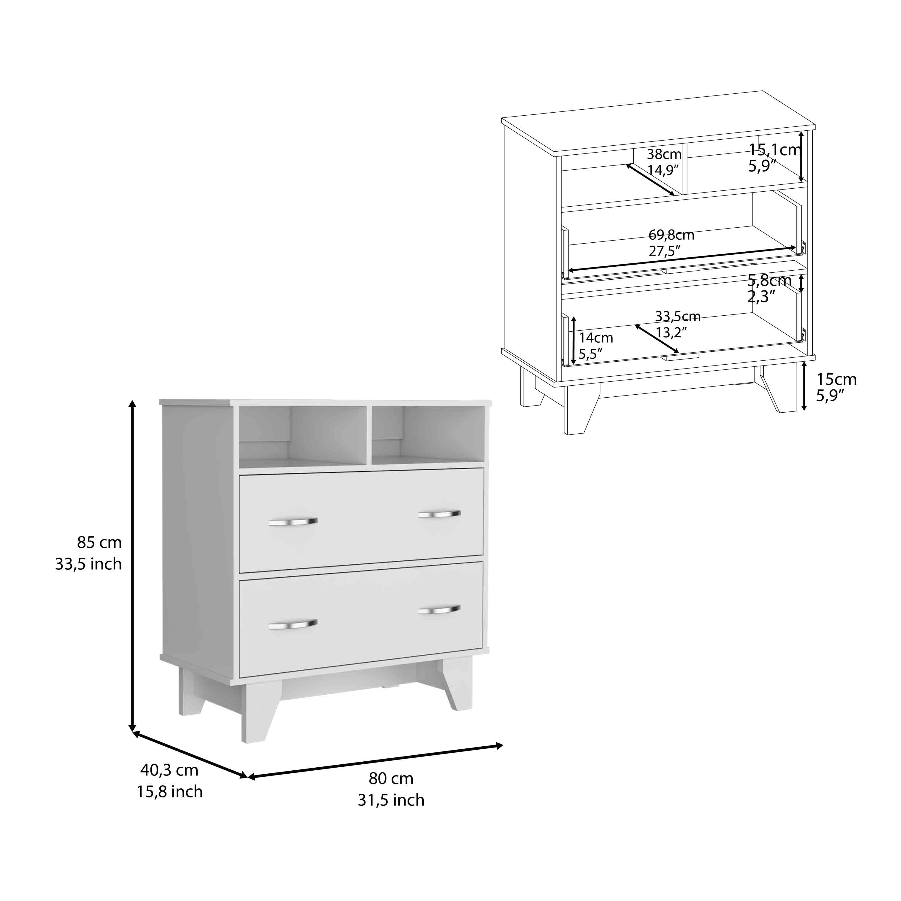 Stamford Two Drawer Dresser is an excellent choice for anyone looking for a stylish and functional piece of furniture. The white particleboard finish gives this dresser a contemporary look that will complement any room. And the two spacious drawers (29,4''W X 27,4''W X 9,2''H) provide plenty of storage space for clothes, accessories, or anything else you need to keep handy; its Superior Top is ideal to expose your favorite decor (31,50''W X 15,75''D). So don't wait - order your Stamford Double Drawer Dresser today! Designed with elegant black wengue, light gray and White manufactured wood finish