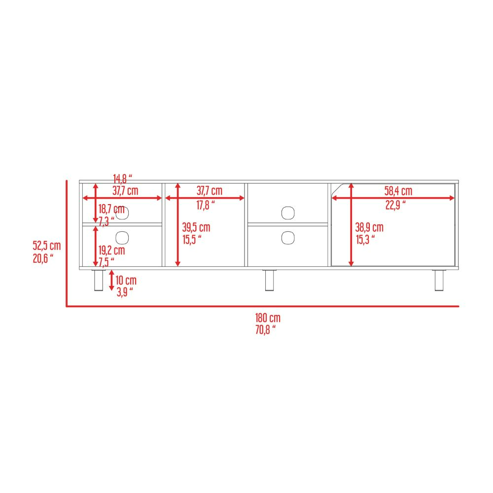 Conquest TV Stand is the perfect way to organize your new TV. The modern design and functionality of the drawers and shelves make them ideal for any environment. Plus, the back holes on the inside keep your cables orderly. Its size (20,6''H X 70,8'' W X 13,7' 'D) is perfect for any room, with an ample countertop (72.1'') and ideal four legs (3.9'‘) ***Objects and shelf are not included***. Designed with elegant Light Oak, White manufactured wood finish.