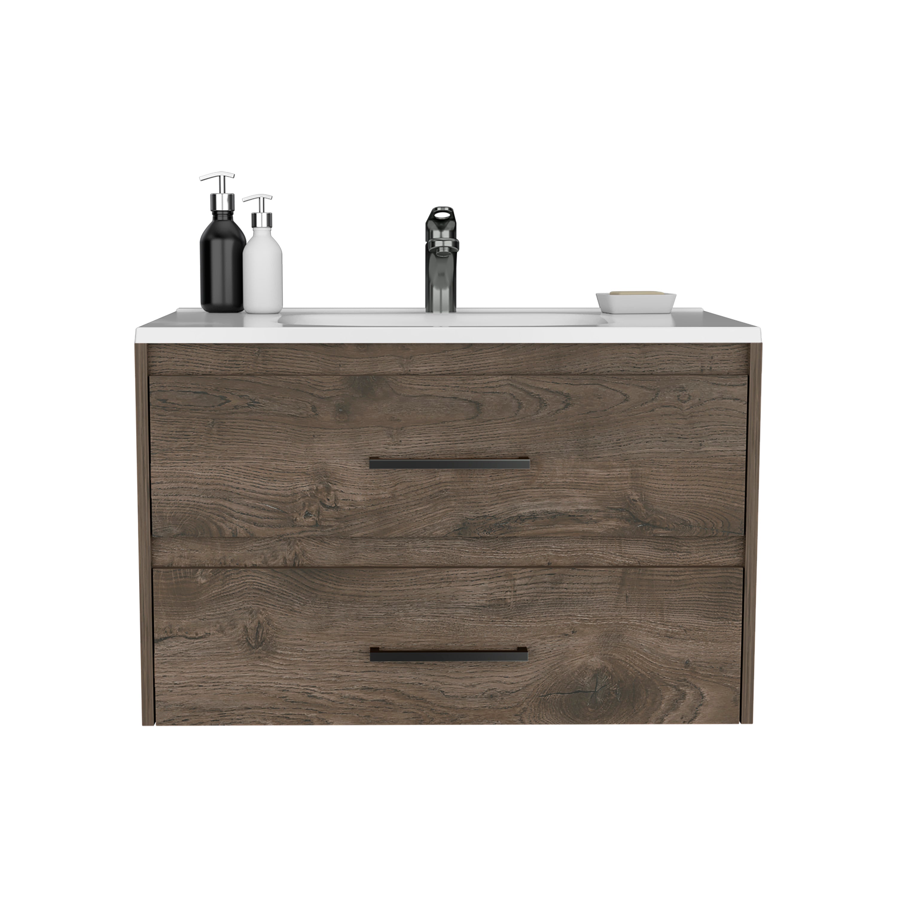 Upgrade your bathroom with the Cardova Floating Vanity Bathroom. This chic and modern vanity is designed to fit perfectly on any wall, providing ample storage space with its two drawers (31.7"W X 18.8"D) and handles. The sleek white/dark brown manufactured wood finish adds a touch of sophistication to your bathroom decor. This vanity also includes a stylish sink, but please note that the faucet is not included. Transform your bathroom into a spa-like retreat with the Cardova Floating Vanity Bathroom.